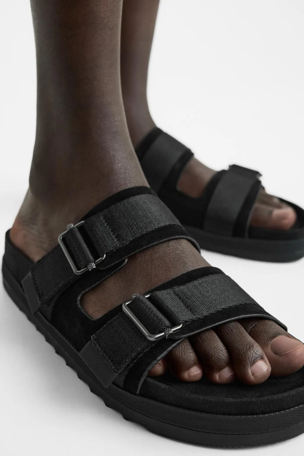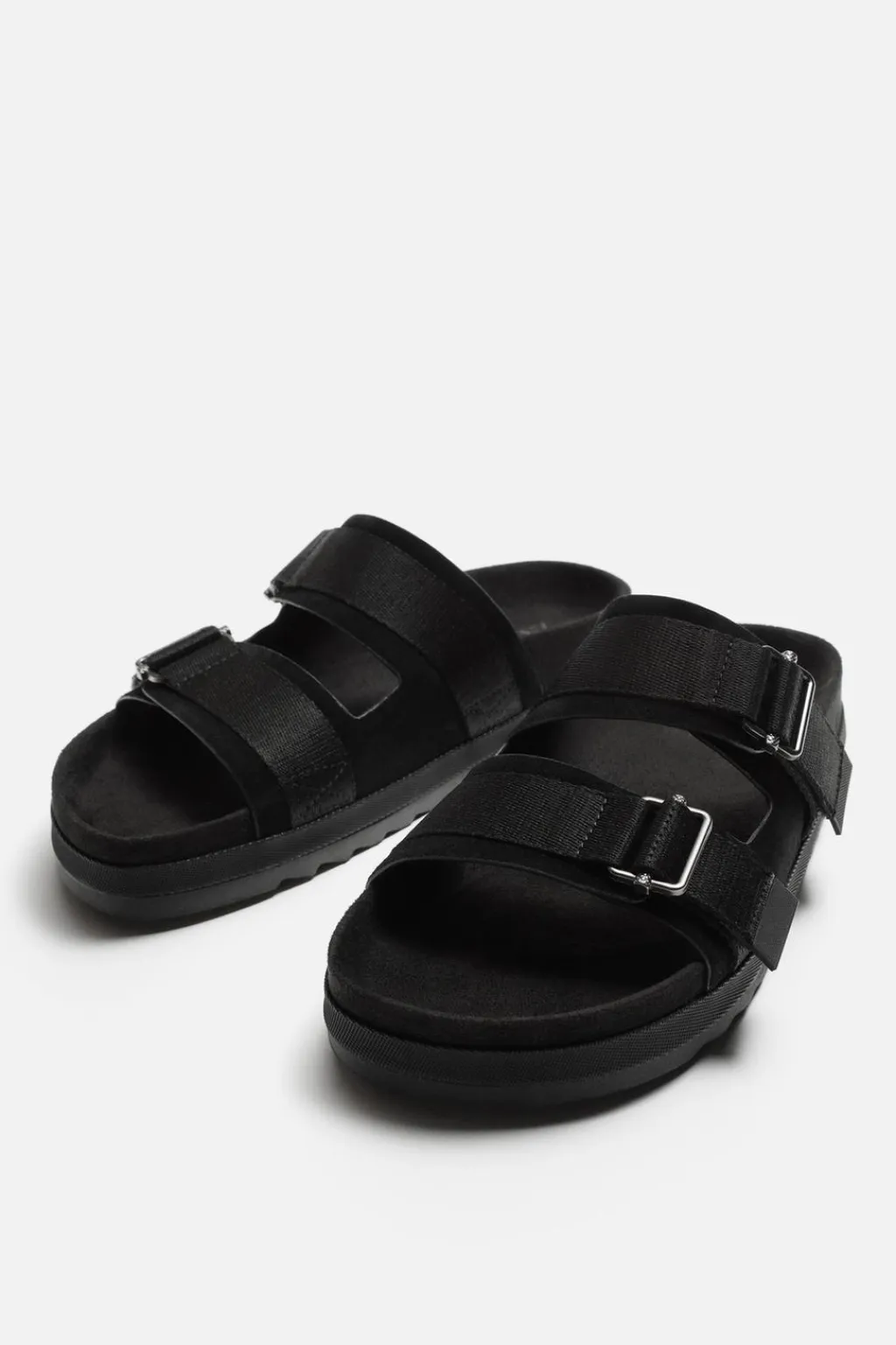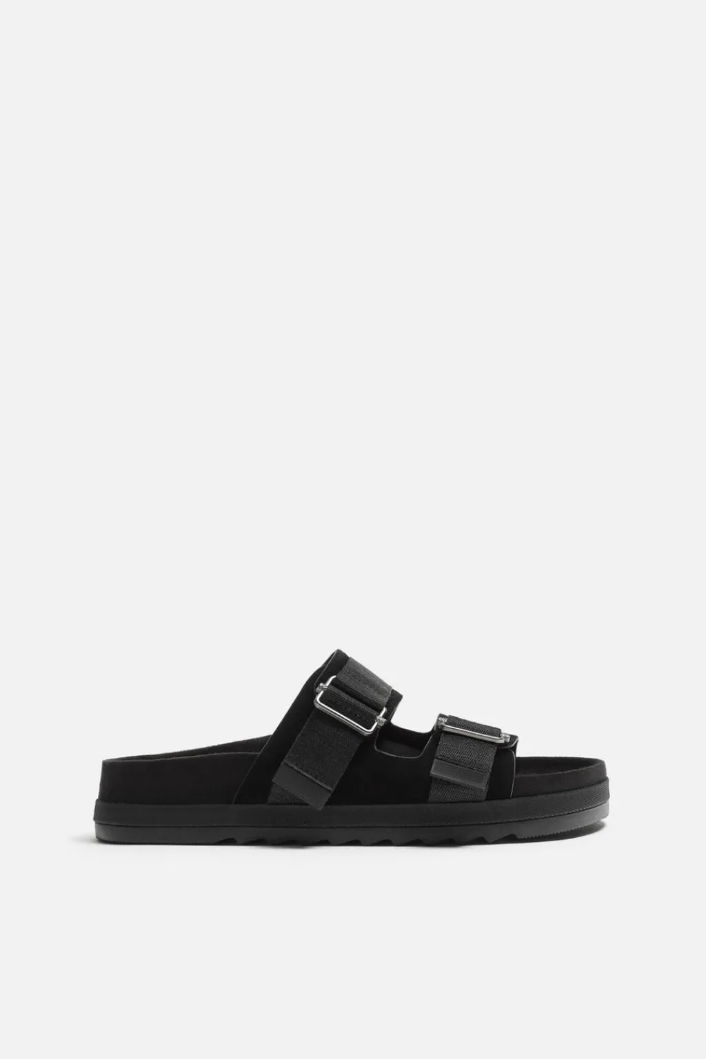 Sandalia tipo pala fabricada en piel con acabado serraje. Cuenta con dos tiras anchas en el empeine con sendos cierres de hebilla. Plantilla con horma anatómica. Piso con algo de volumen.