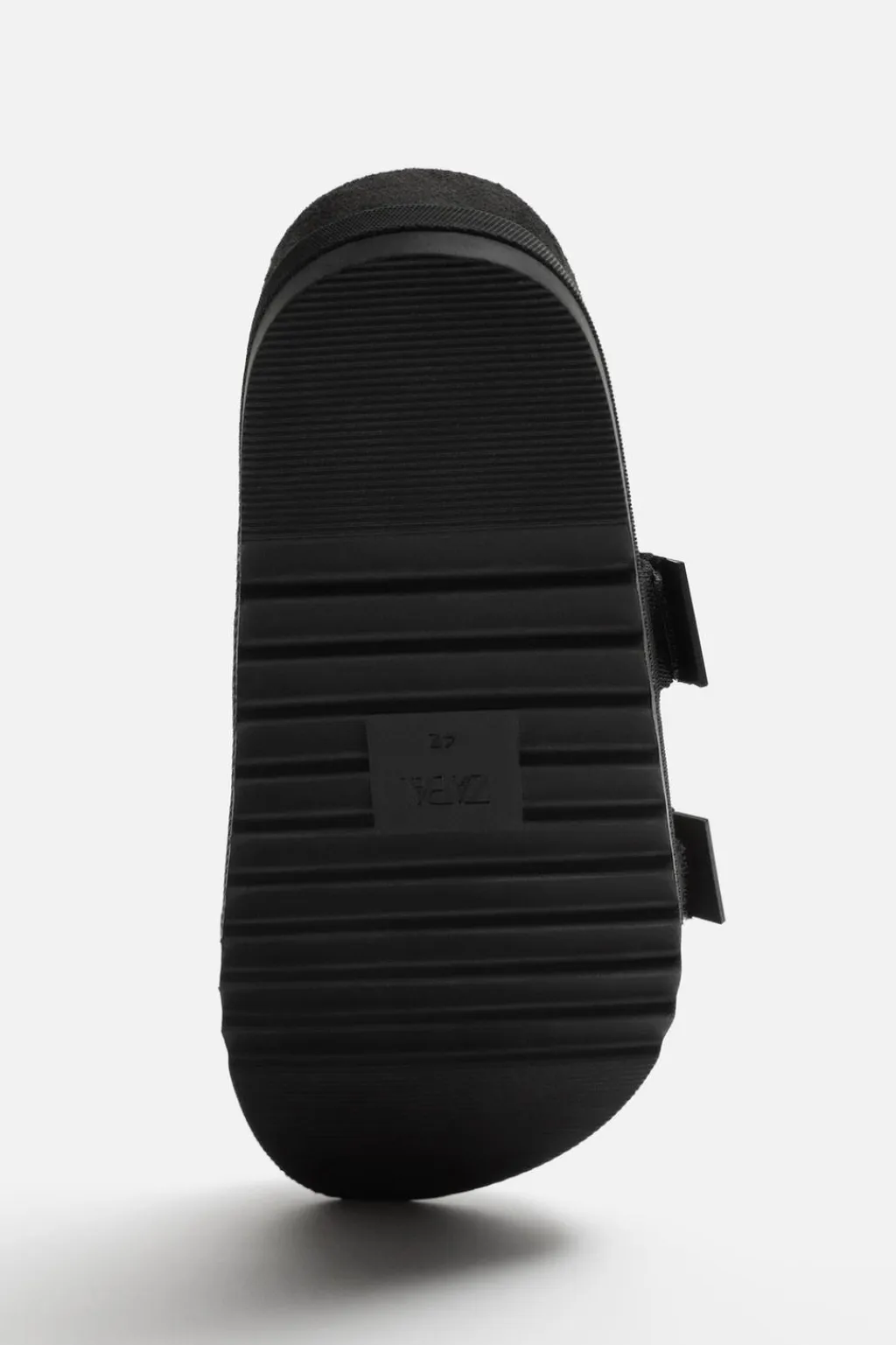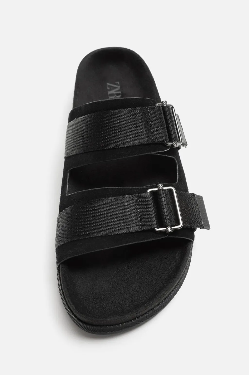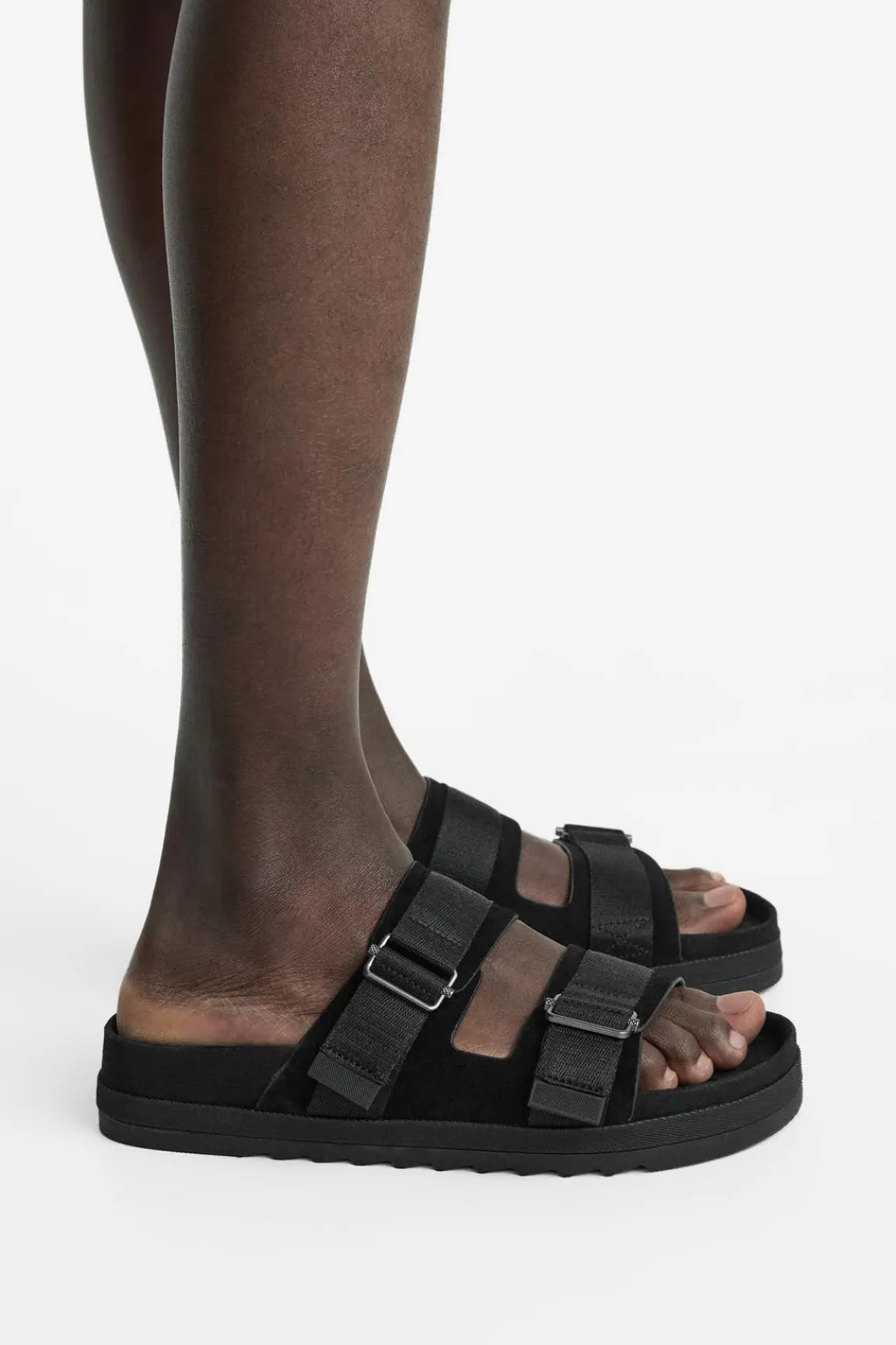 Sandalia tipo pala fabricada en piel con acabado serraje. Cuenta con dos tiras anchas en el empeine con sendos cierres de hebilla. Plantilla con horma anatómica. Piso con algo de volumen.