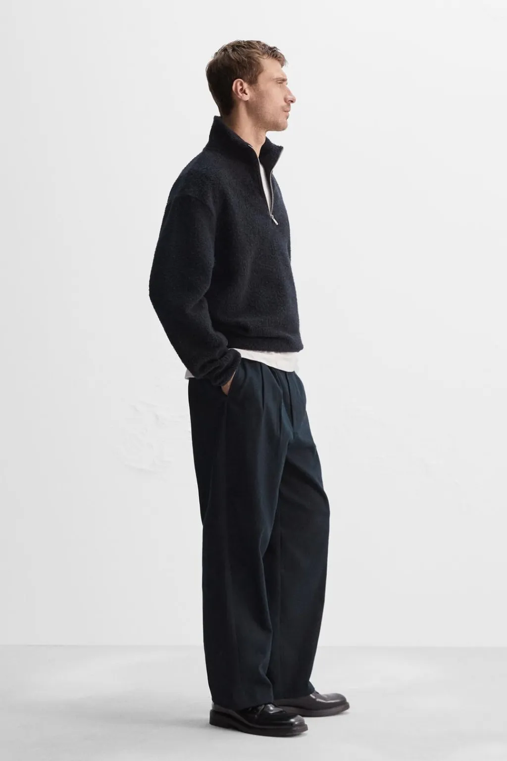 Sudadera relaxed fit confeccionada en tejido con textura bouclé. Cuello subido con cierre frontal de cremallera. Manga larga. Acabados con elástico.