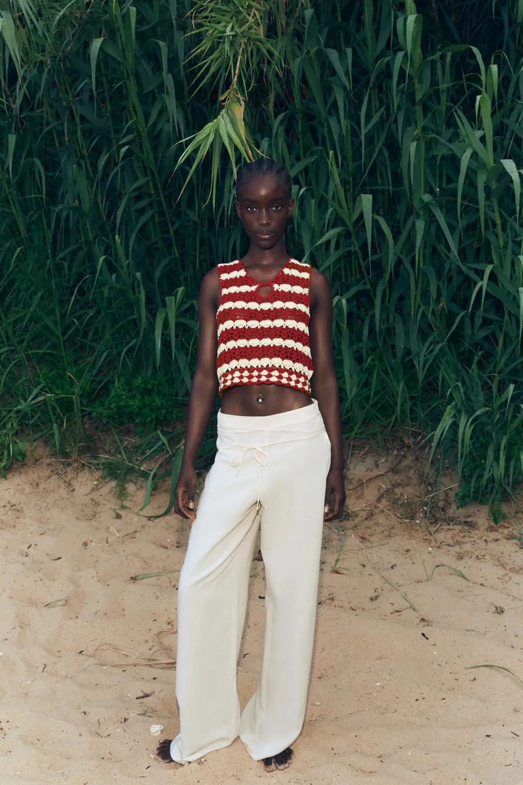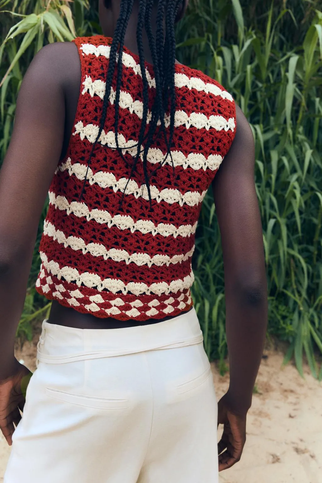Top de escote redondo con abertura delantera. Manga sisa.