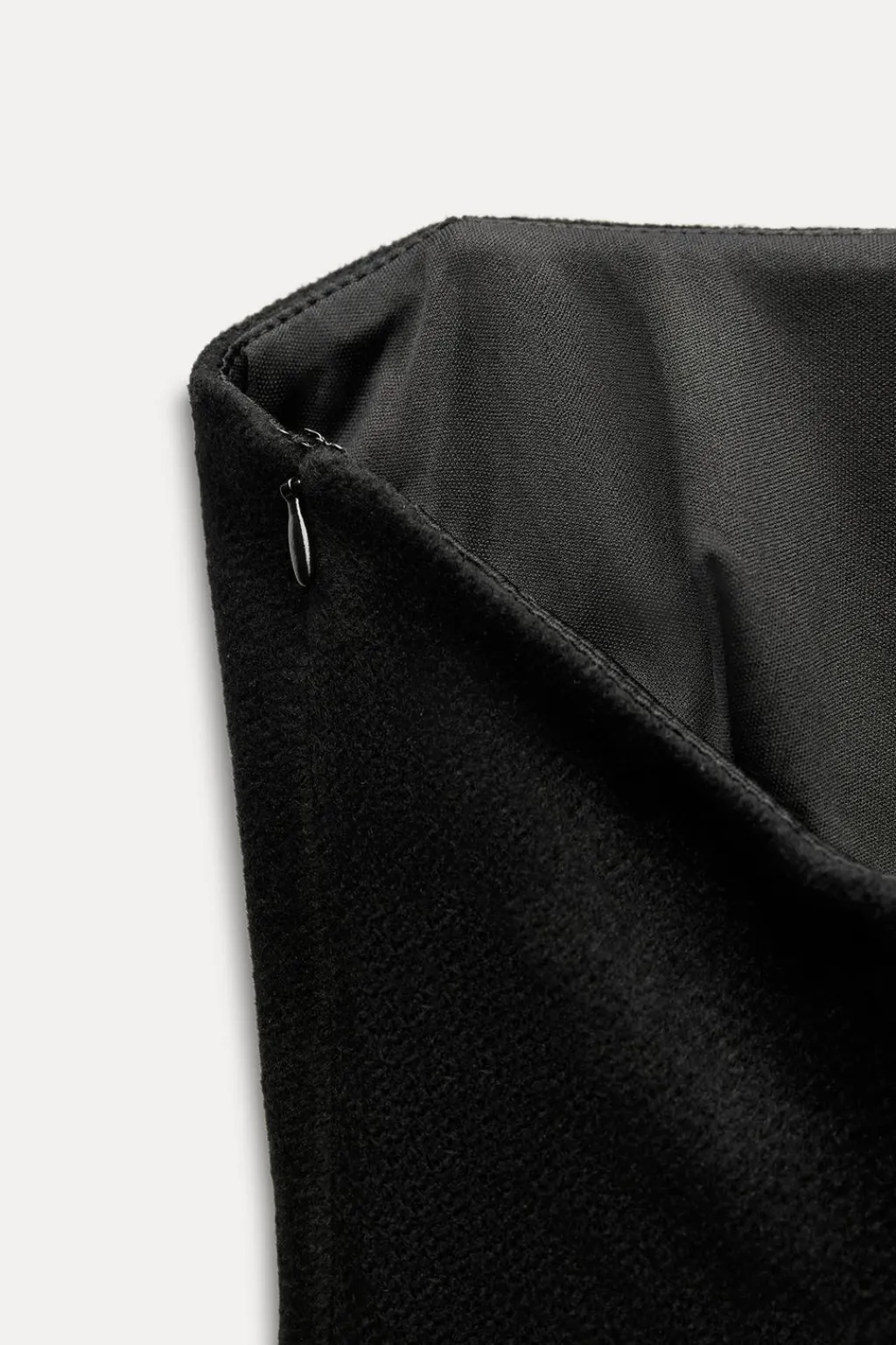 Topconfeccionado con lana. Escote recto y hombros descubiertos. Detalle de pliegues. Forro interior combinado. Cierre lateral con cremallera oculta en costura.
