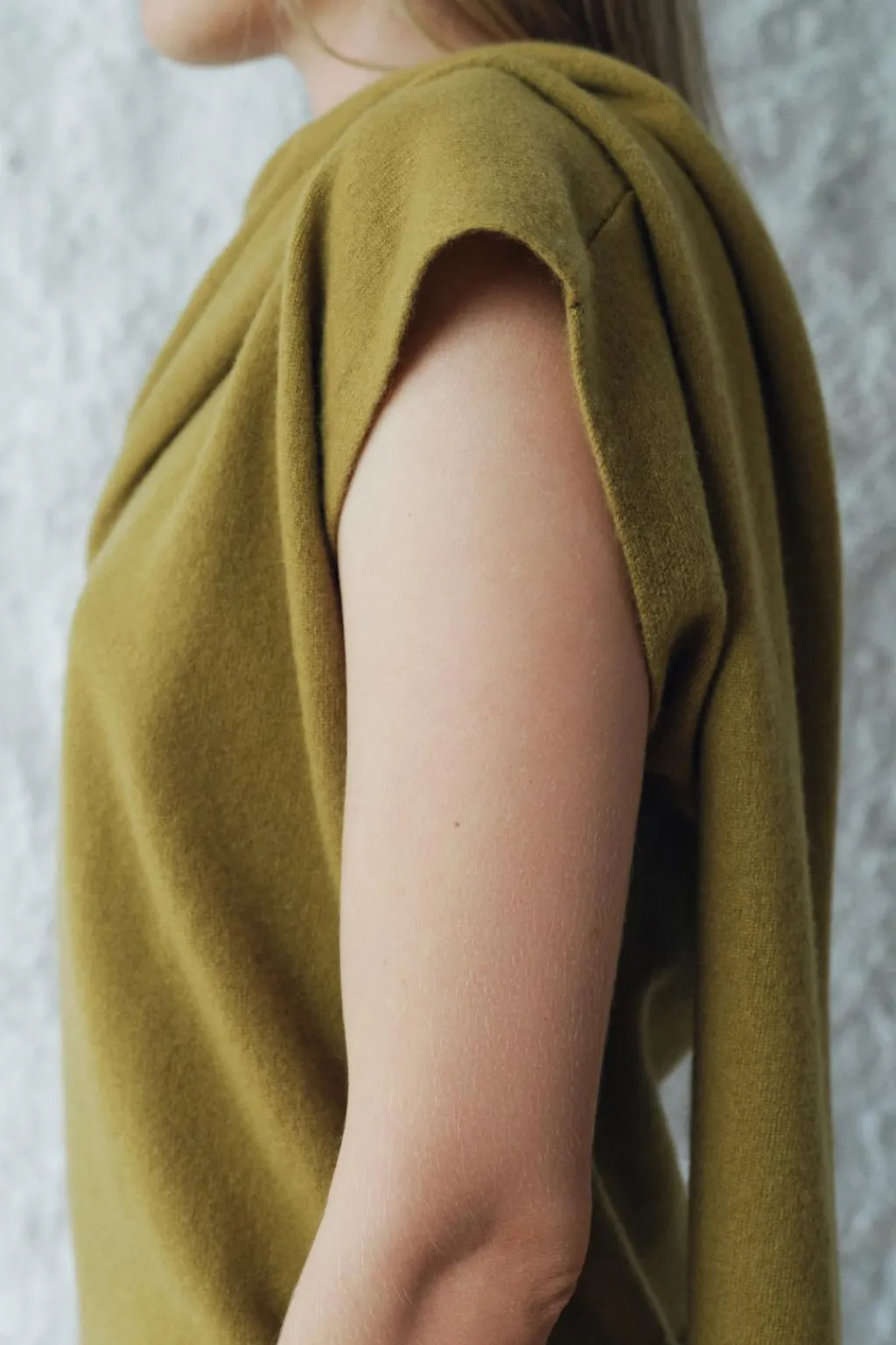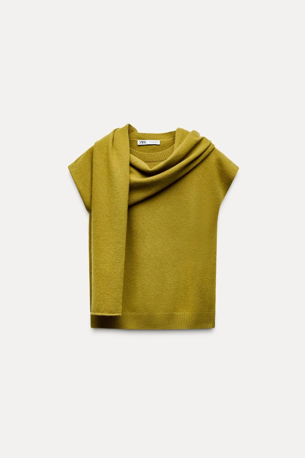 Top confeccionado en hilatura de lana 100%. Cuello redondo y manga sisa. Detalle de tejido tipo bufanda.