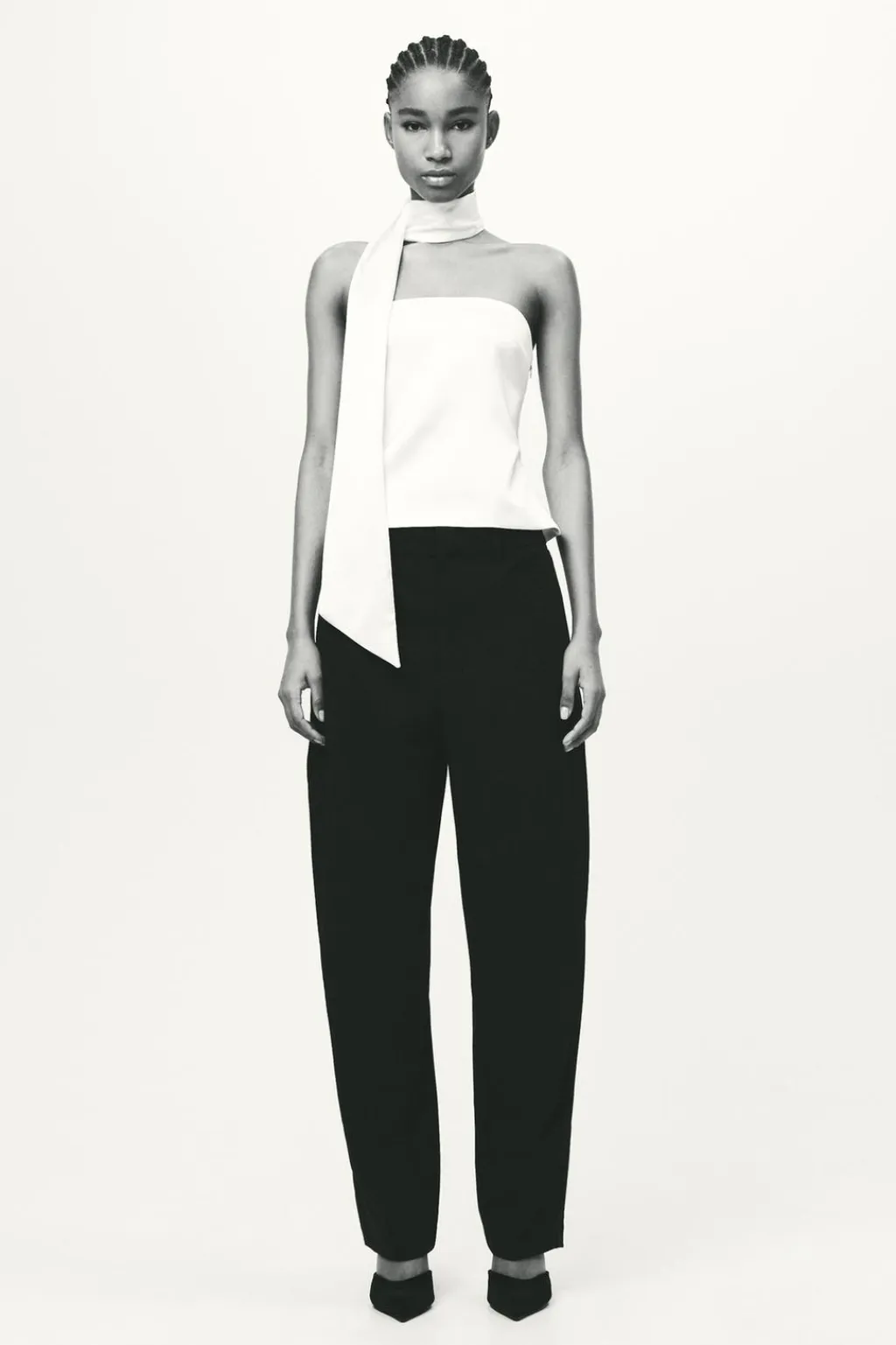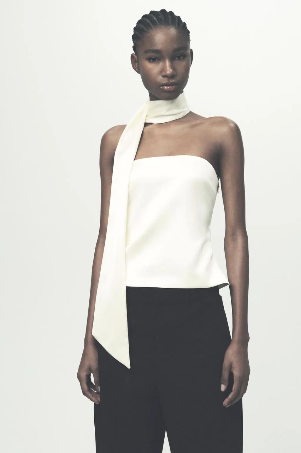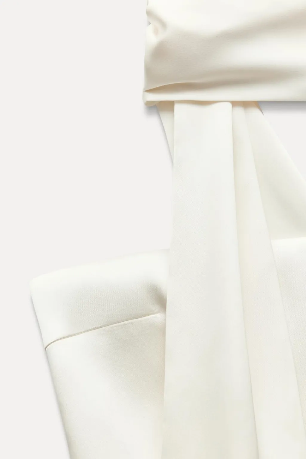 Top de escote recto y hombros descubiertos. Detalle tipo foulard en mismo tejido. Forro interior. Cierre lateral con cremallera oculta en costura.