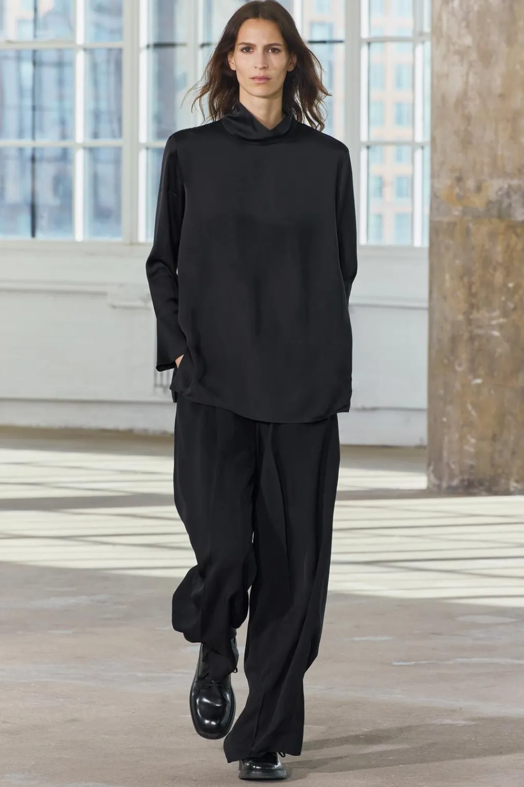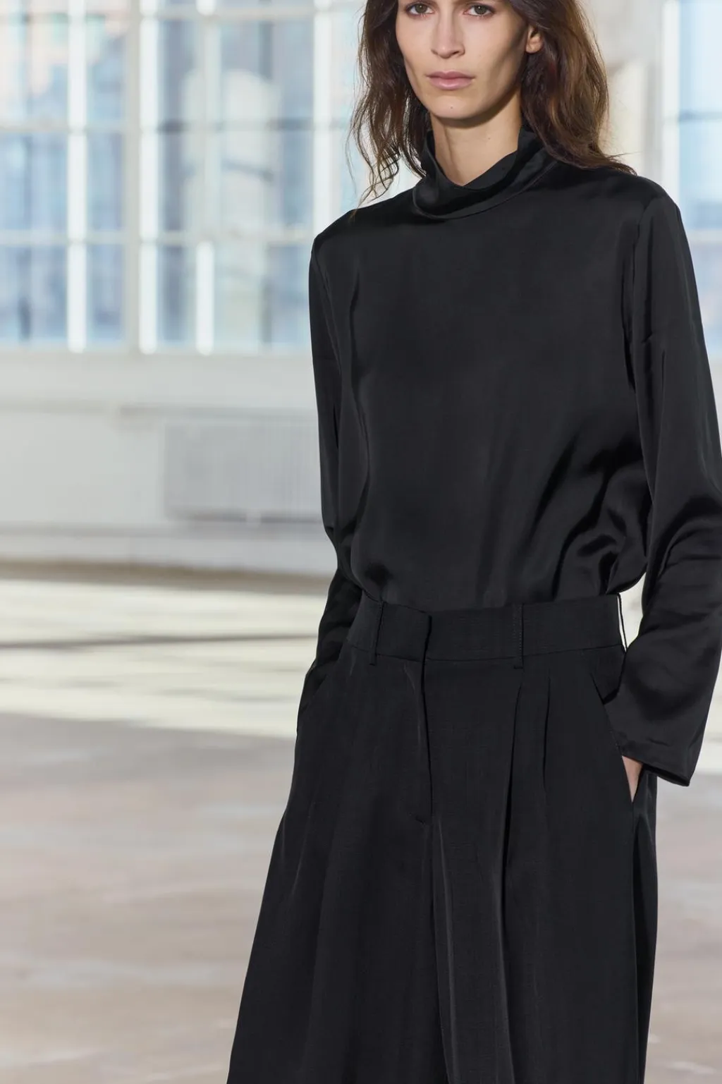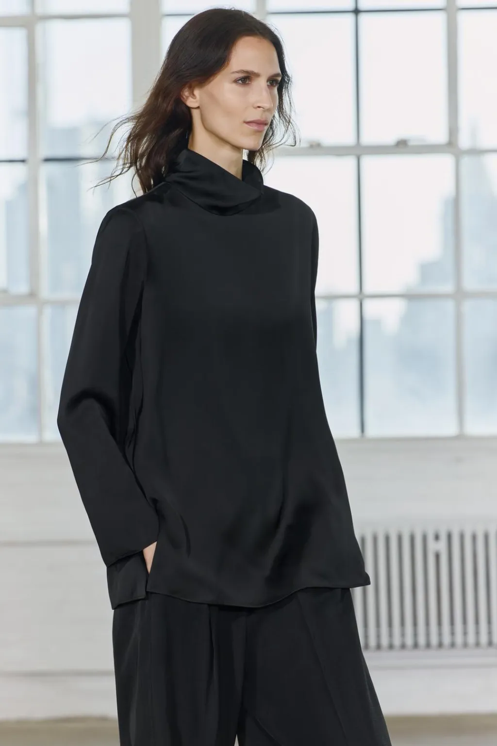 Top confeccionado en hilatura de viscosa. Cuello alto y manga larga. Bajo recto.