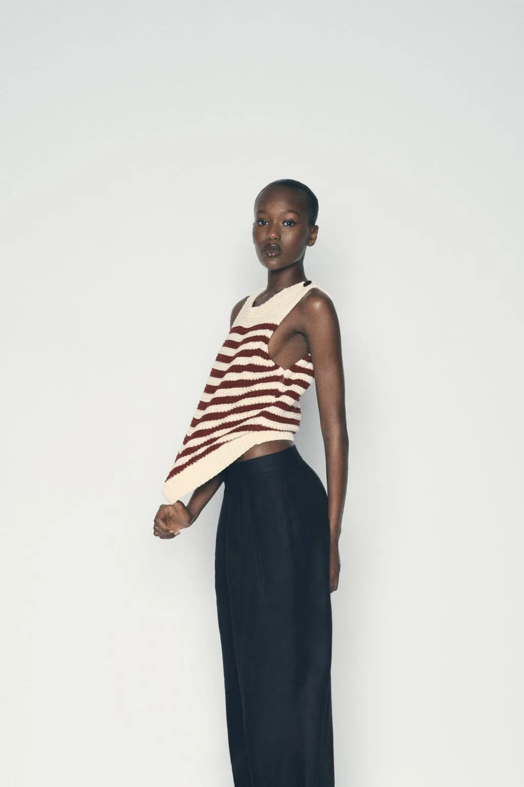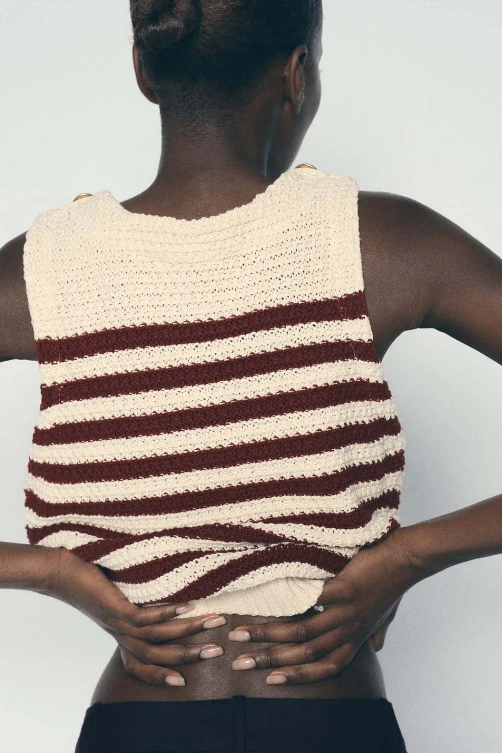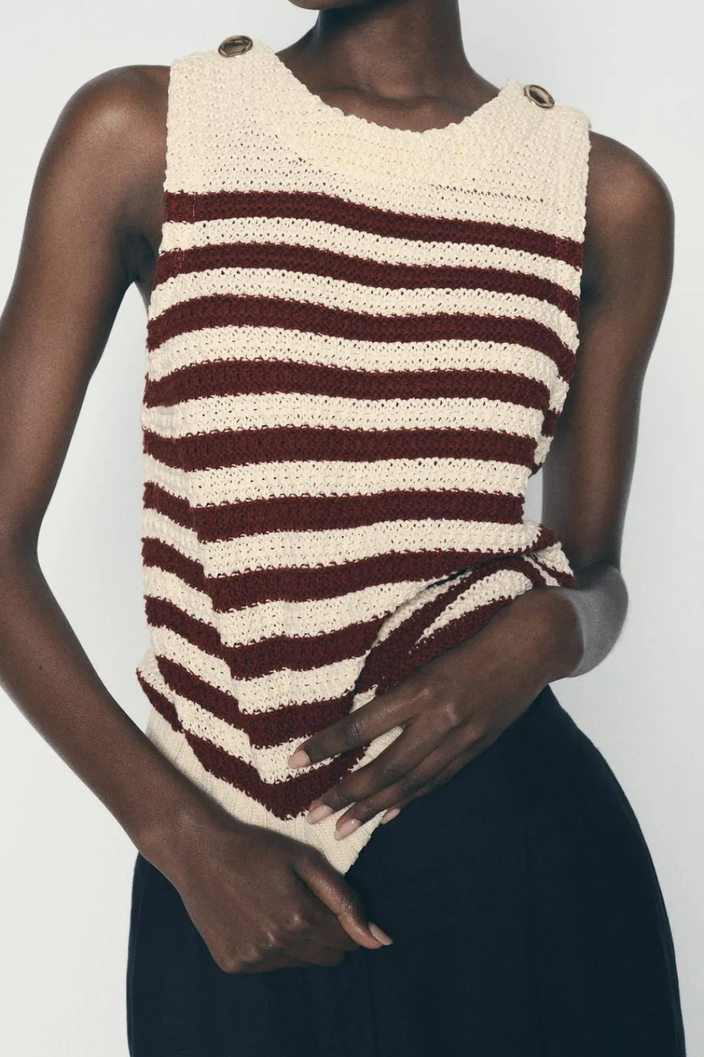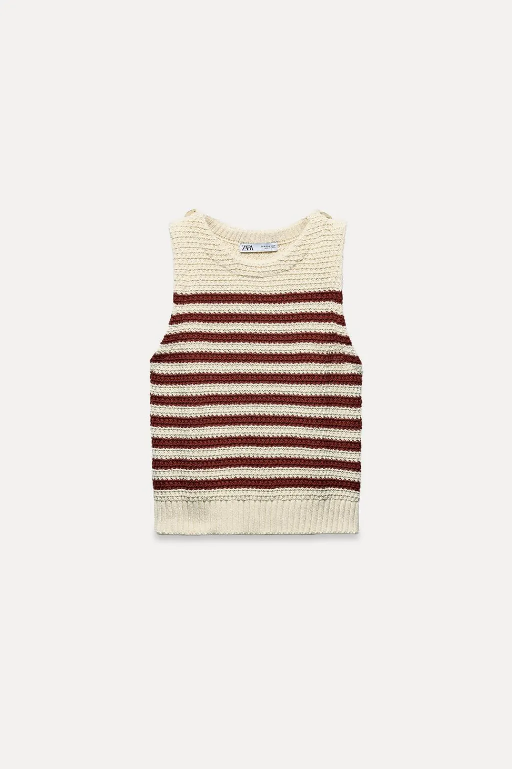 Top de cuello redondo y manga sisa con botones dorados en hombros.