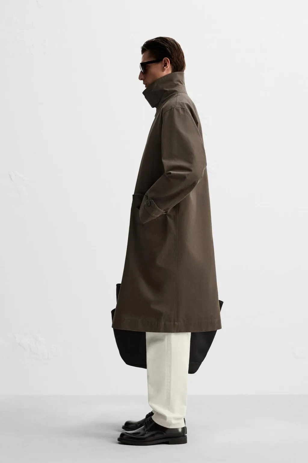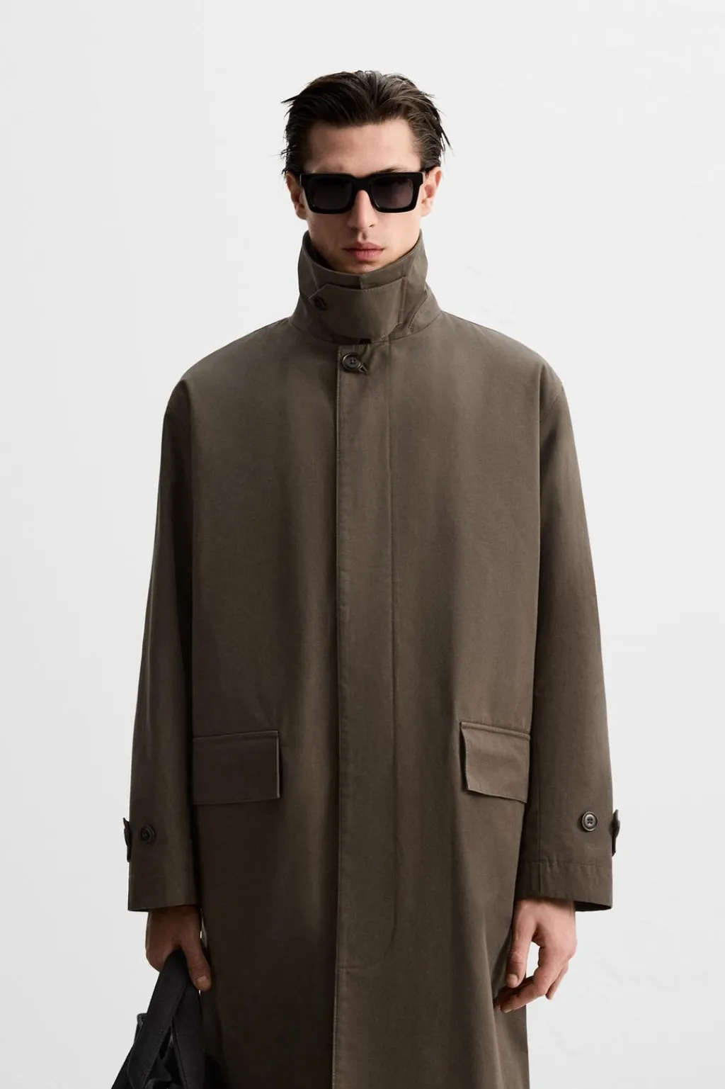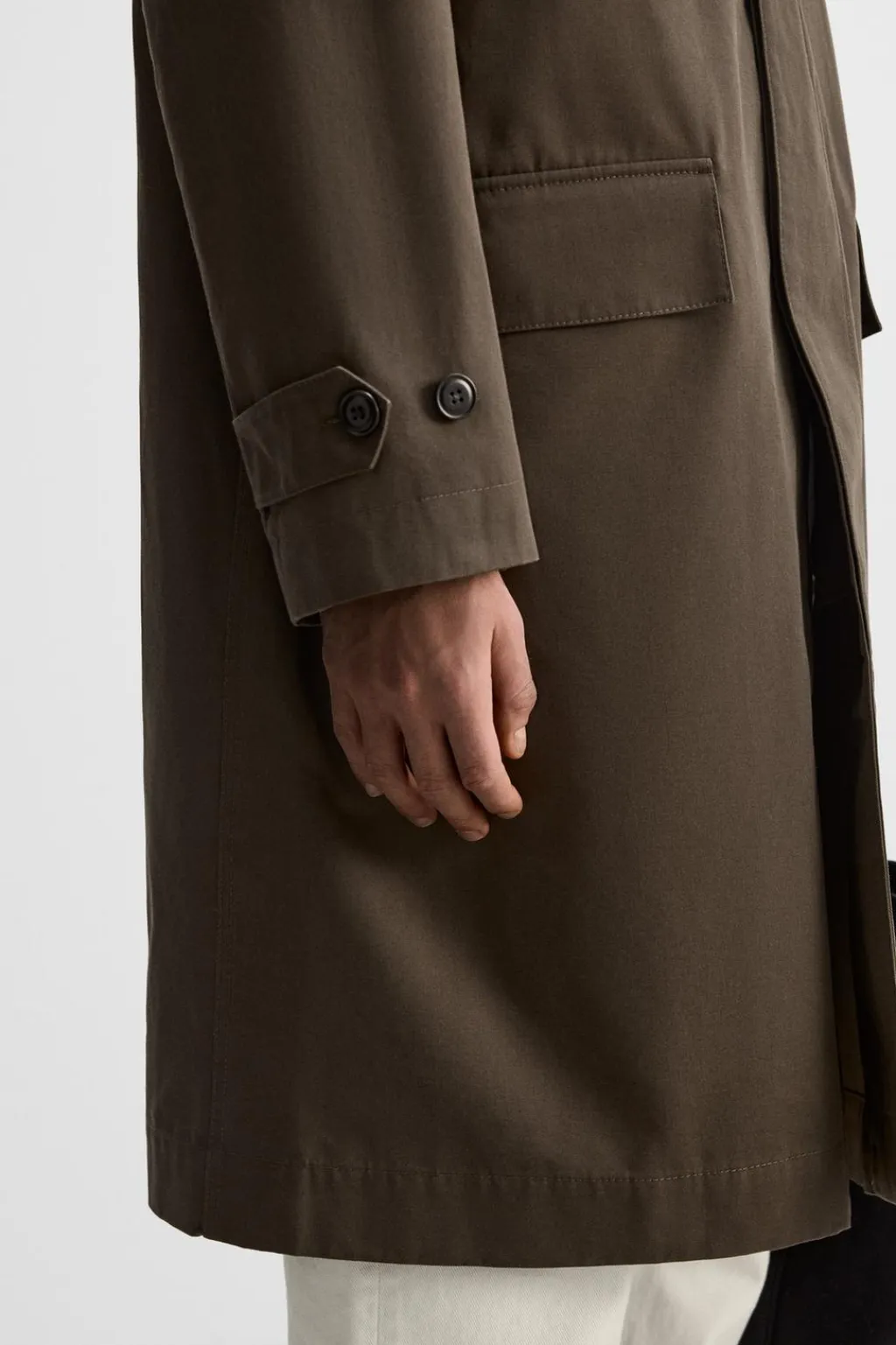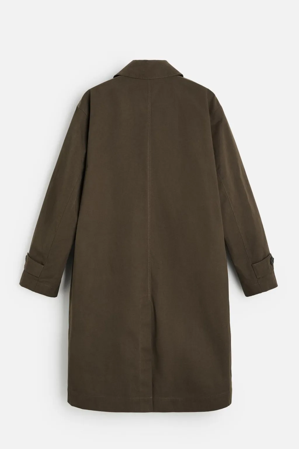 Trench largo confeccionado en tejido compacto de algodón en doble cara y con acabado encerado. Cuello solapa y manga larga acabada en puño ajustable con trabilla. Bolsillos de solapa en cadera. Bajo con abertura en centro espalda. Cierre frontal de botonadura oculta por solapa.