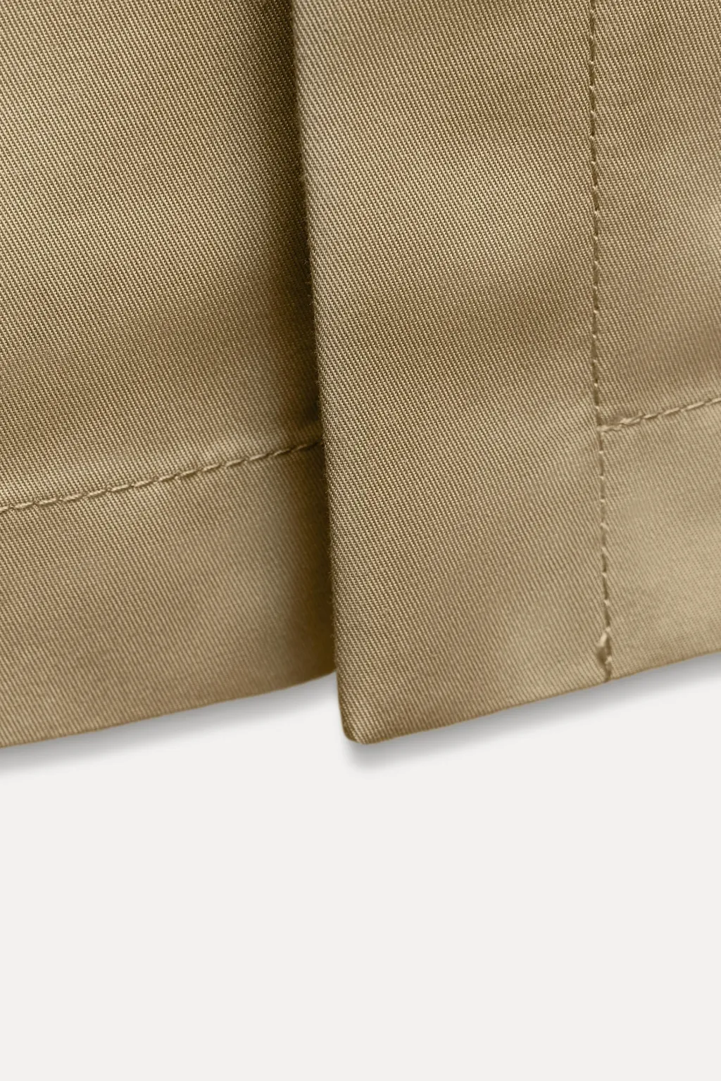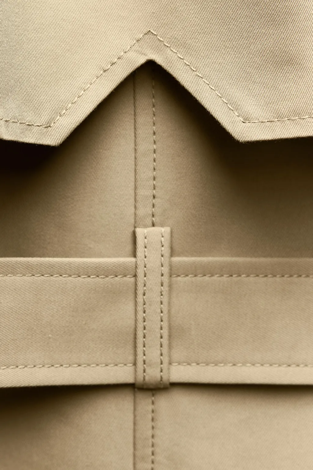 Trench de cuello solapa y manga larga acabada con trabilla y botón. Bolsillos delanteros de vivo. Bajo con abertura en espalda. Cierre frontal cruzado con botones y cinturón.