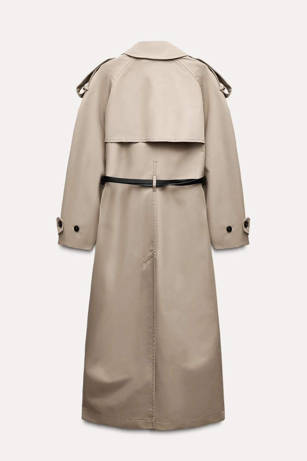 Trench amplia de cuello solapa. Manga larga con trabillas y botón. Bolsillos de vivo en delantero. Detalle de cinturón combinado a contraste con hebilla. Cierre frontal con botones.