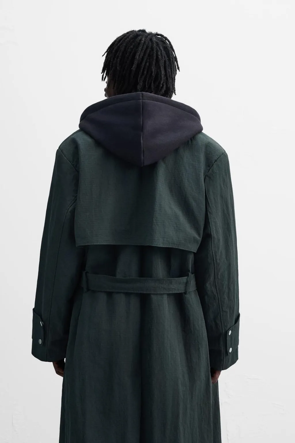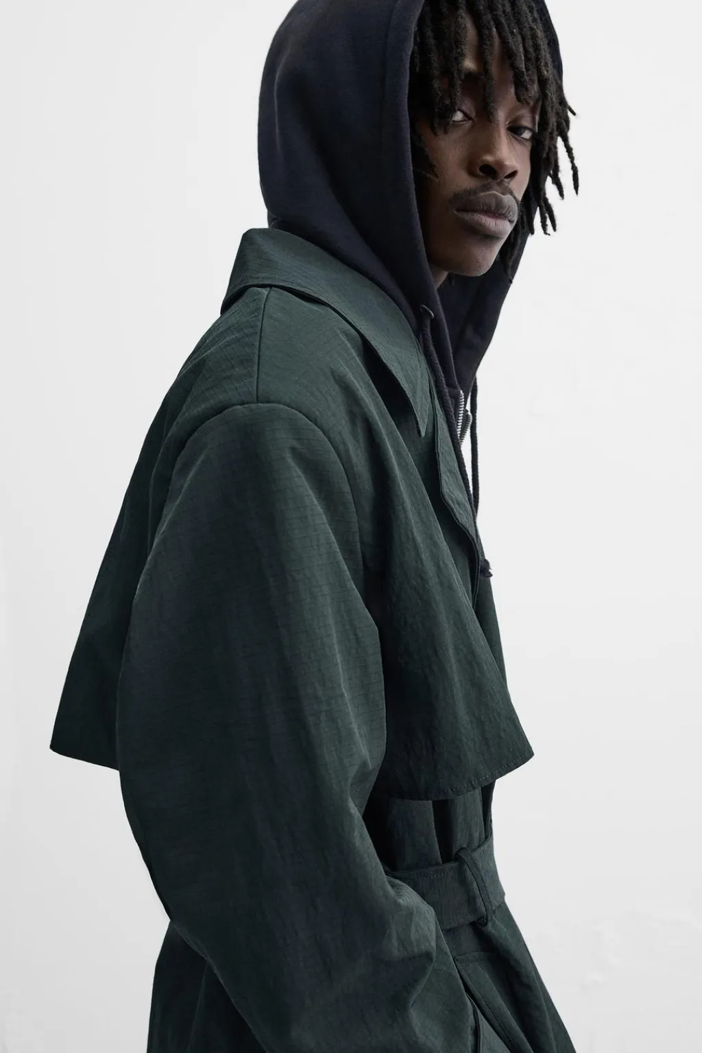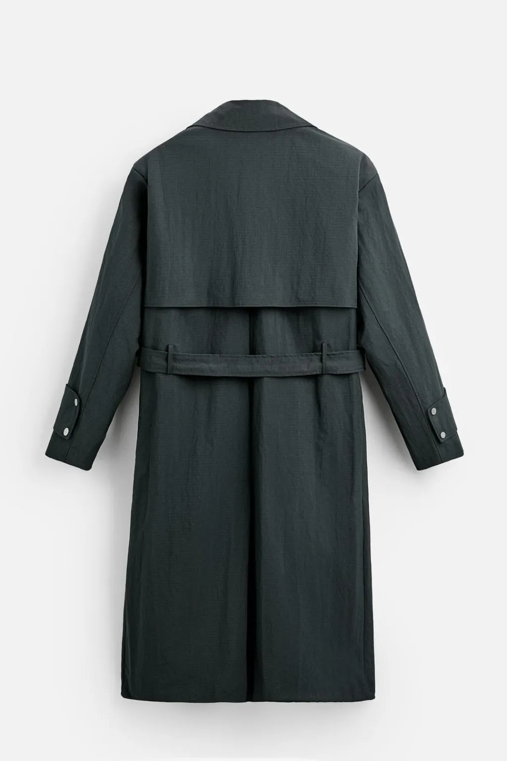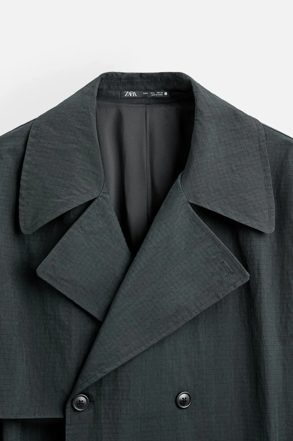Trench relaxed fit confeccionado en tejido técnico con estructura ripstop, resistente a desgarros. Cuello con solapas de muesca y manga larga acabada en puño ajustable con trabilla. Bolsillos de vivo en cadera y detalle de bolsillo interior. Cinturón del mismo tejido en cintura. Bajo con abertura en centro espalda. Cierre frontal de botonadura cruzada.