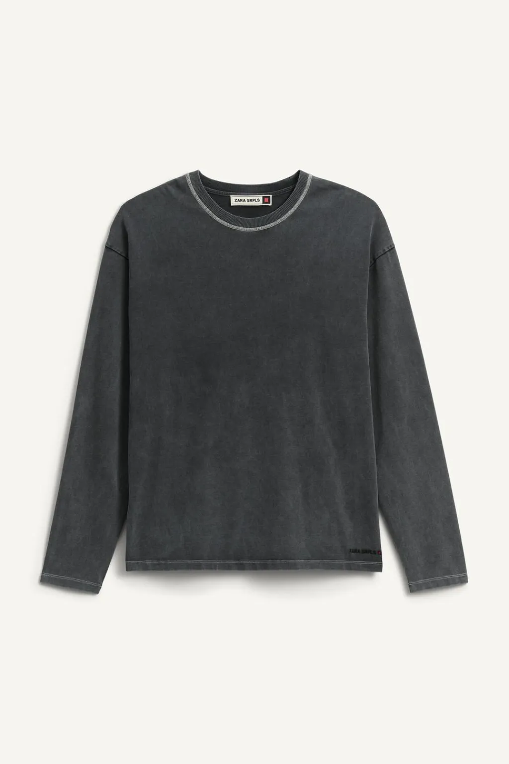 Camiseta relaxed fit confeccionada en algodón compacto. Cuello redondo y manga larga. Detalle de logo bordado en el bajo. Efecto lavado.