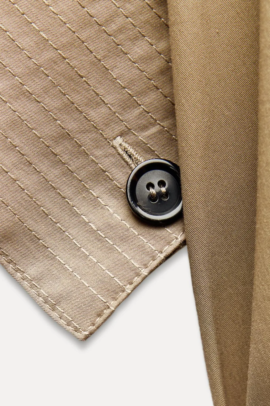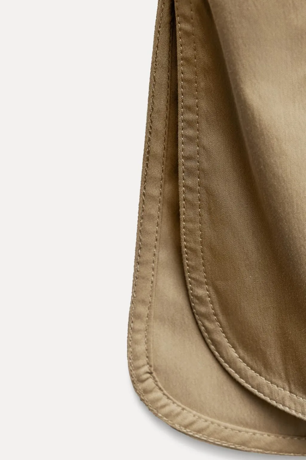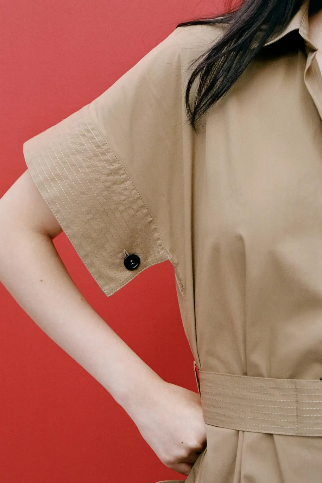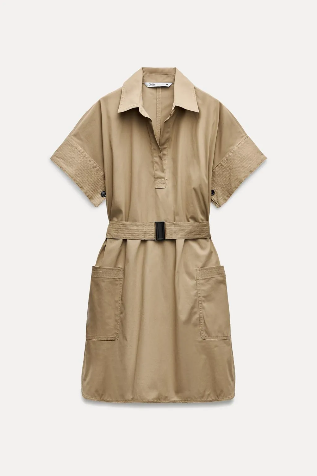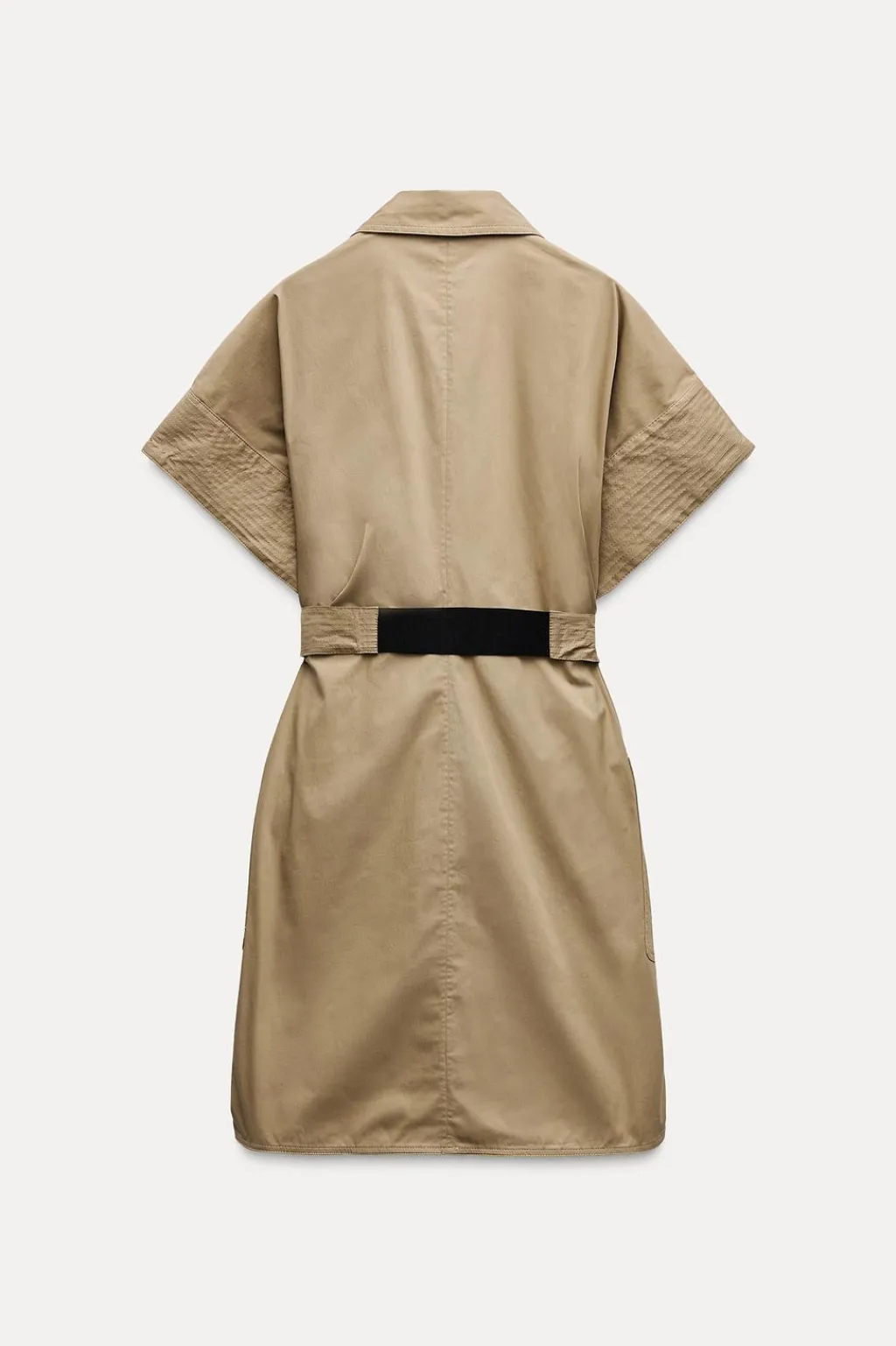 Vestido corto confeccionado en hilatura con mezcla de algodón. Cuello solapa y escote pico con manga corta. Bolsillos de plastrón. Cinturón en mismo tejido. Detalle de pespuntes a contraste. Bajo redondeado con aberturas laterales.