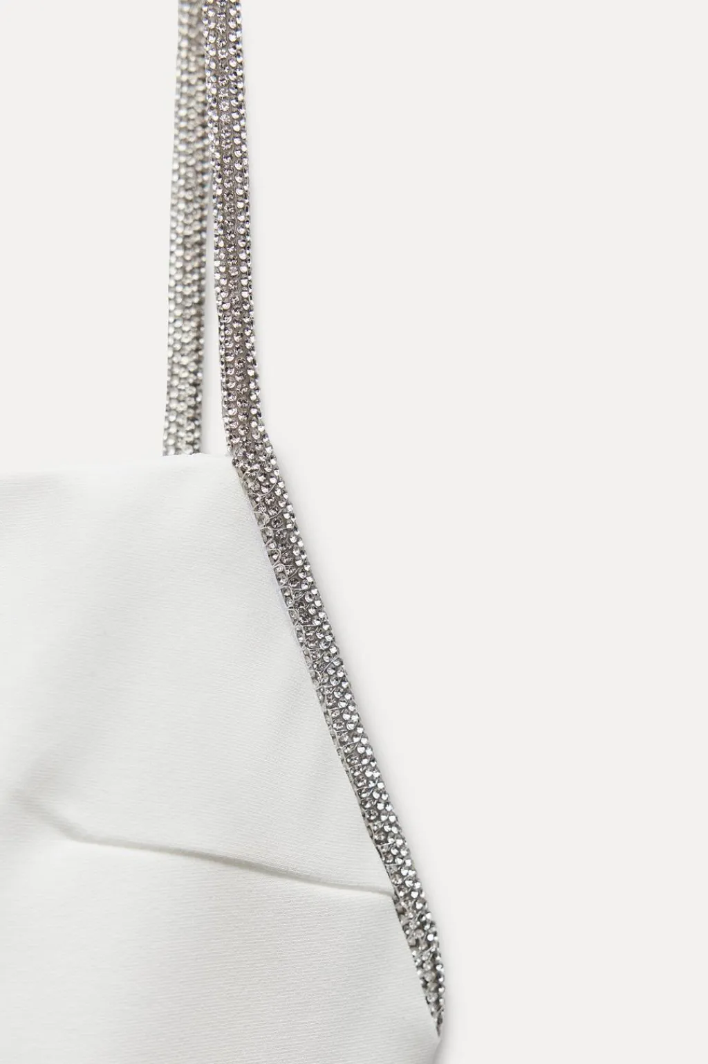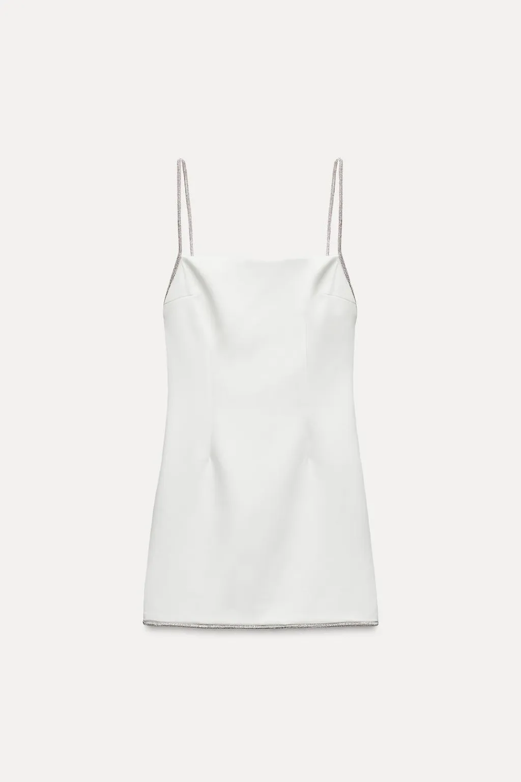 Vestido corto de escote recto. Tirantes finos con aplicación de brillos. Forro interior combinado a tono. Bajo acabado con aplicación brillos. Cierre en espalda con cremallera oculta en costura.