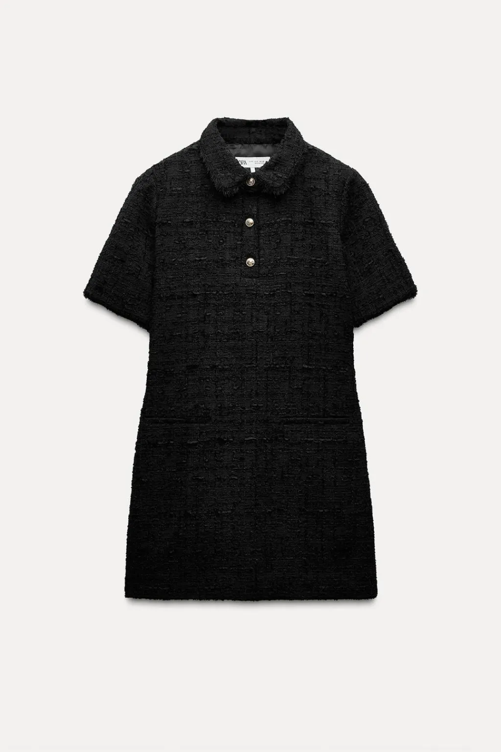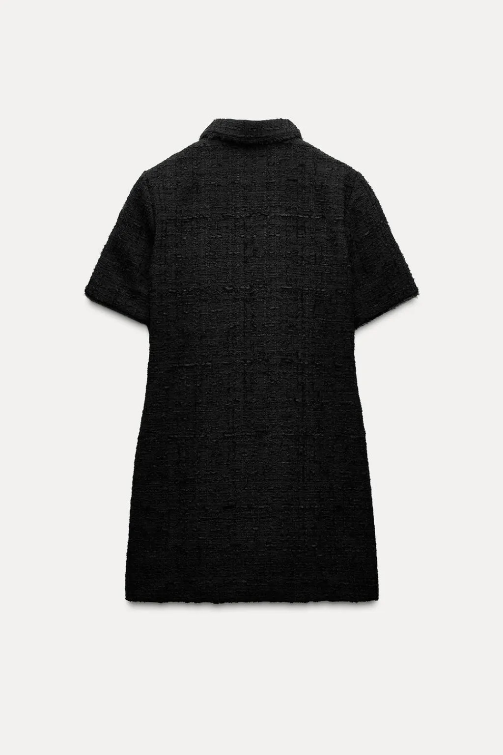 Vestido corto de cuello solapa y manga corta. Detalle de tejido con estructura. Cierre frontal con botones metálicos en relieve.