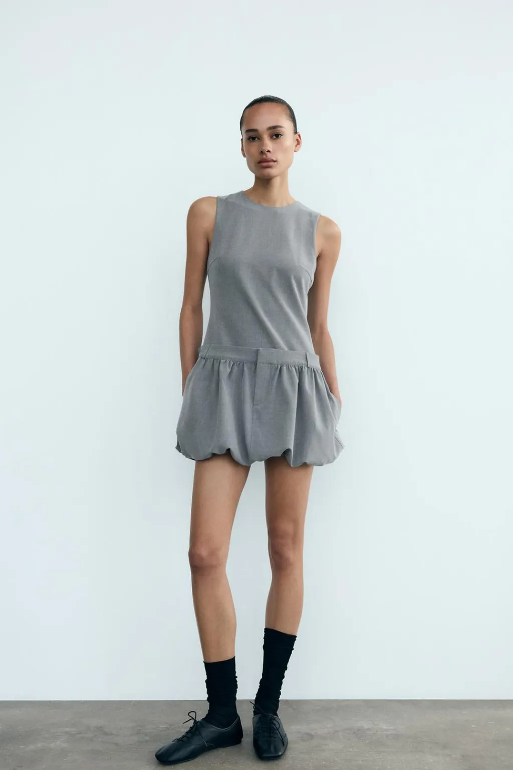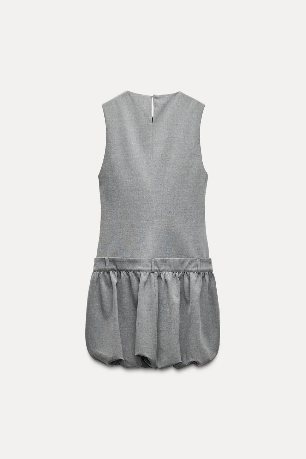 Vestido corto de cuello redondo y manga sisa. Bolsillos laterales ocultos en costura. Bajo acabado abullonado. Forro interior combinado. Cierre lateral con cremallera oculta en costura.