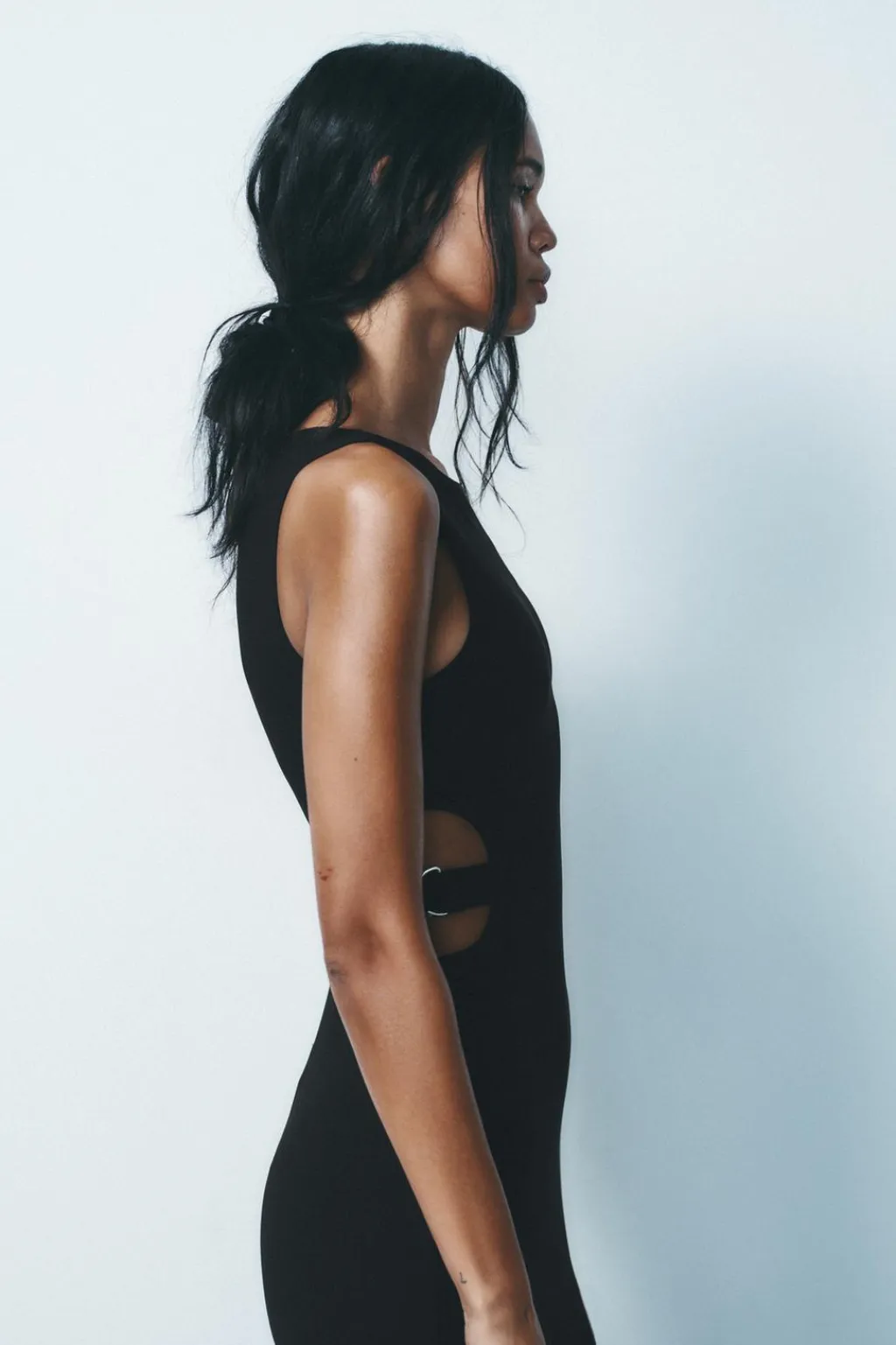 Vestido corto de cuello redondo y manga sisa. Detalle de aberturas con trabillas y hebillas metálicas en cintura. Cierre en espalda con cremallera oculta en costura.