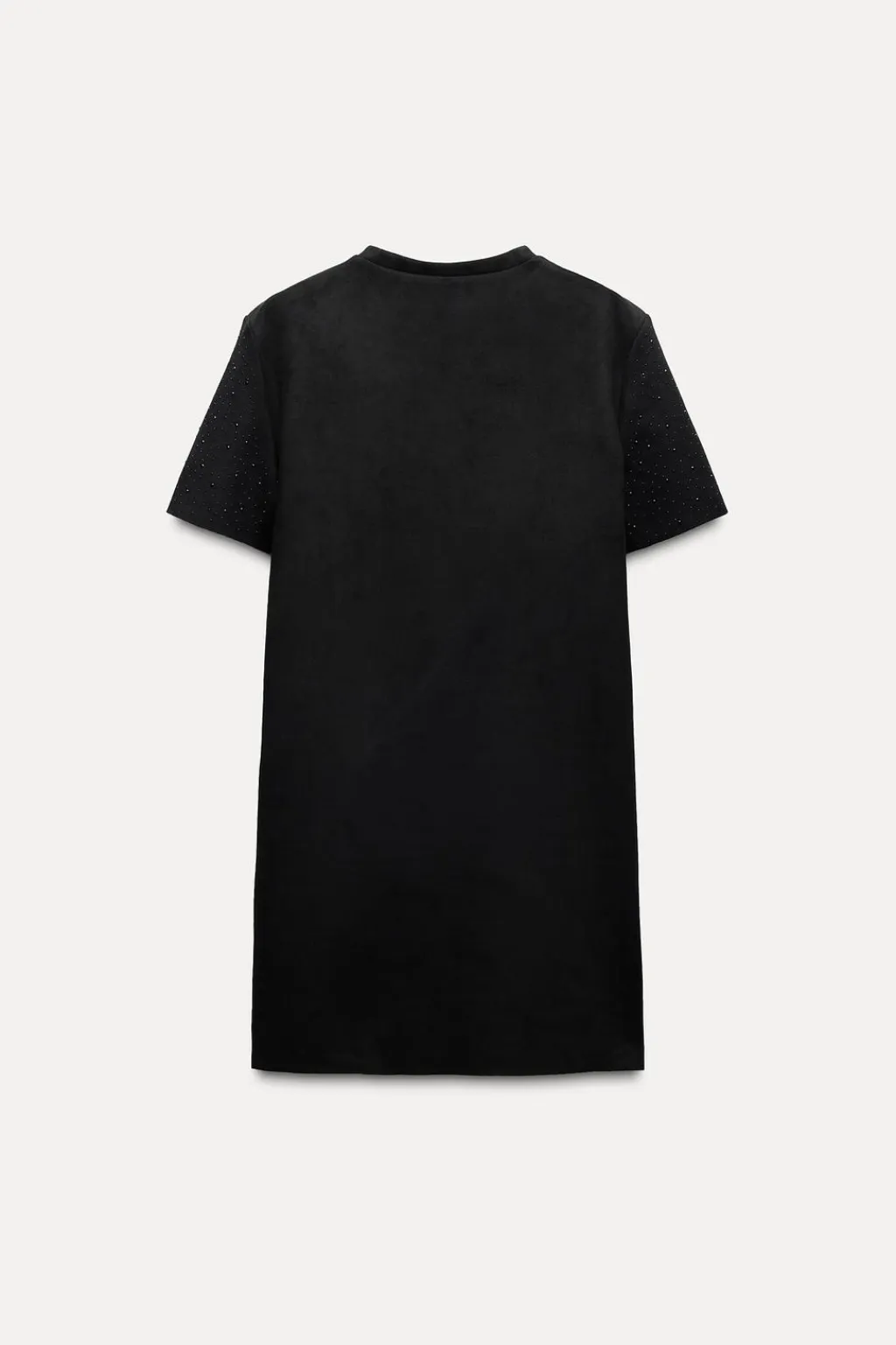 Vestido corto de cuello redondo y manga corta. Detalle de aplicación de brillos.