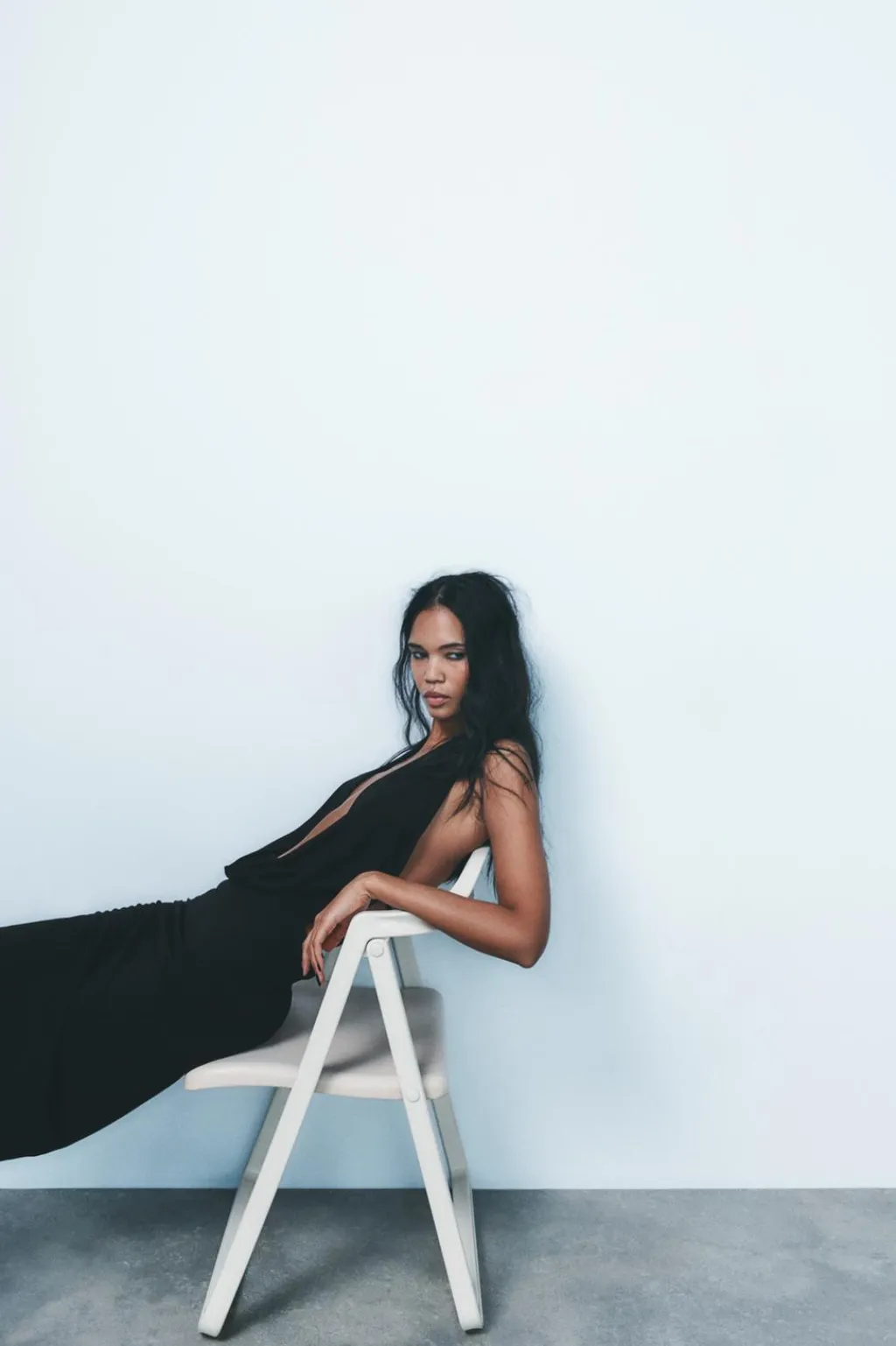 Vestido midi confeccionado en tejido tipo punto. Cuello halter con escote pronunciado y drapeado. Espalda descubierta con tira y gancho metálico.