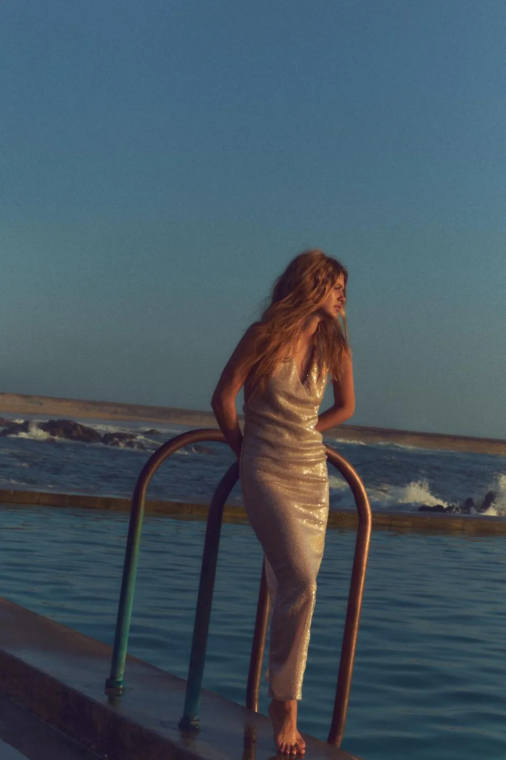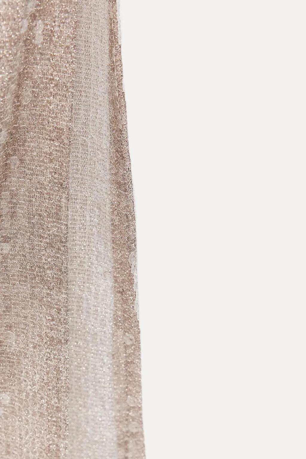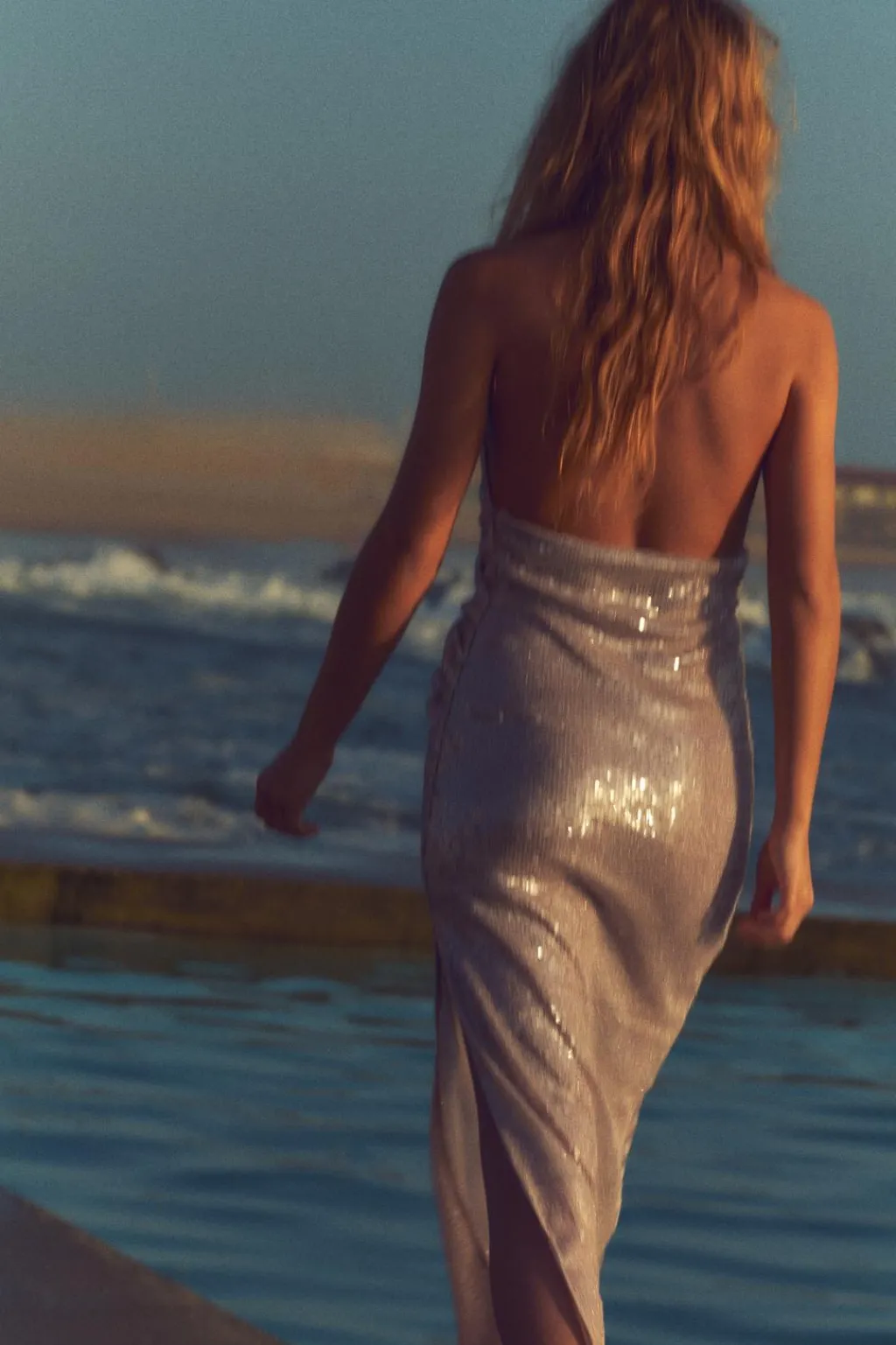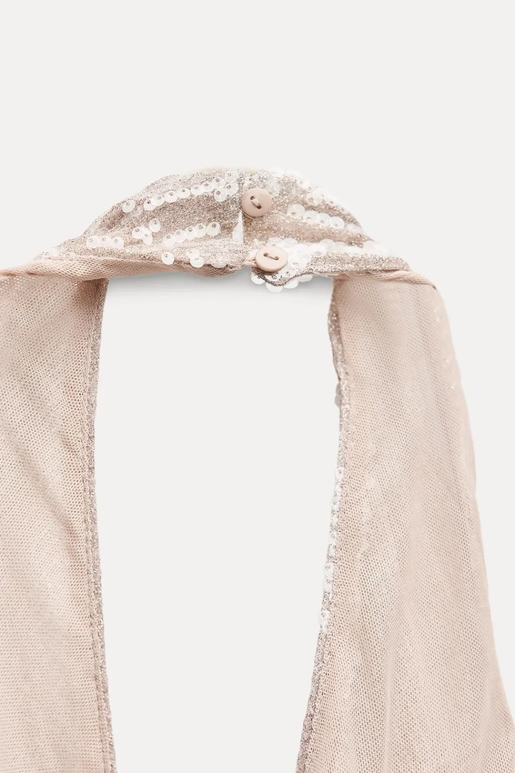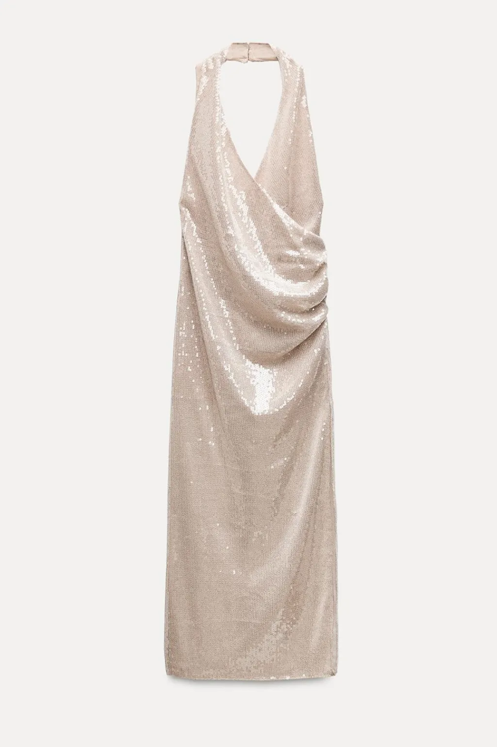 Vestido midi de cuello halter y escote pico cruzado. Espalda descubierta. Detalle aplicación lentejuelas. Forro interior combinado. Bajo con abertura lateral. Cierre en cuello con botones y con cremallera lateral oculta en costura.