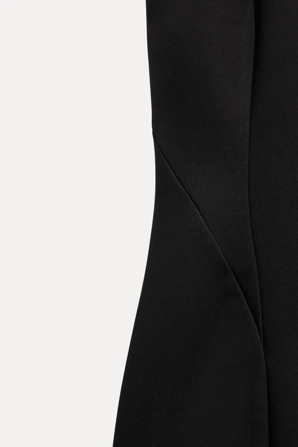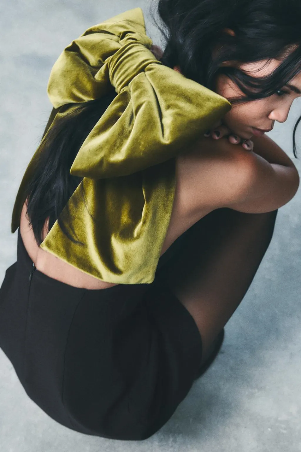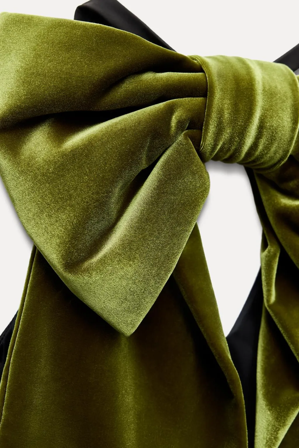 Vestido corto de escote pico y tirantes. Espalda descubierta con aplicación de maxi lazo en terciopelo combinado a contraste. Forro interior. Cierre en espalda con cremallera oculta en costura.