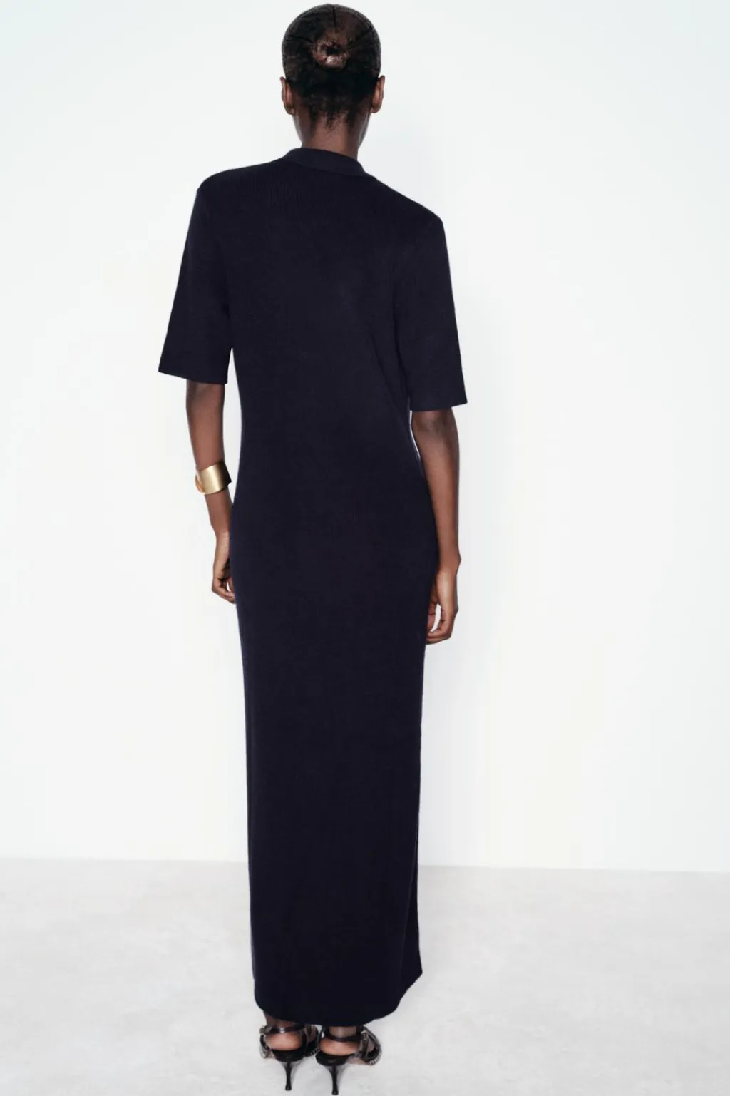 Vestido midi de cuello camisero y manga corta. Cierre frontal con botones.