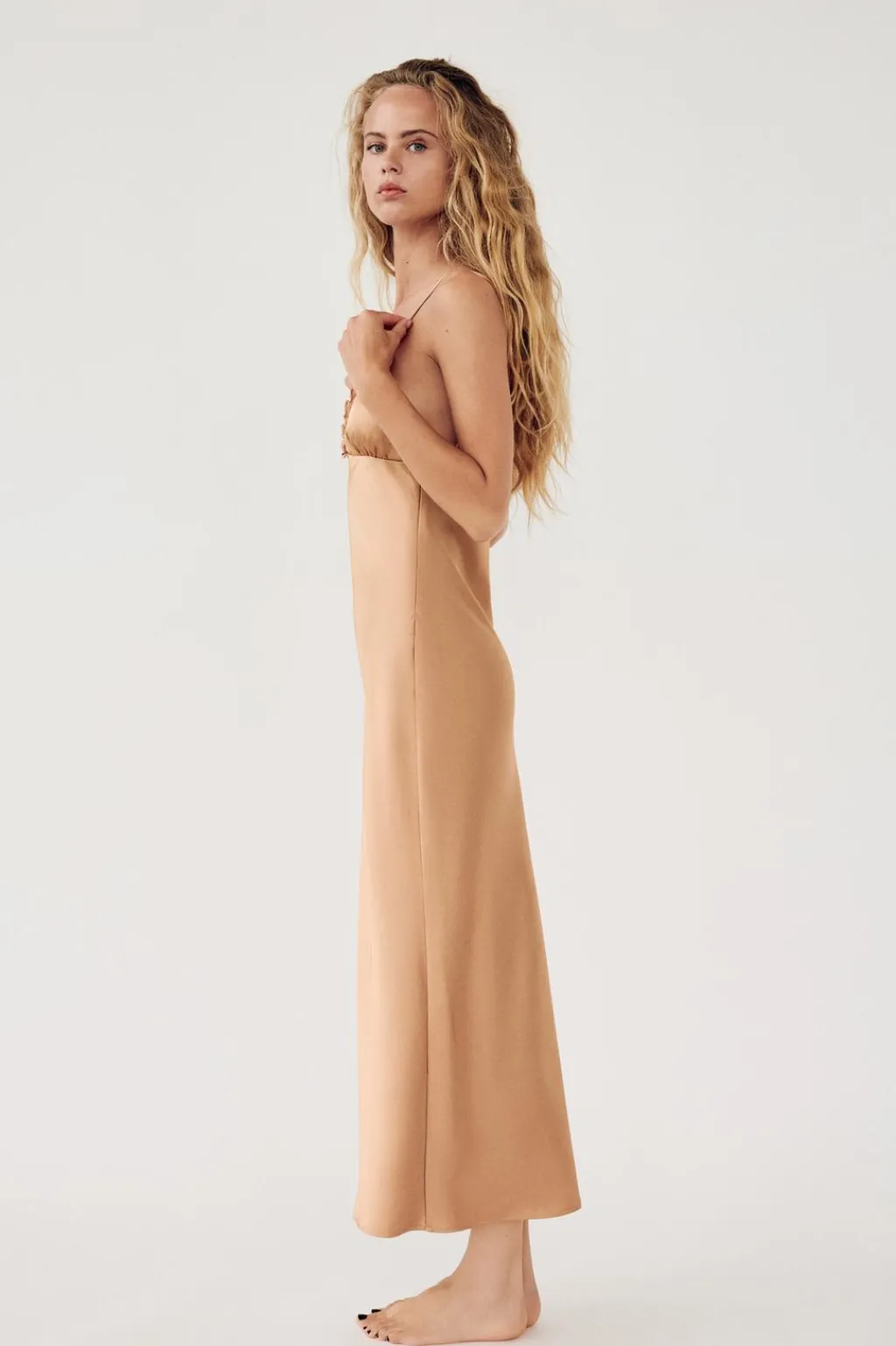 Vestido midi de escote pico con tirantes finos ajustables. Detalle de volantes en tejido combinado a tono.