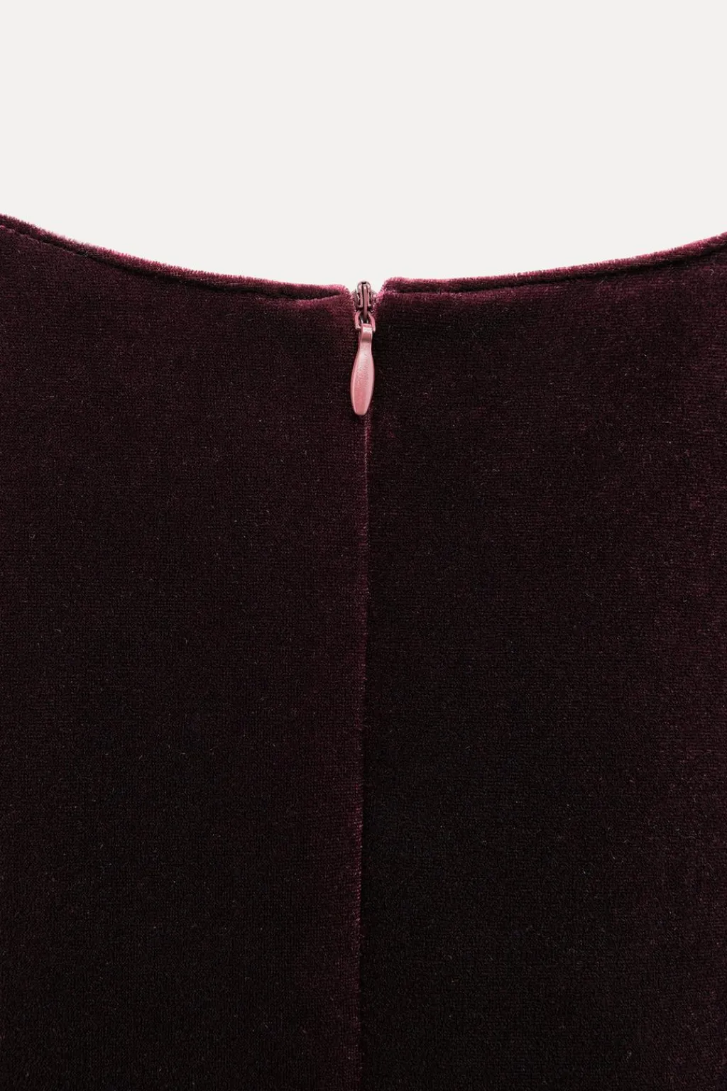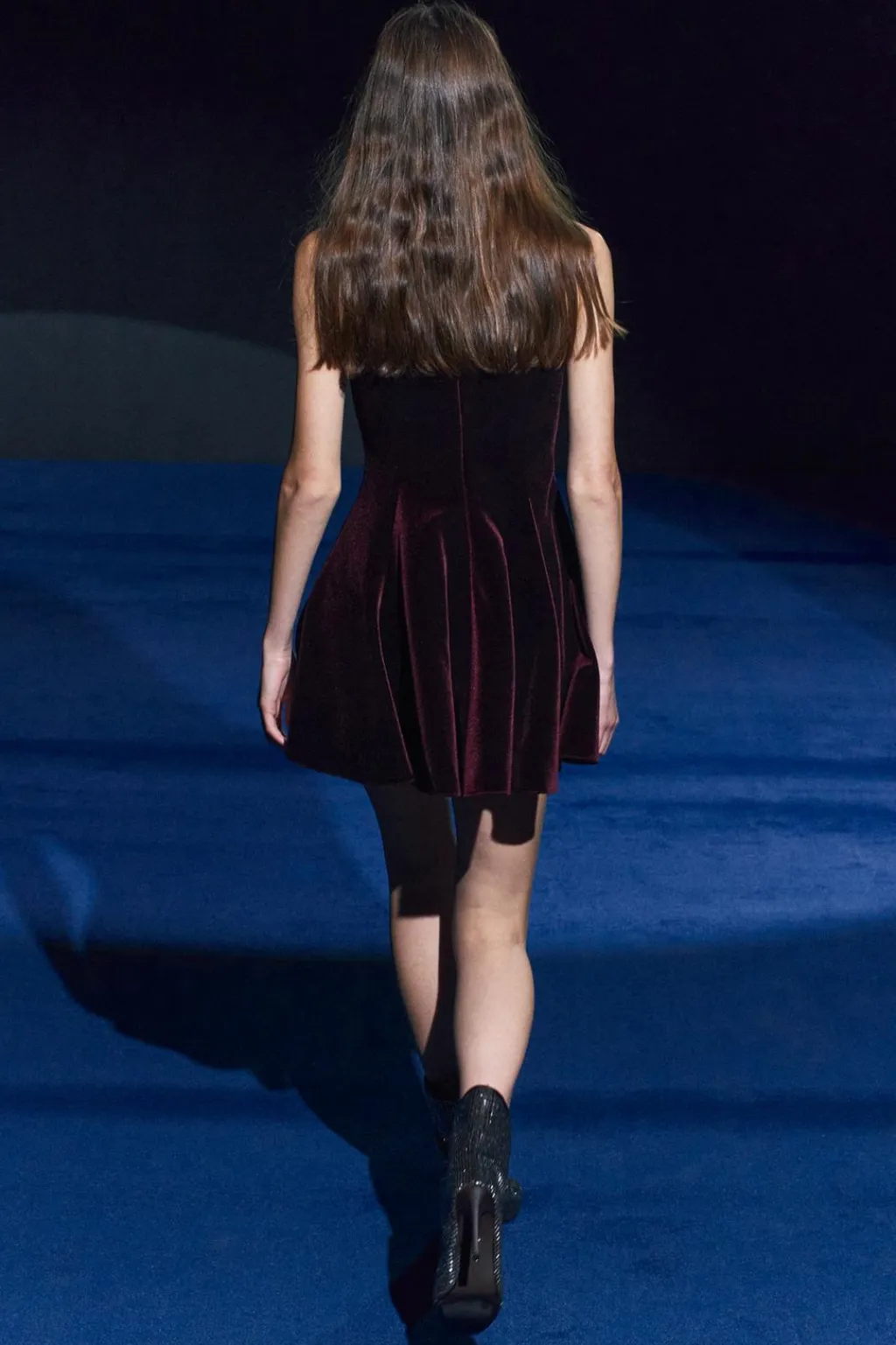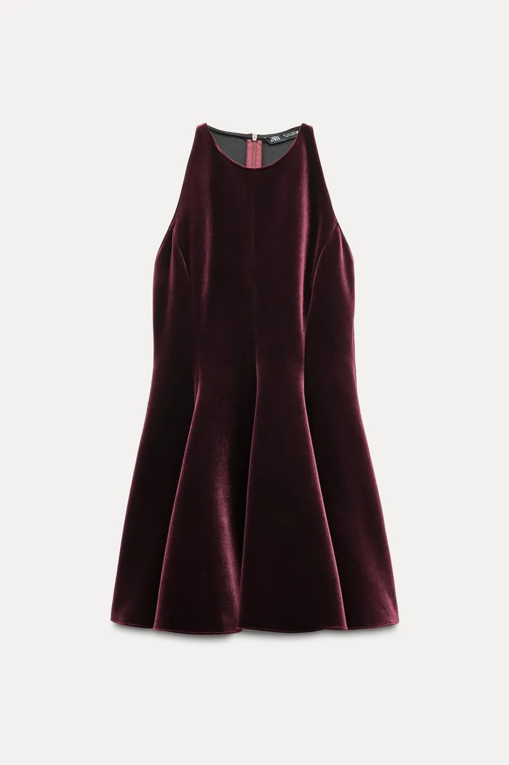 Vestido corto confeccionado en terciopelo. Cuello redondo y manga sisa. Bajo acabado en godets. Cierre en espalda con cremallera oculta en costura.