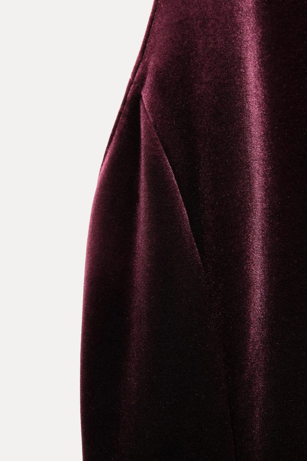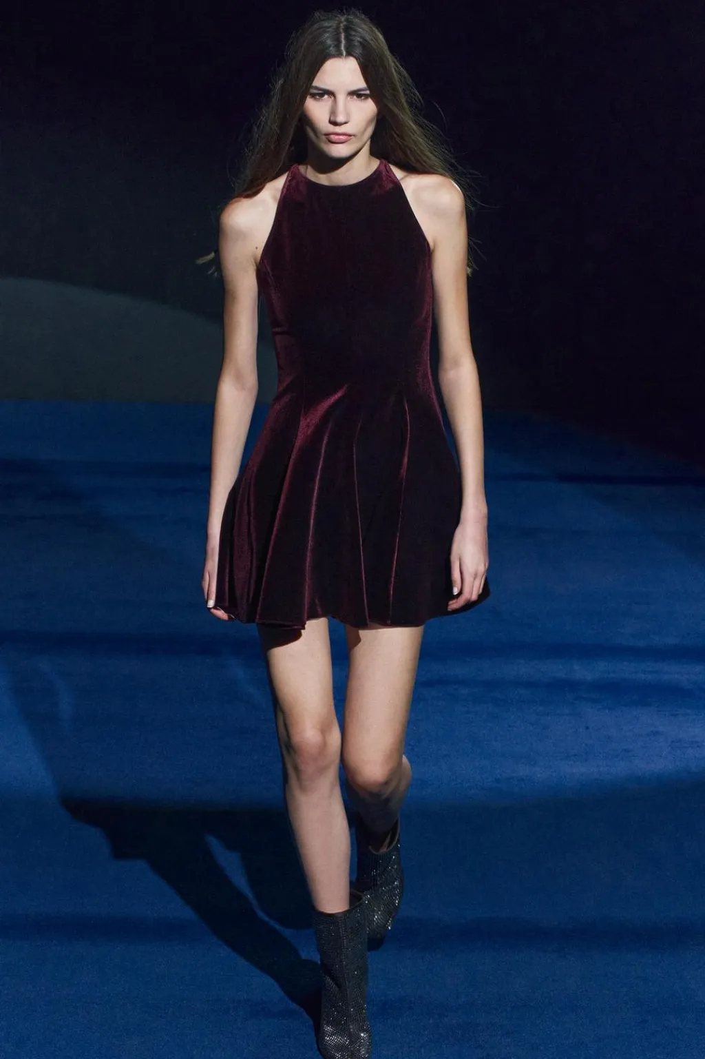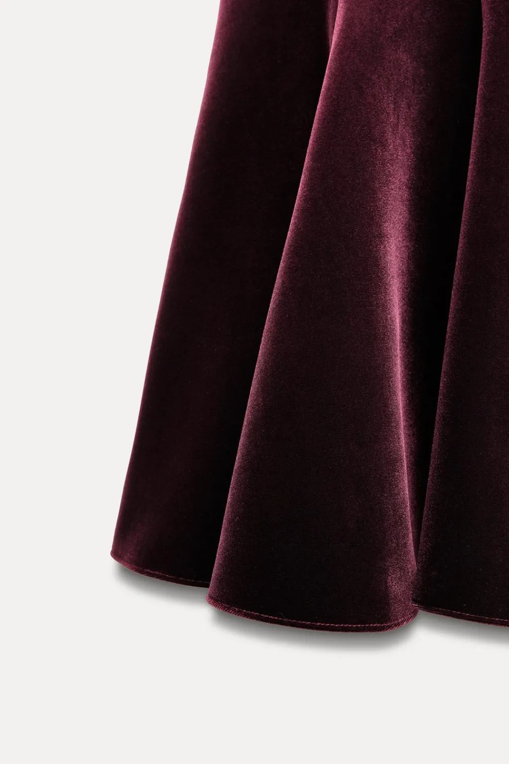 Vestido corto confeccionado en terciopelo. Cuello redondo y manga sisa. Bajo acabado en godets. Cierre en espalda con cremallera oculta en costura.