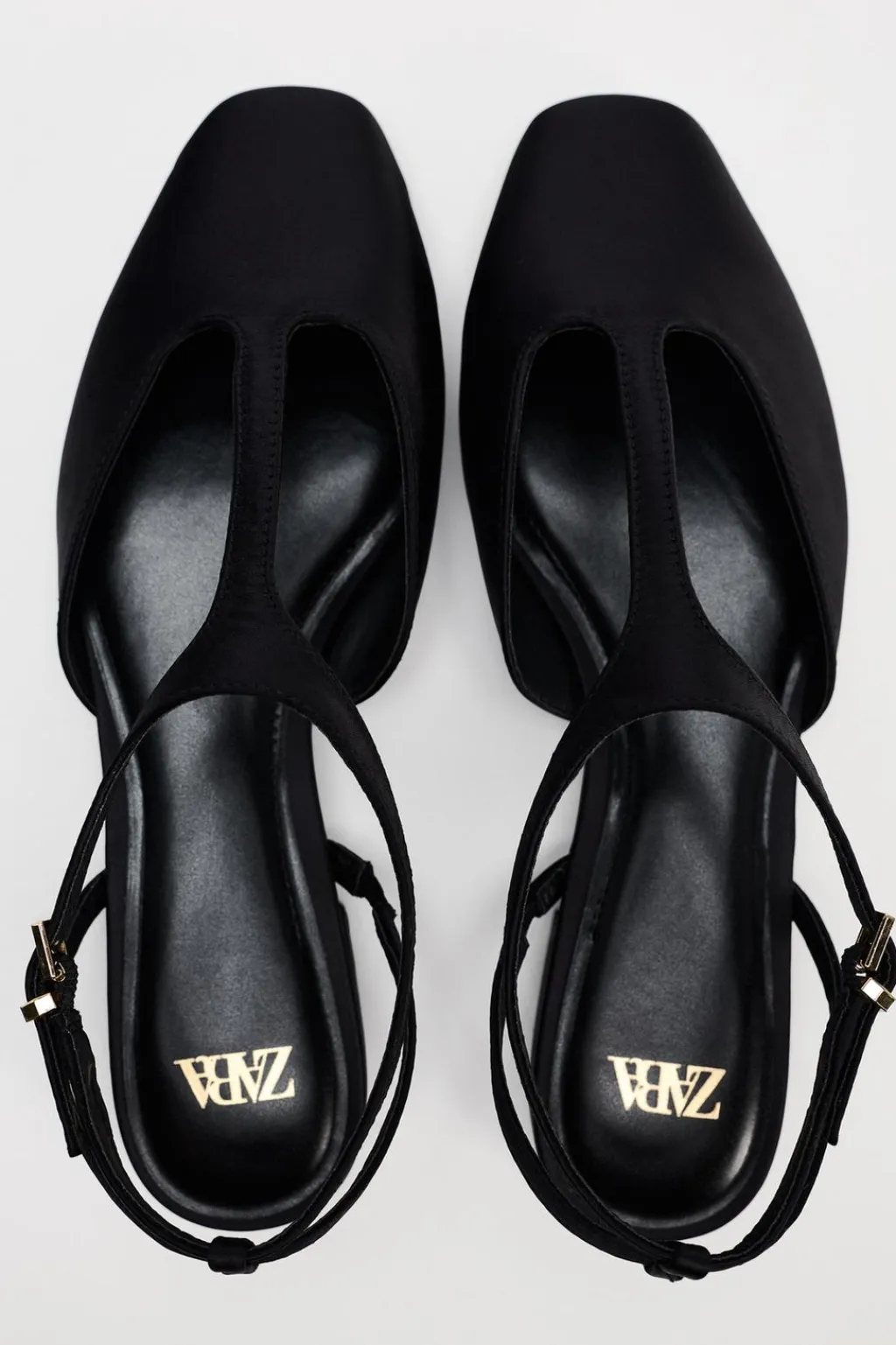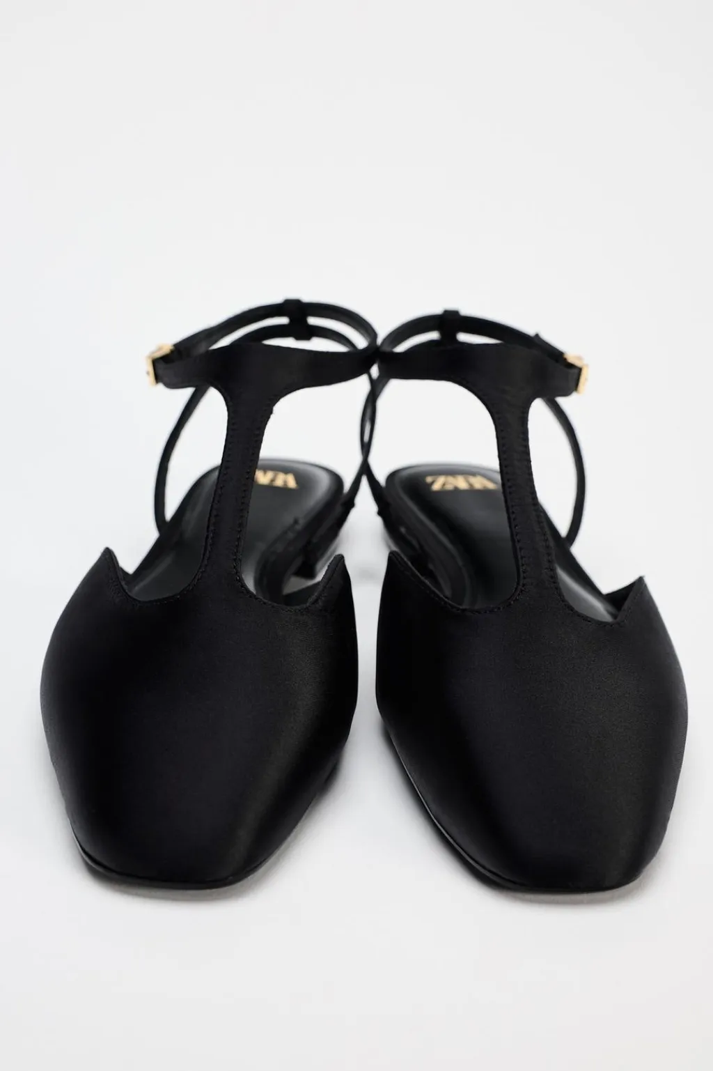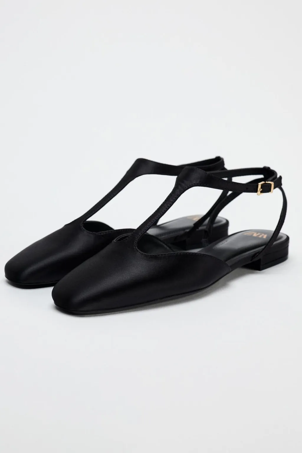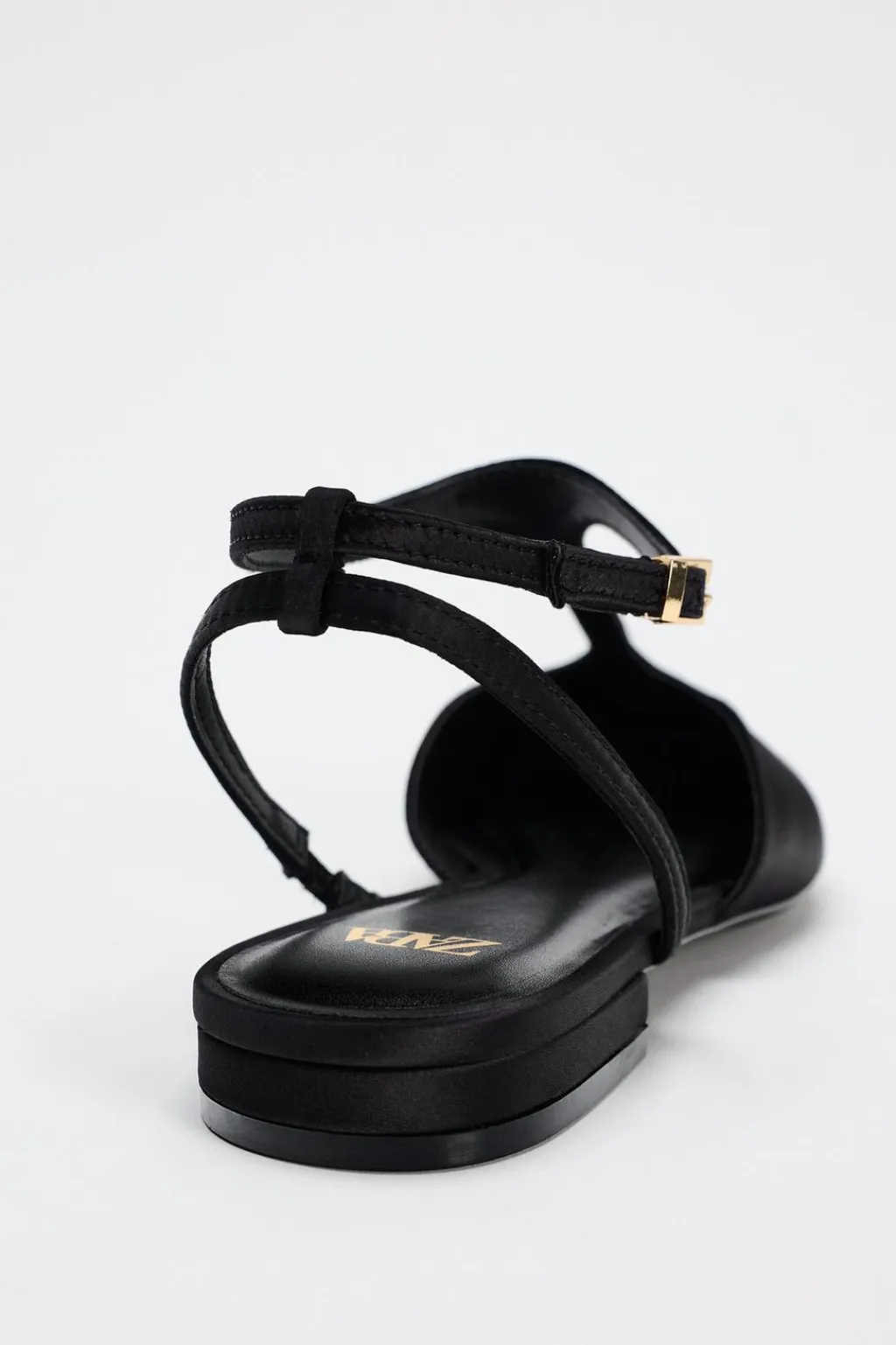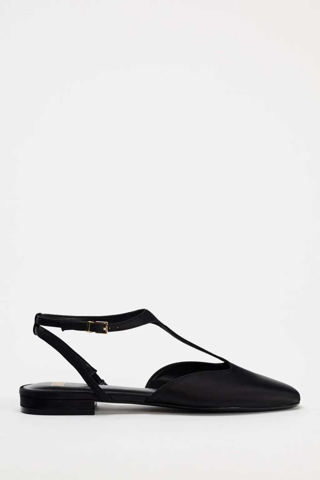 Zapato plano en tejido satinado. Detalle de tira fina en el empeine. Cierre mediante hebilla en la pulsera al tobillo.