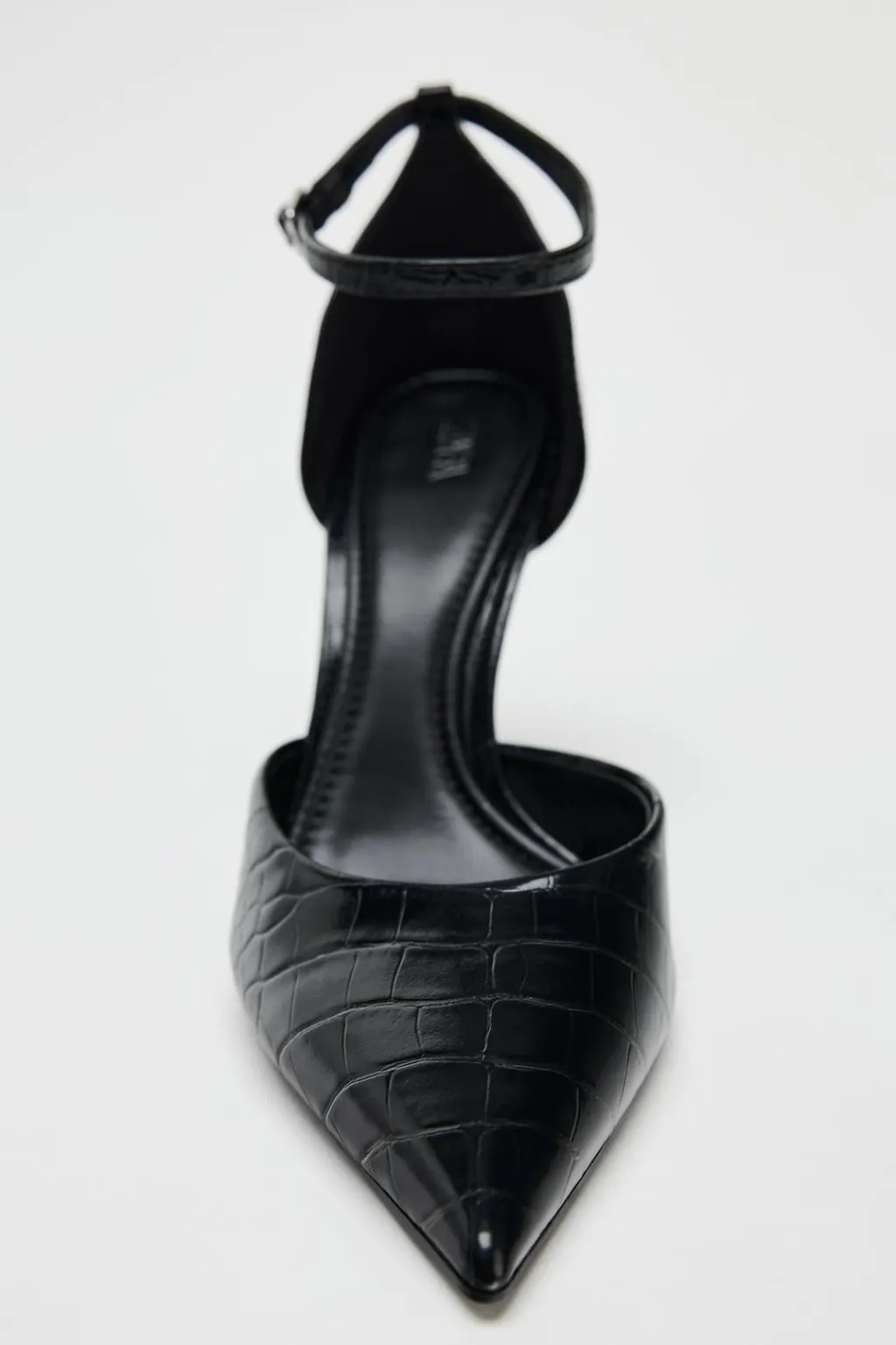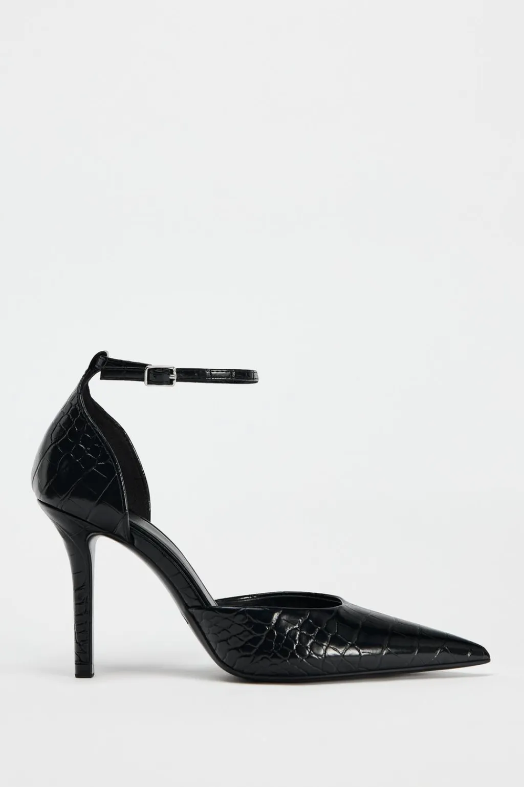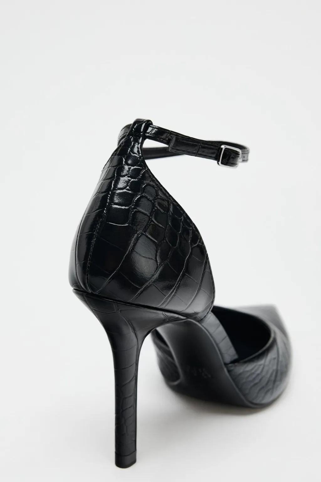 Zapato con tacón fino. Efecto de estampado animal en el corte. Cierre mediante hebilla en la pulsera al tobillo. Acabado en punta.