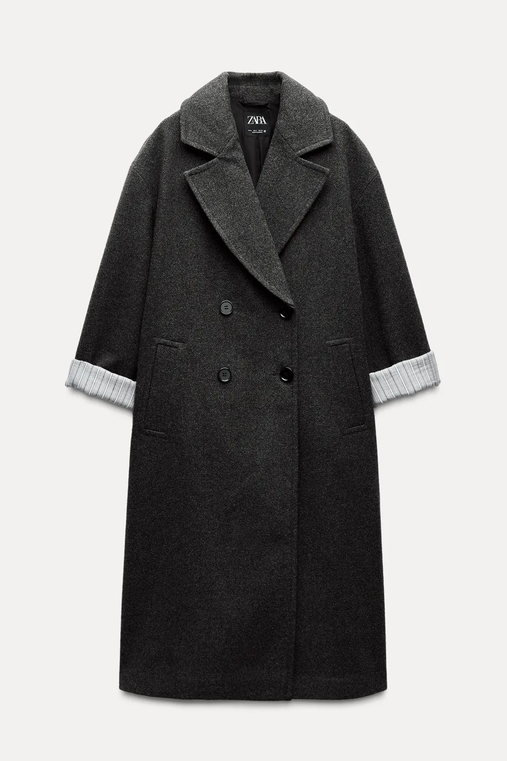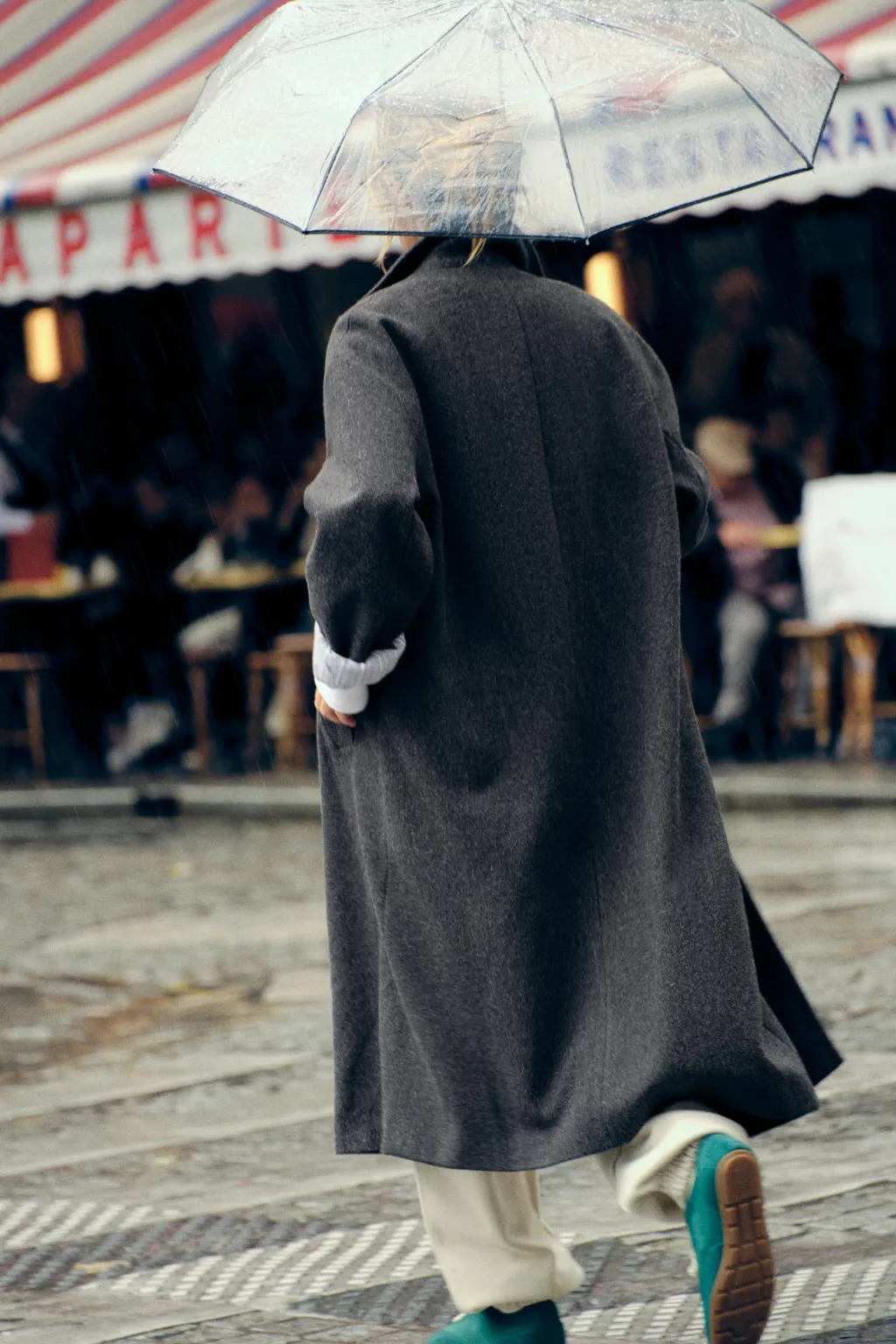 Abrigo de cuello solapa y manga larga acabada en vuelta con forro combinado a contraste. Bolsillos delanteros de vivo. Cierre frontal cruzado con botones.