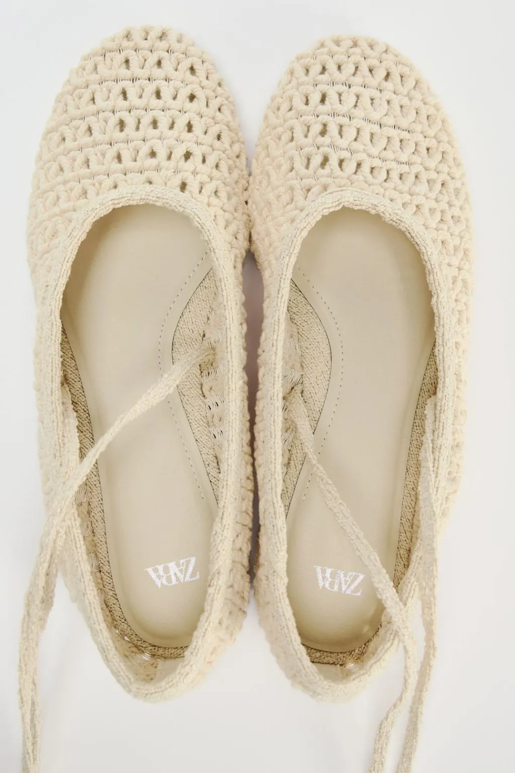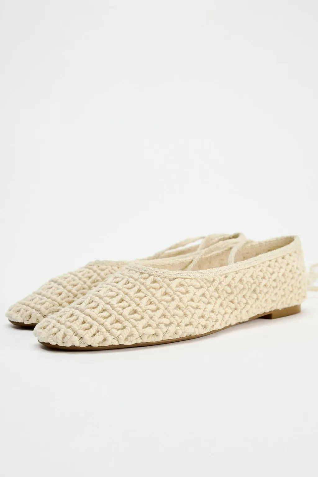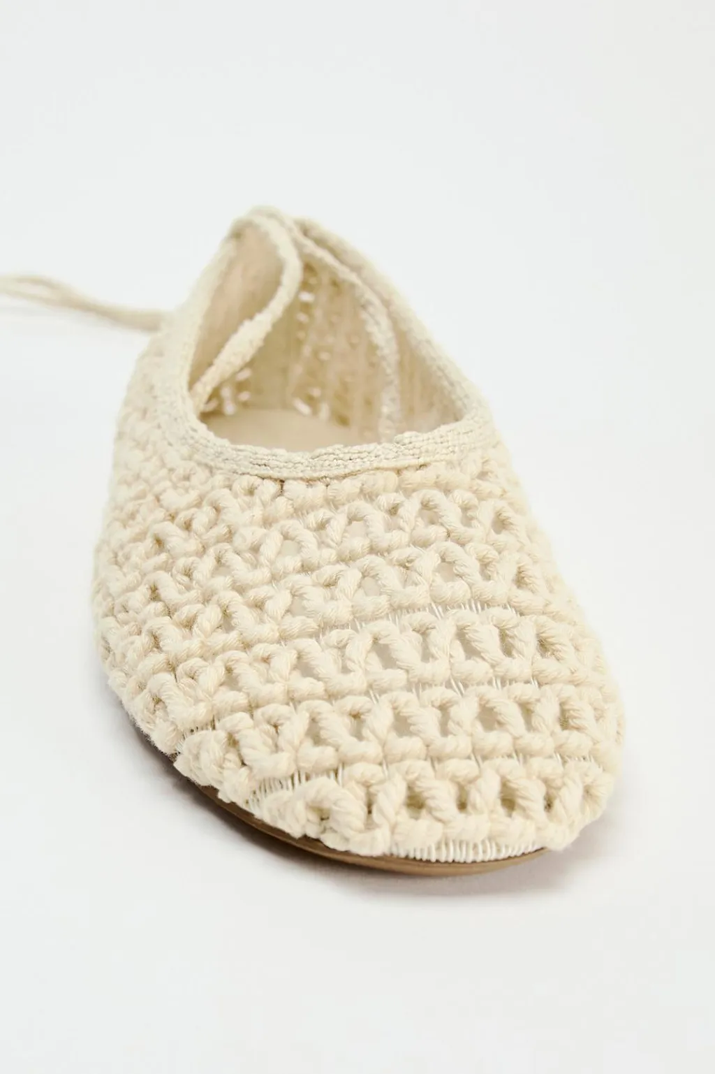 Zapato plano tipo bailarina en crochet. Cierre mediante tiras para atar en el tobillo.