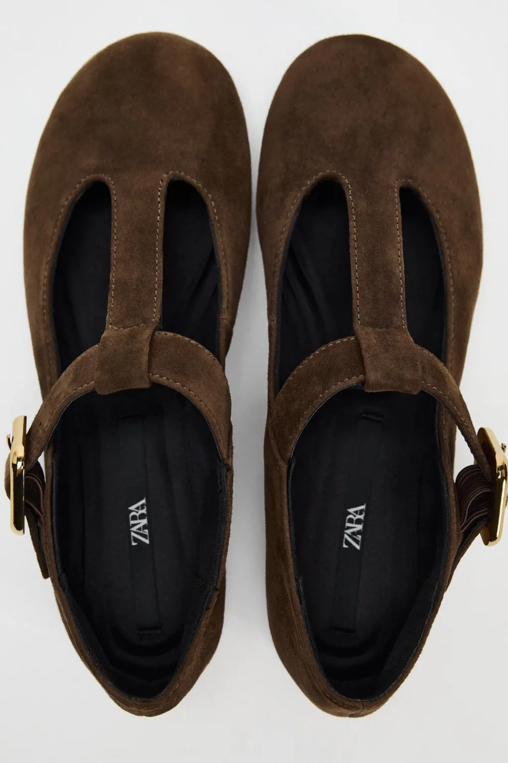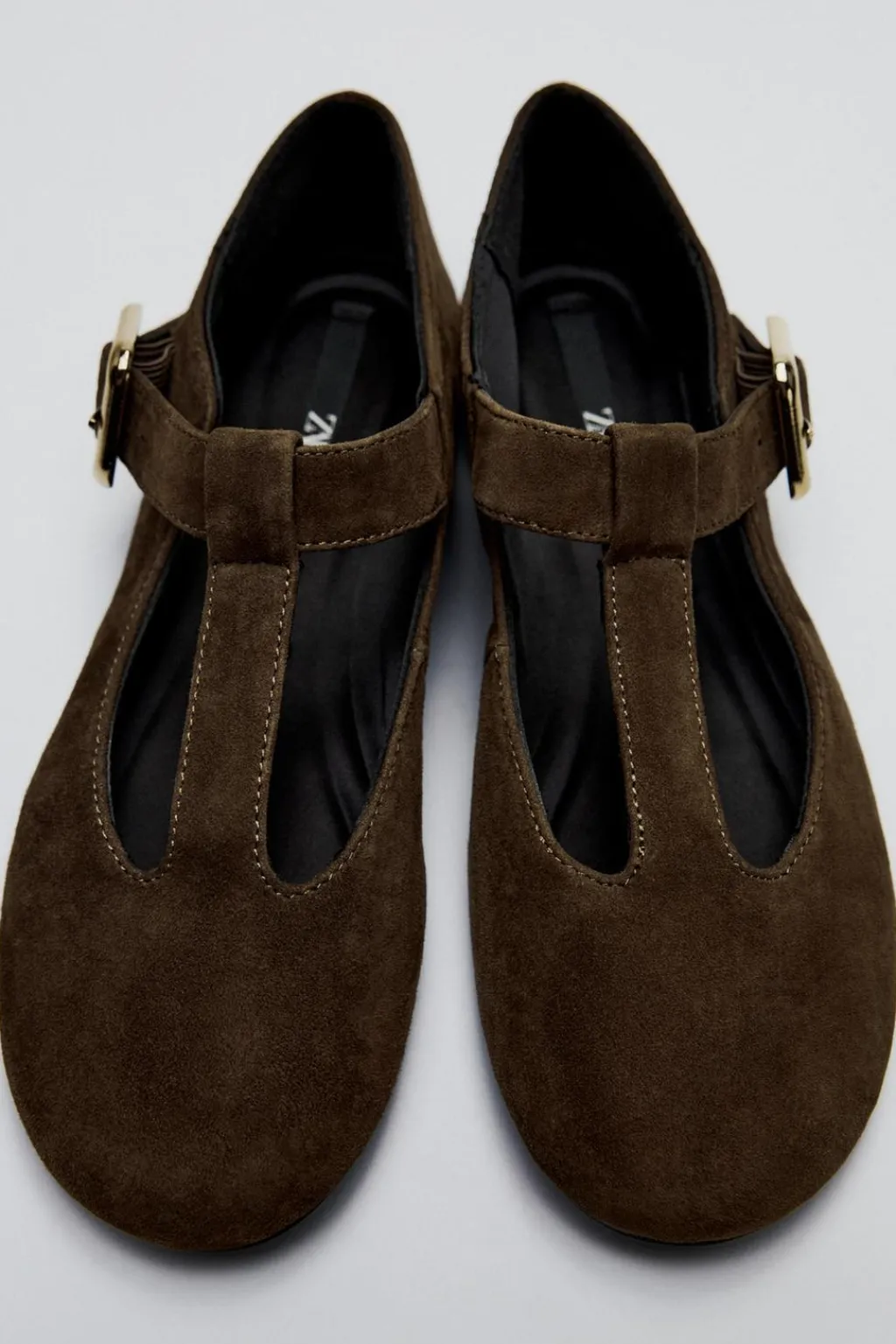 Zapato tipo bailarina en ante. Detalle de hebilla en la parte delantera. Acabado en punta redonda.