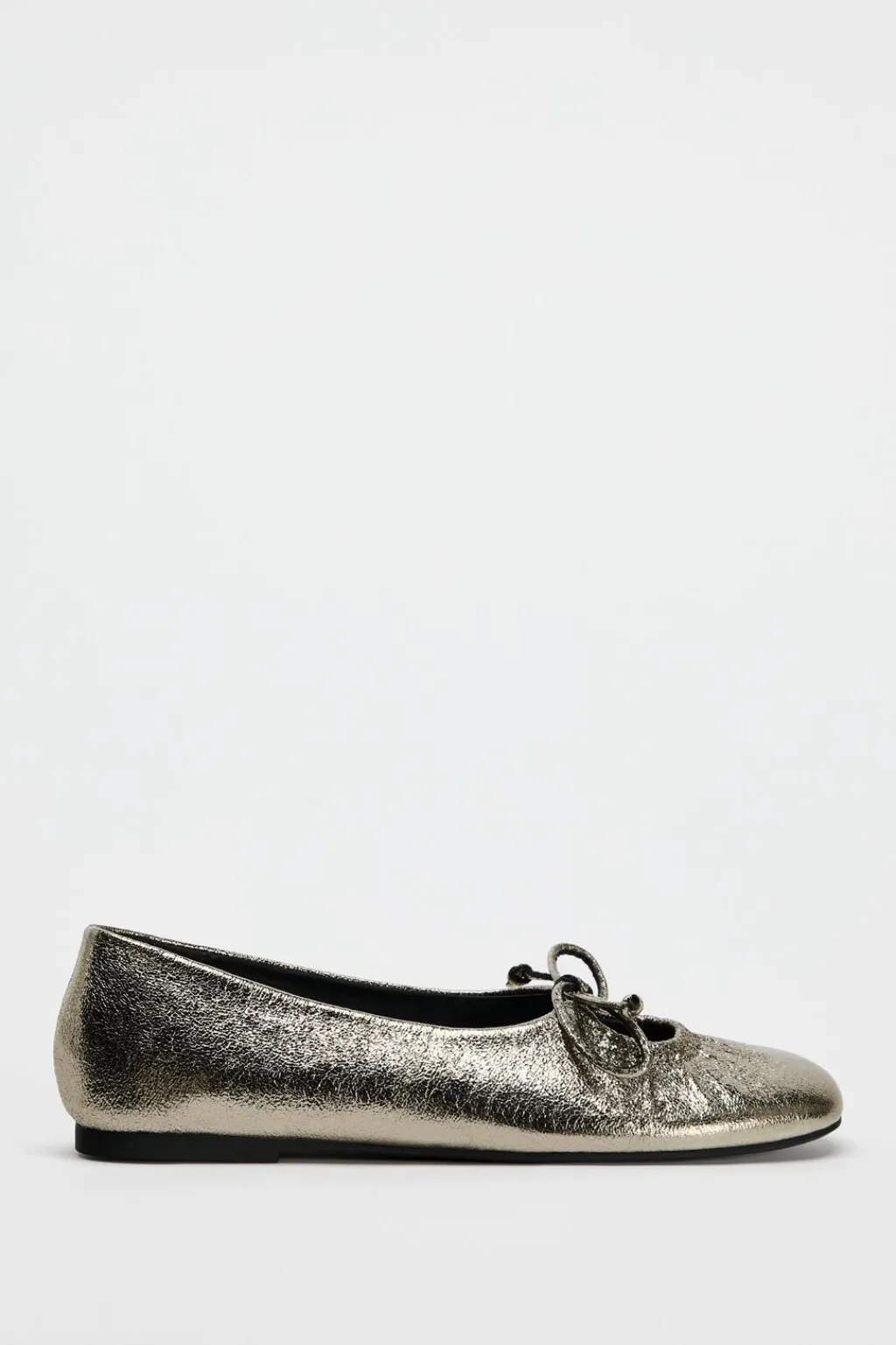 Zapato tipo bailarina efecto metalizado. Detalle de lazo en el corte. Acaban en punta redonda.