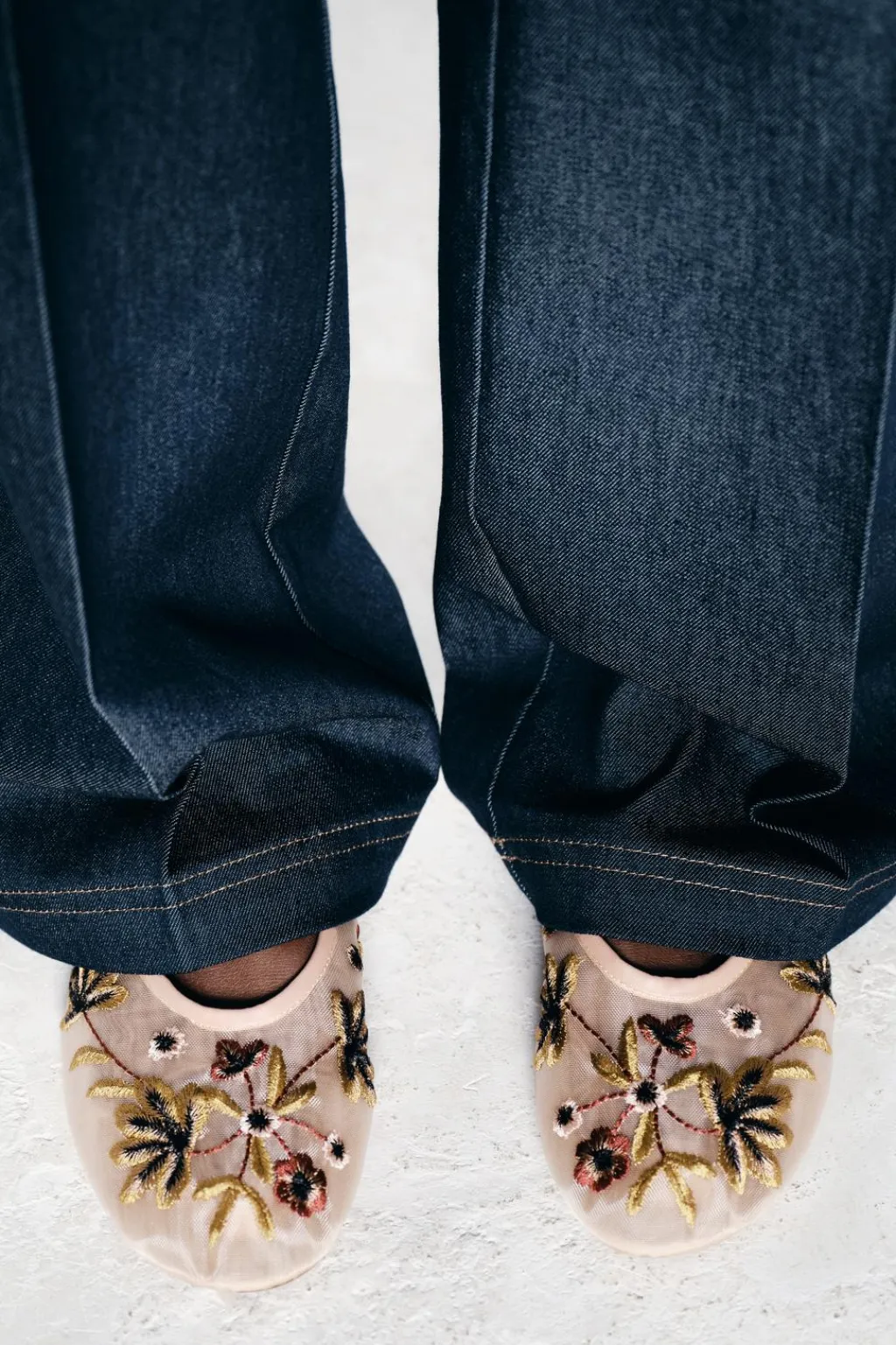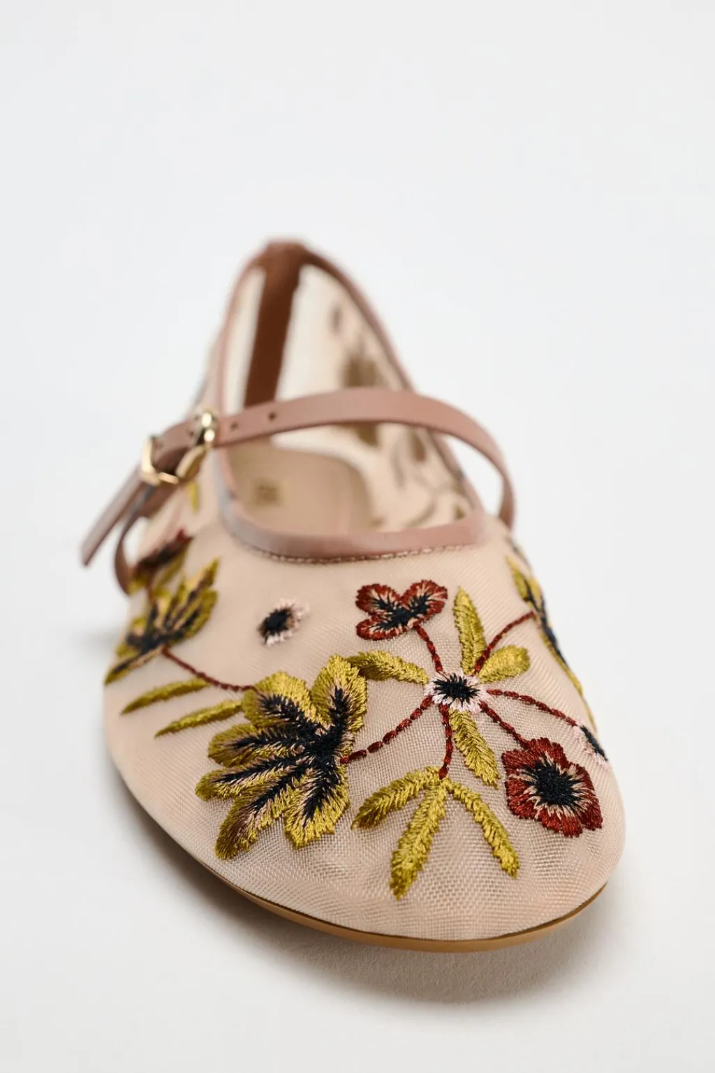 Zapata plano tipo bailarina en tejido efecto mesh con bordado de flores. Detalle de tira con hebilla en el empeine.
