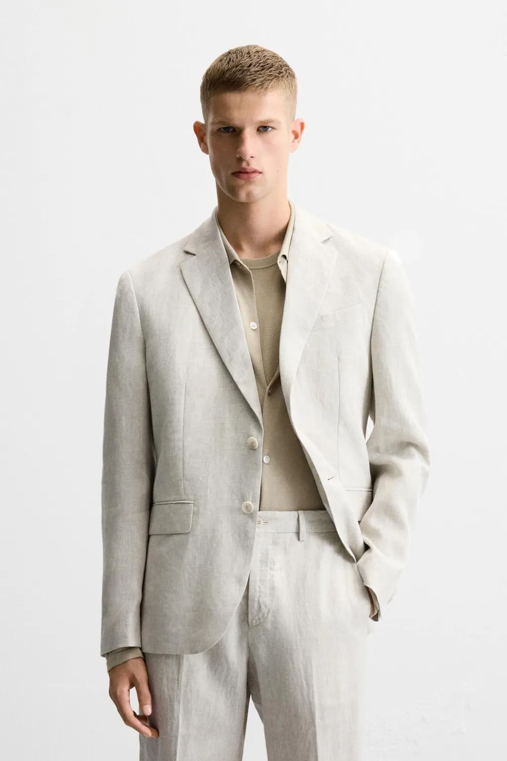 Blazer straight fit confeccionada en tejido de lino. Cuello con solapas de muesca y manga larga acabada en puño con botones. Bolsillo de vivo en pecho y bolsillos de solapa en cadera. Detalle de bolsillo interior. Bajo con aberturas en espalda. Cierre frontal de botonadura.