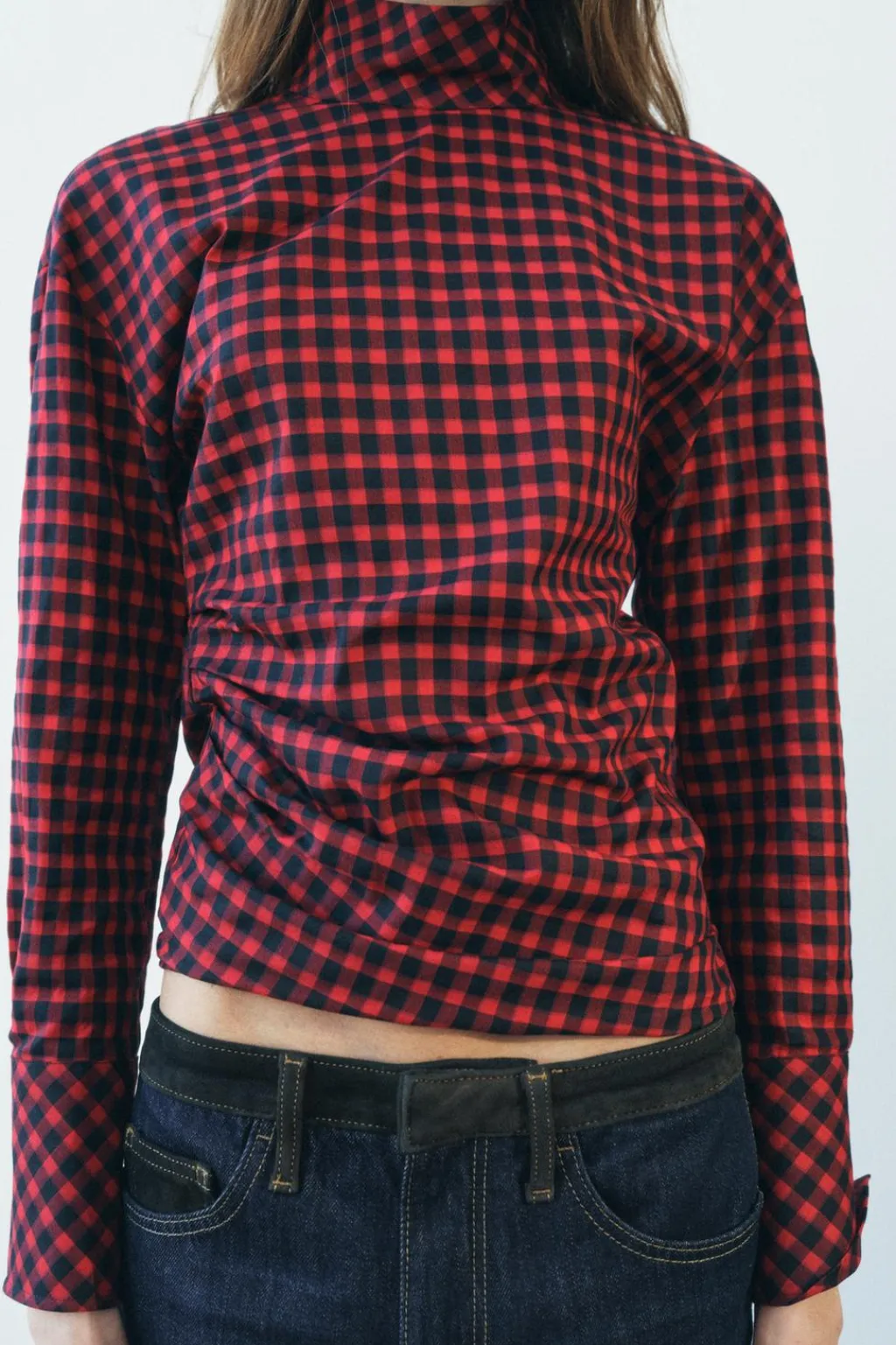 Blusa confeccionada en hilatura de algodón 100%. Cuello perkins y manga larga. Detalle de drapeado lateral. Bajo asimétrico. Cierre en espalda con botones.