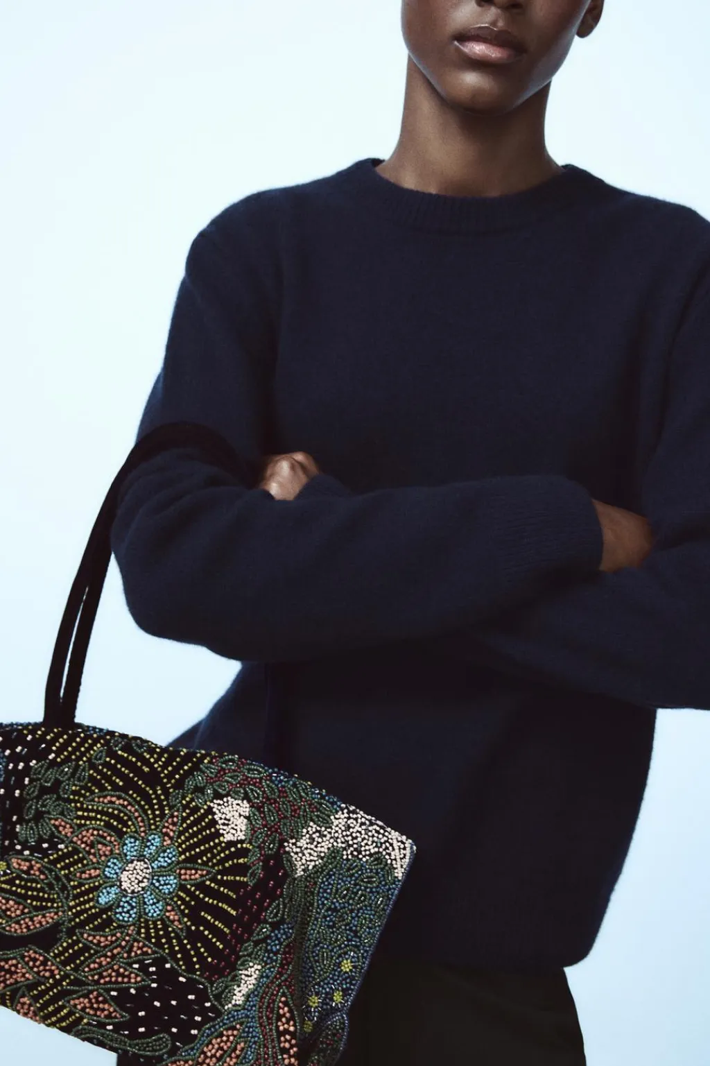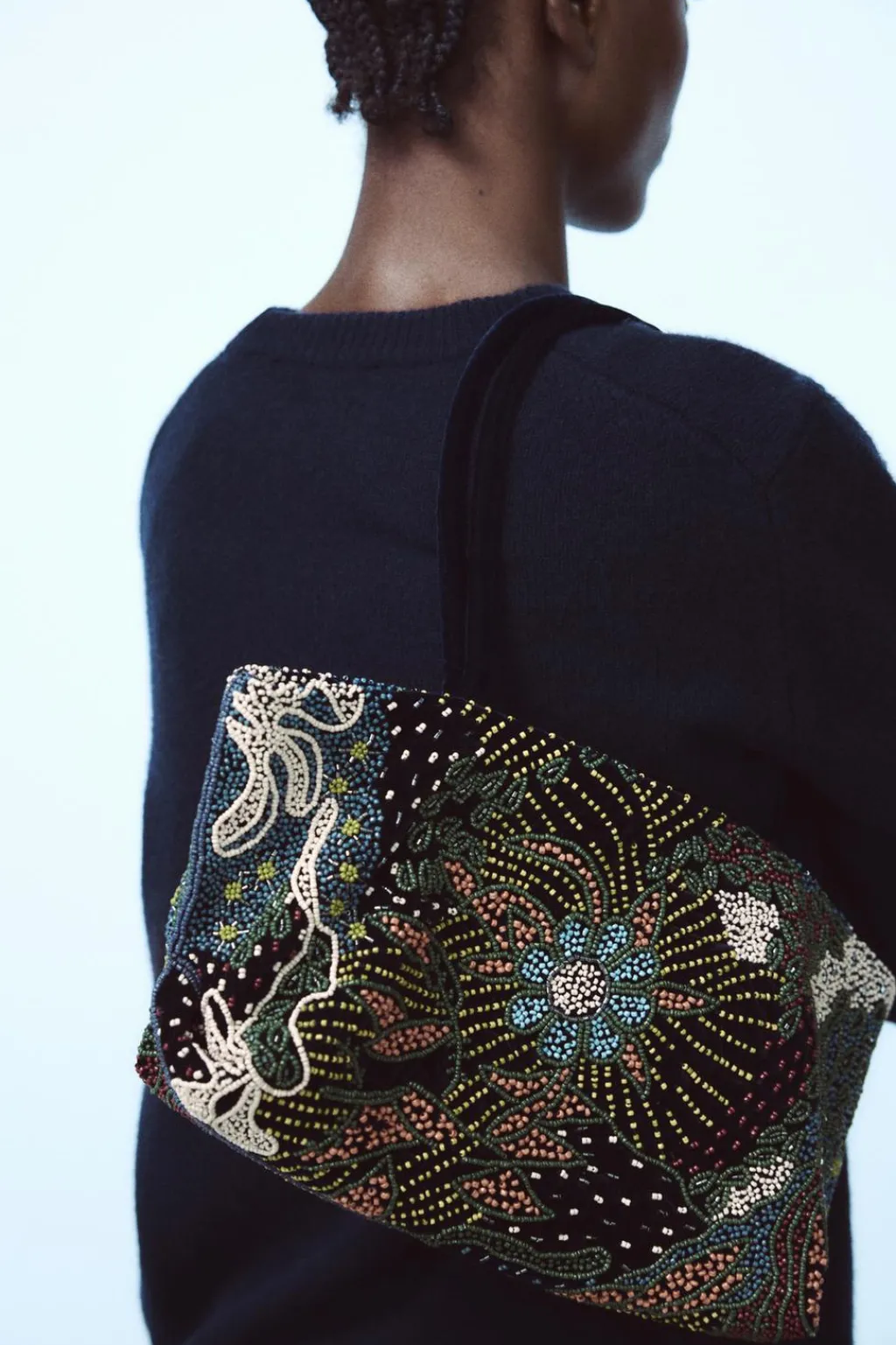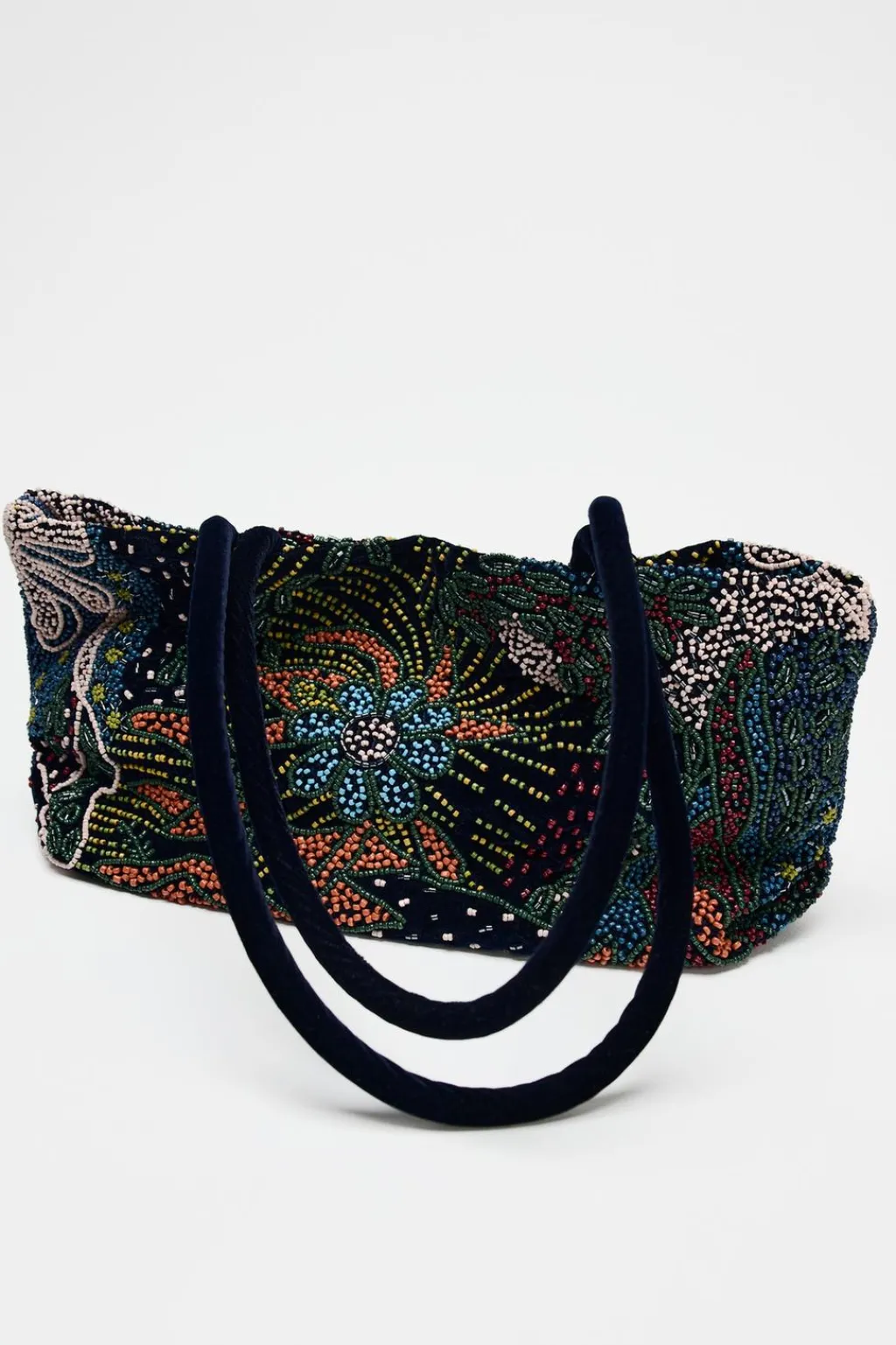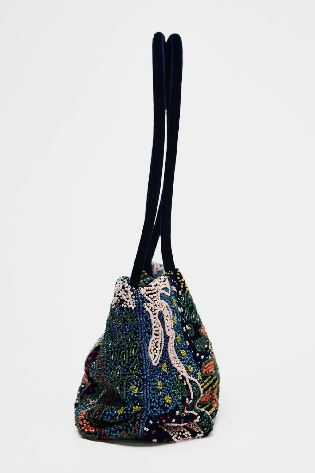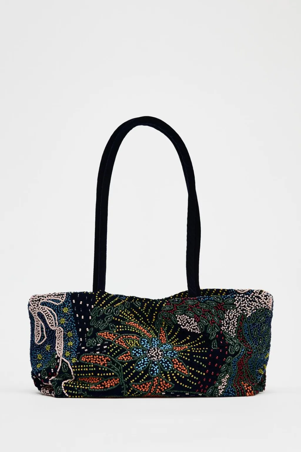 Bolso de hombro con detalle de abalorios en el cuerpo. Doble asa de hombro en efecto terciopelo. Cierre mediante clip imantado. Bolsillo interior.