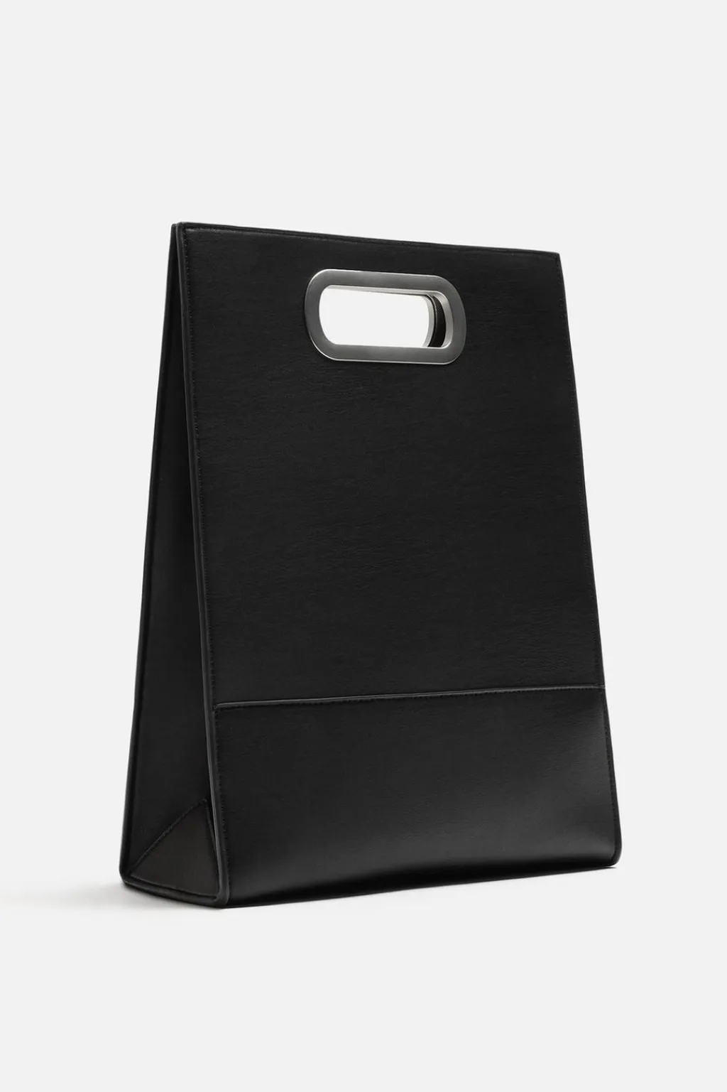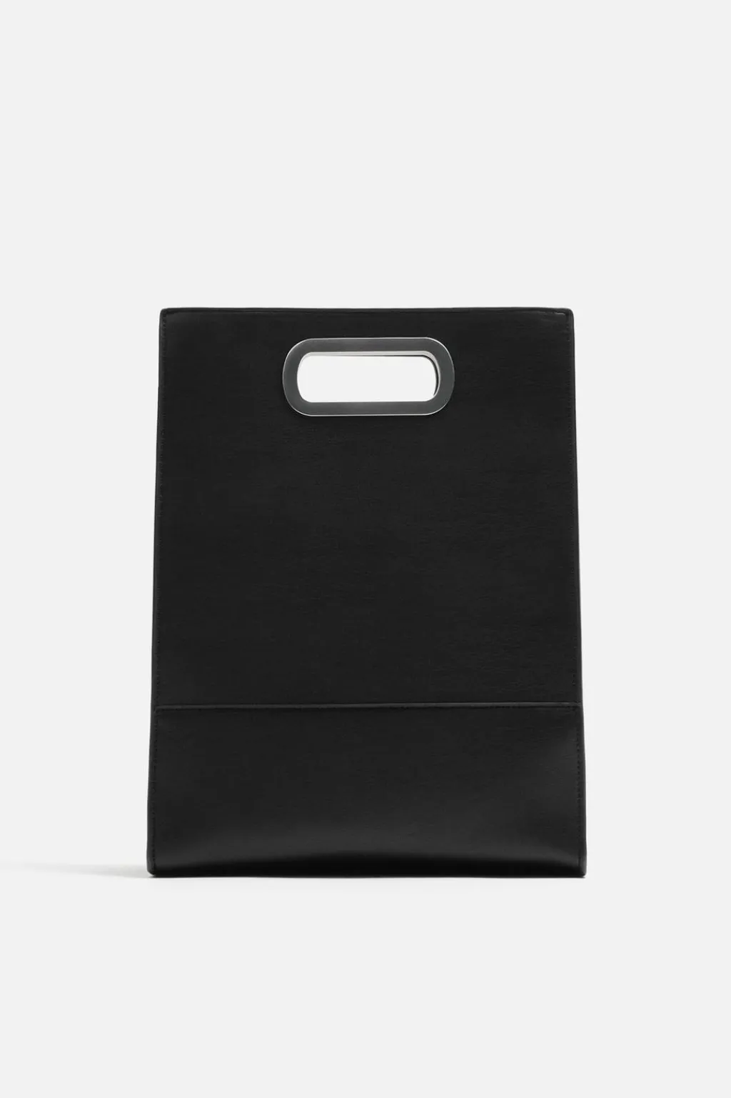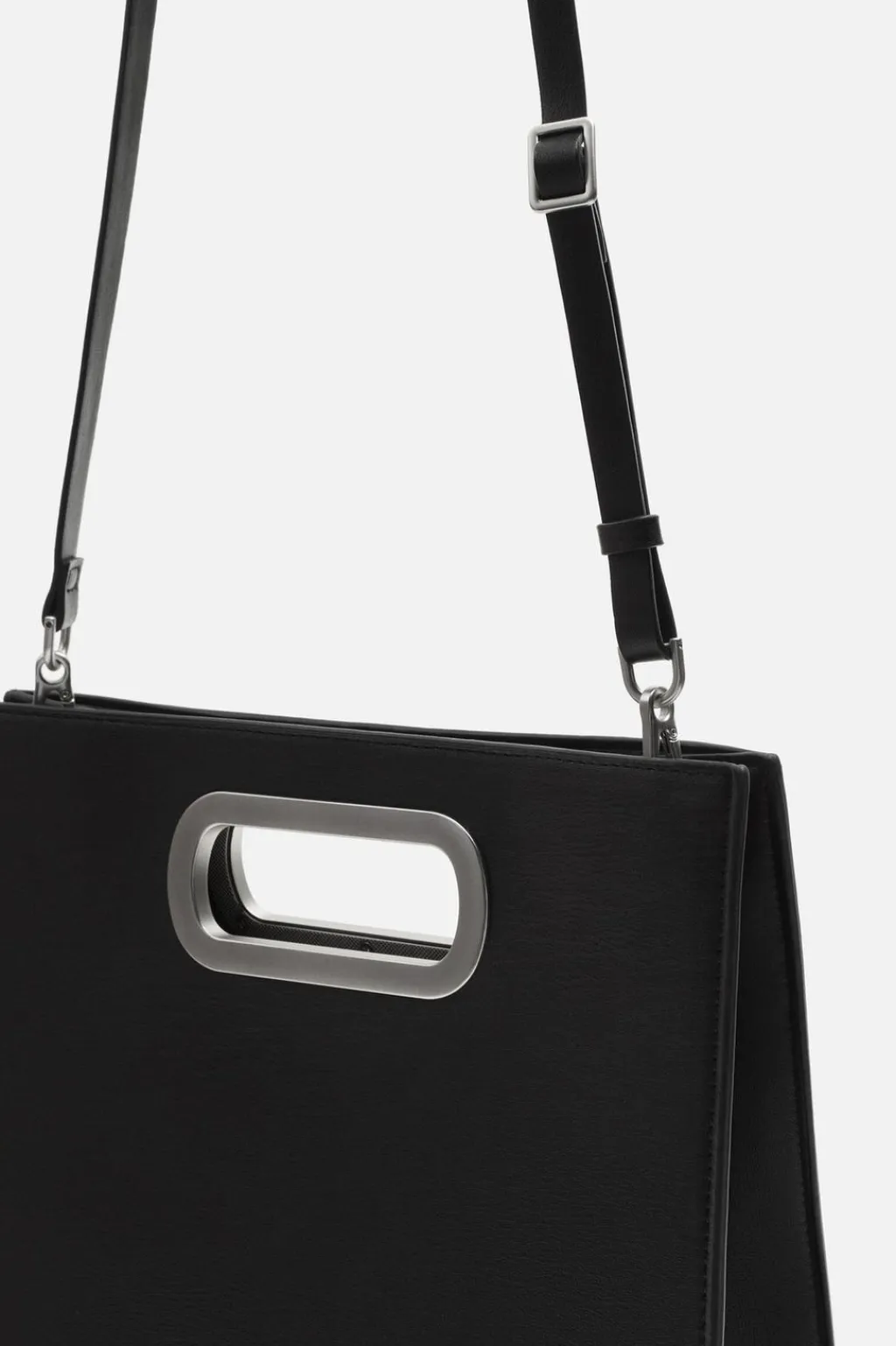 Bolso de mano semirígido. Amplio compartimento principal. Dos pequeños bolsillos interiores auxiliares. Asa de mano con detalle metálico. Asa de hombro removible y ajustable.