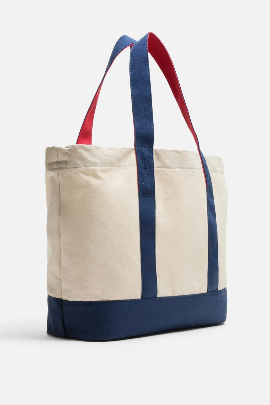 Bolso tipo shopper fabricado en tejido de algodón. Compartimento principal sin cierre. En su interior cuenta con un bolsillo con cierre mediante cremallera. Dispone de dos asas de mano y un asa de hombro ajustable y extraíble.