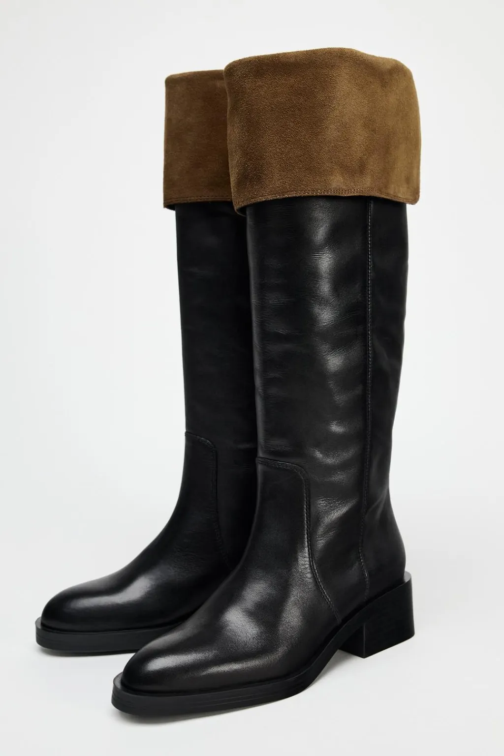 Zapato tipo bota en piel. Detalle de vuelta en contraste. Acabada en punta redonda.