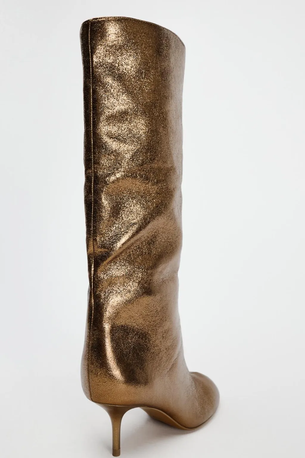 Zapato tipo bota en efecto metalizado. Caña alta y ancha. Detalle de pespunte en el corte. Tacón kitten y punta redonda.