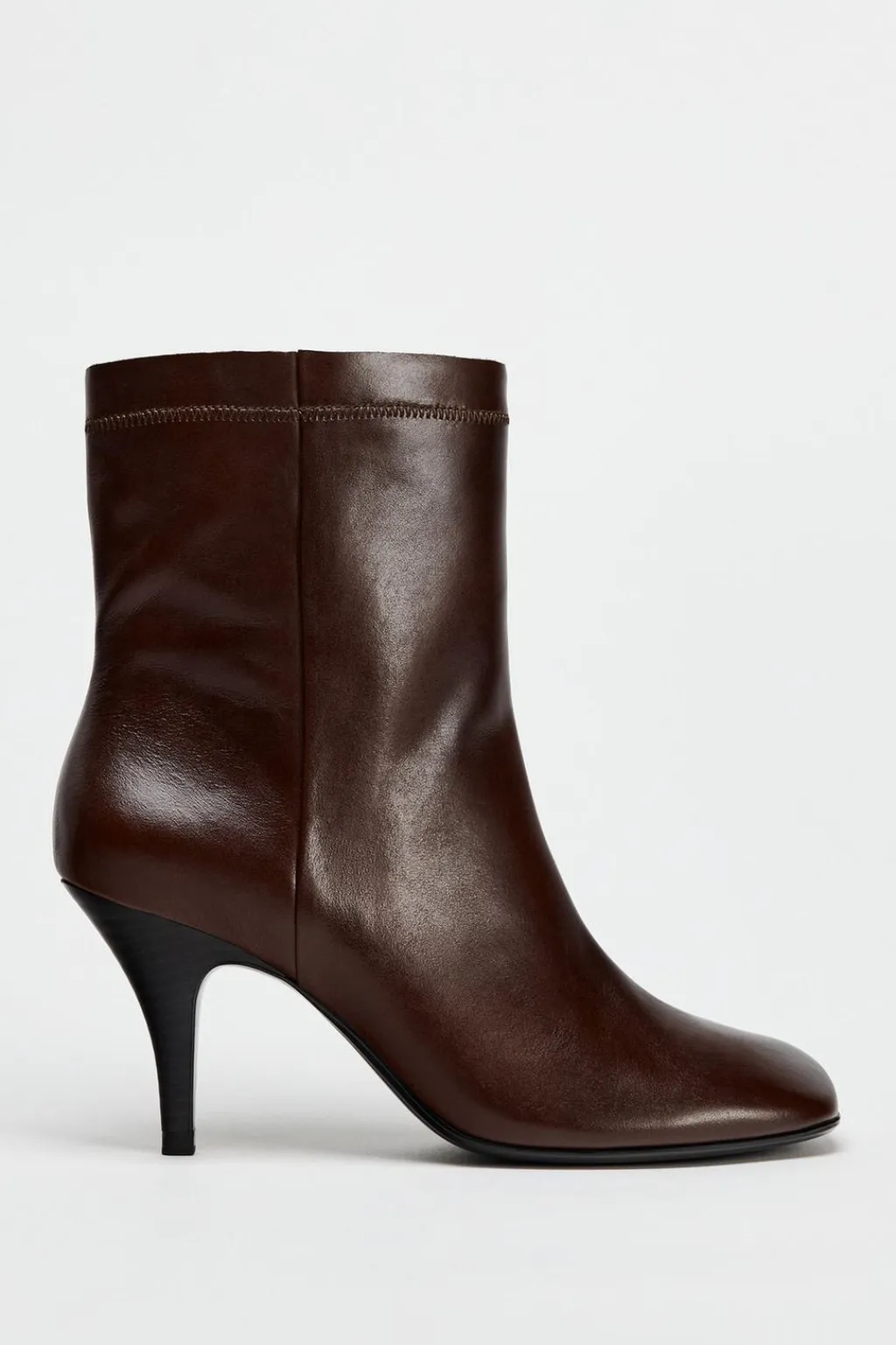 Zapato tipo botín en piel. Tacón fino. Detalle de pespunte en el corte. Acabado en punta cuadrada.