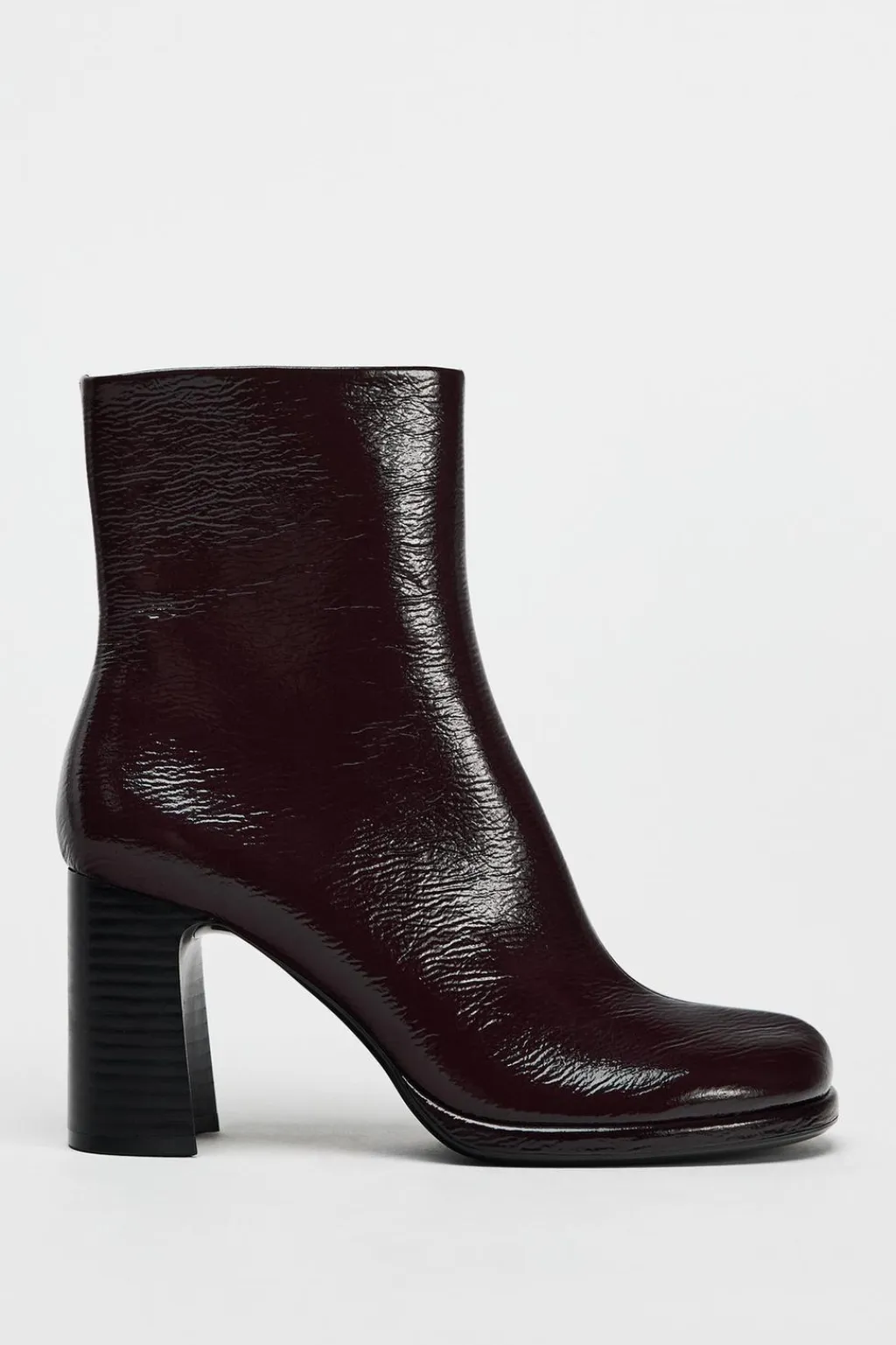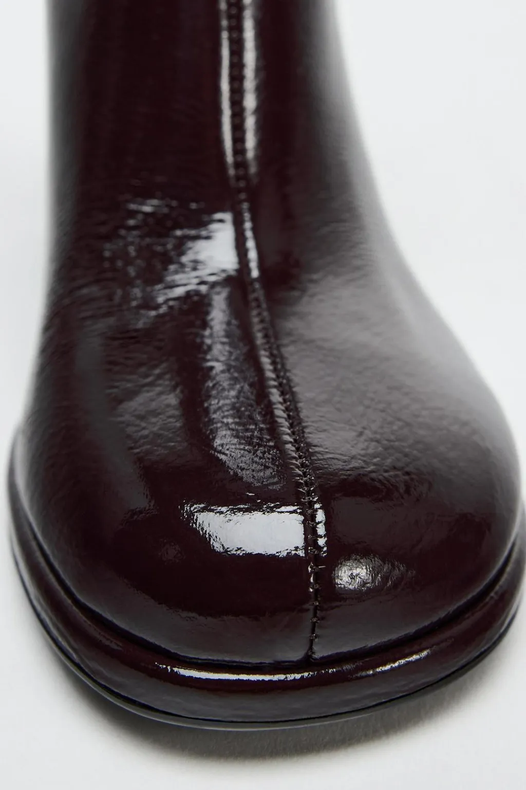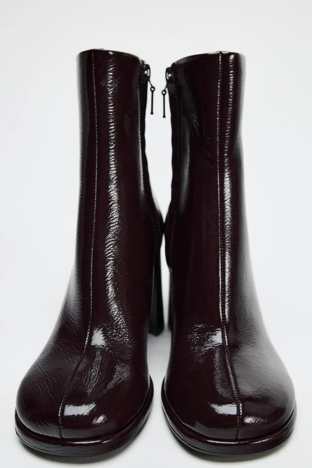 Zapato tipo botín con tacón ancho. Efecto acharolado. Detalle de pespunte en el corte. Cierre mediante cremallera lateral. Acabado en punta redonda.