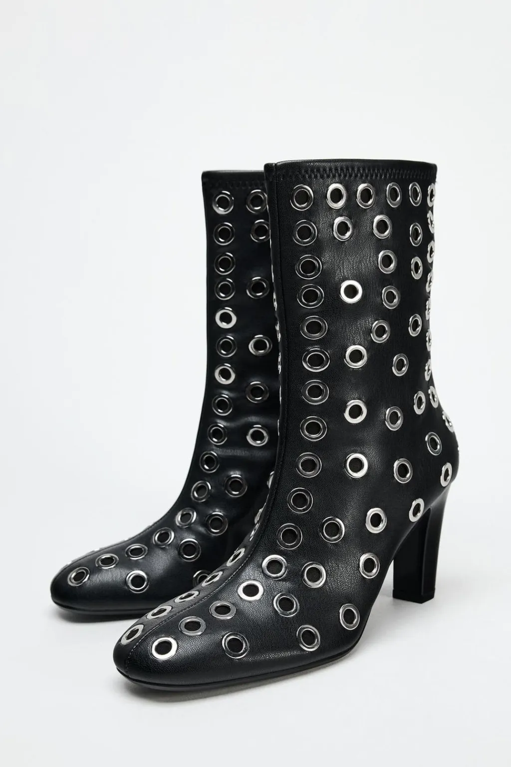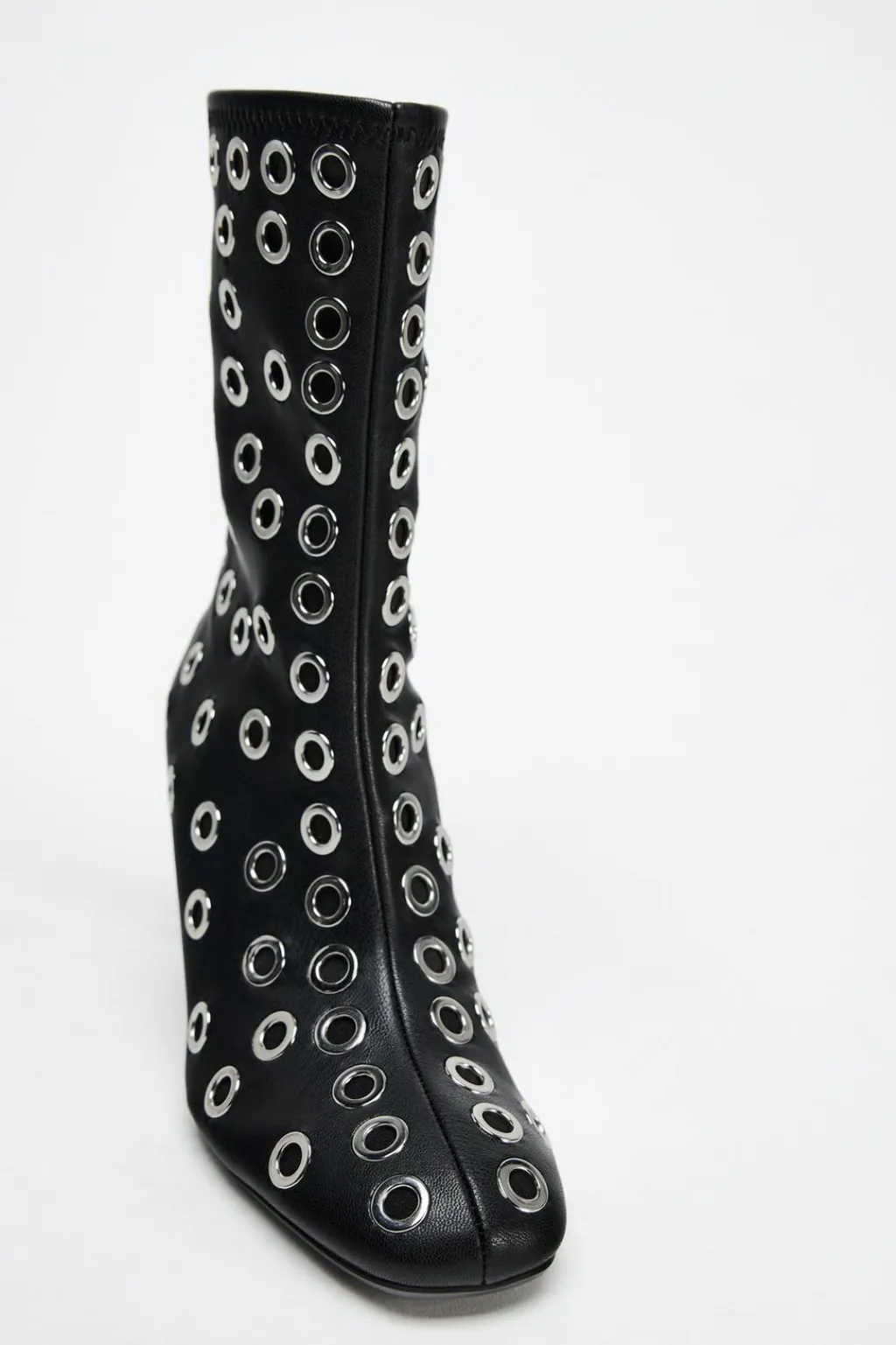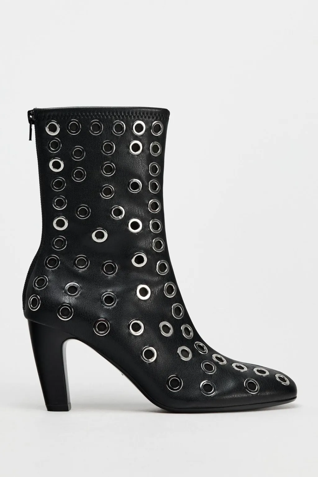 Zapato tipo botín con tacón. Detalles de ojales metálicos en el cuerpo. Cierre mediante cremallera trasera.