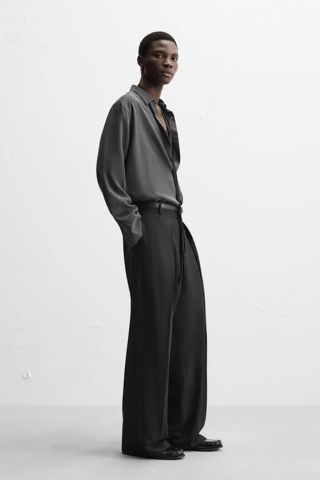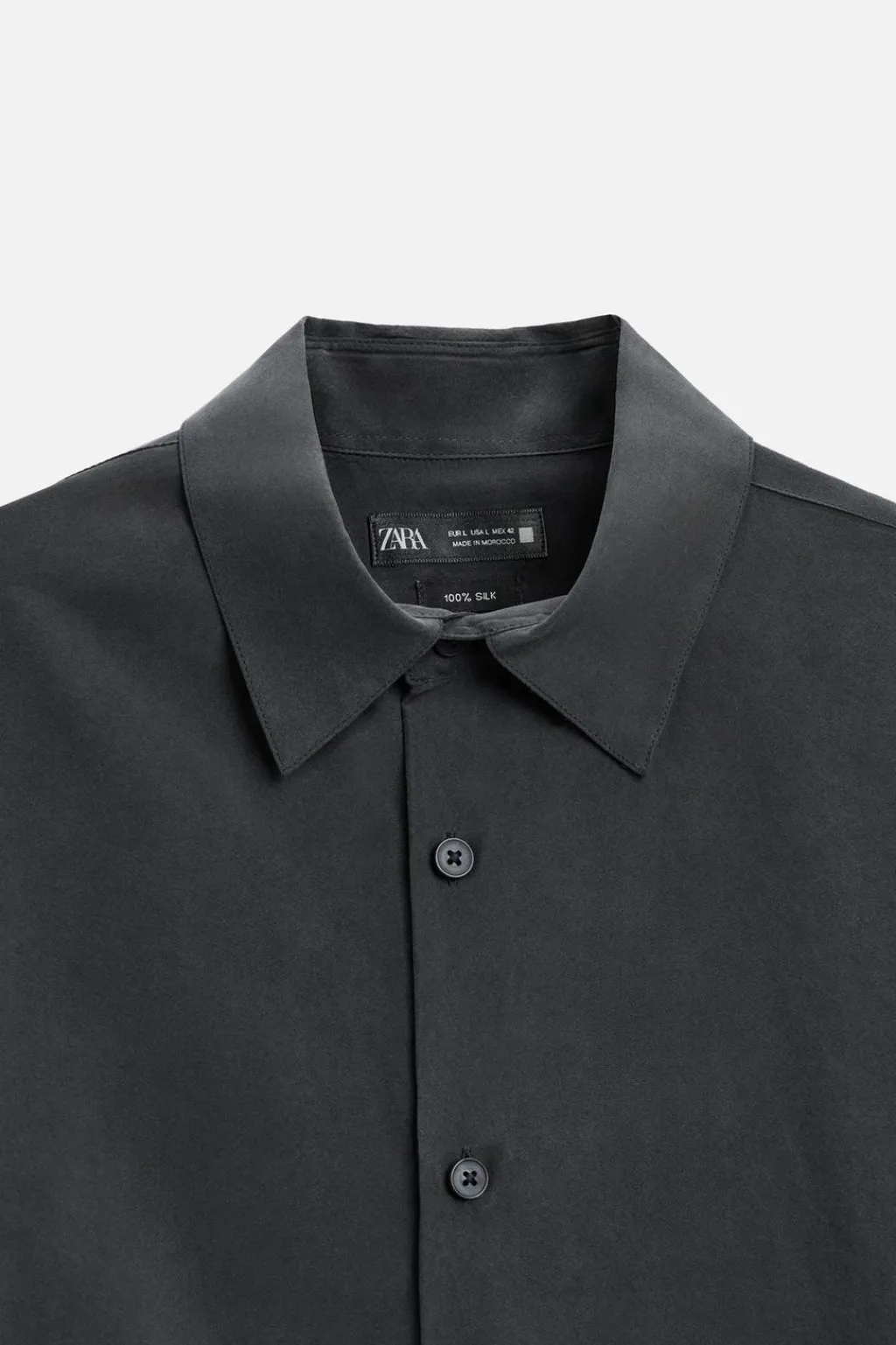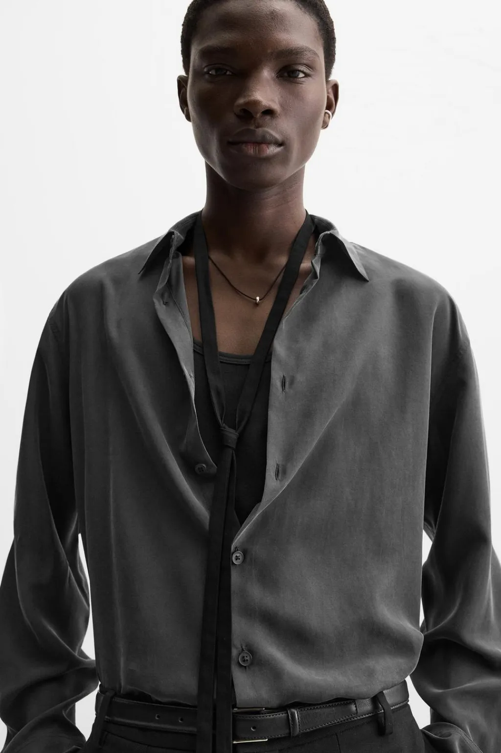 Camisa relaxed fit confeccionada en tejido de seda. Cuello solapa y manga larga acabada en puño con botón. Cierre frontal de botonadura.
