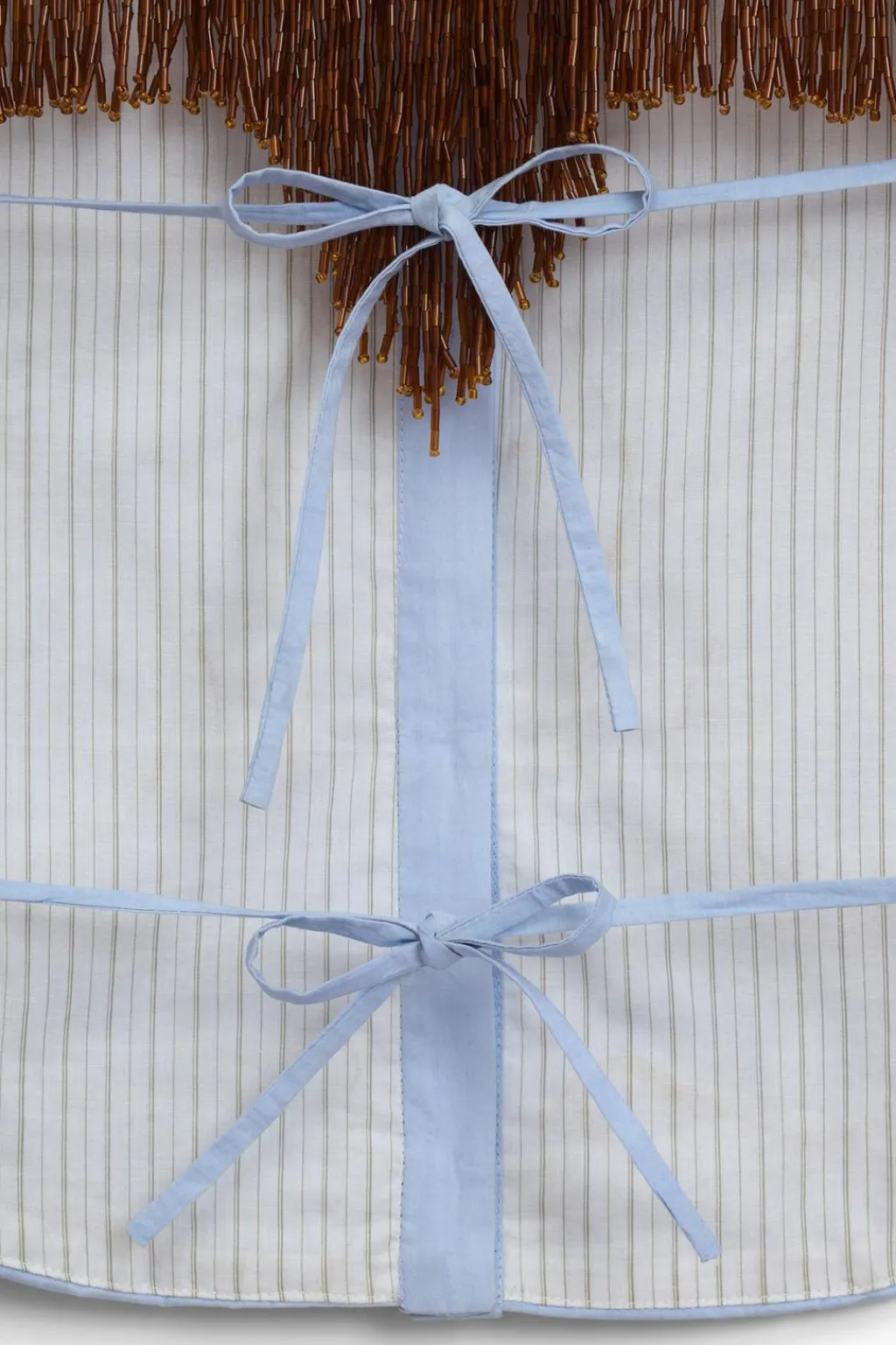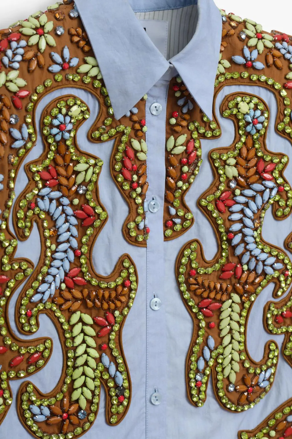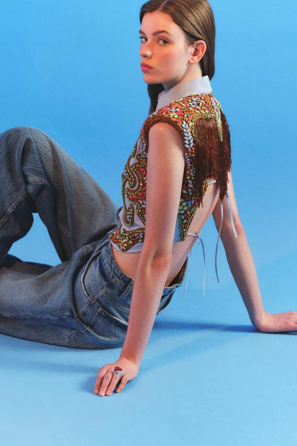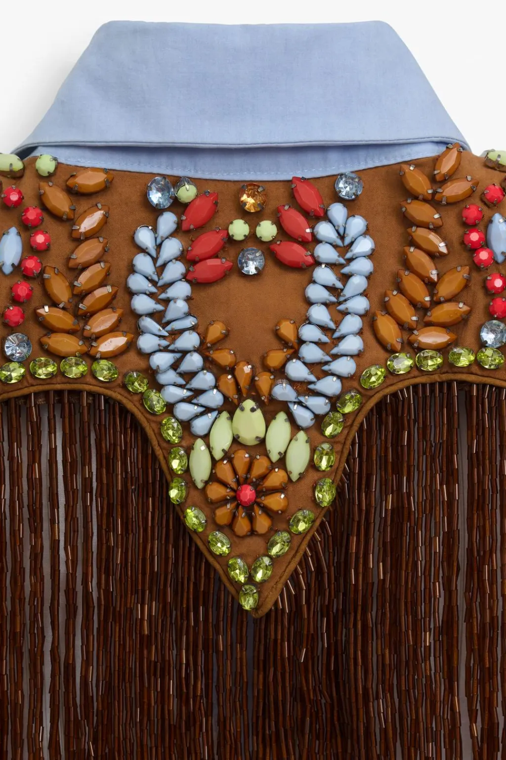 Camisa corta de cuello solapa y manga sisa con hombreras. Se ha elegido una base de popelín para atenuar el trabajo tan detallado. Apliques de abalorios en tonos ocre, sobre una base de algodón a contraste que equilibra el brillo general de la prenda. La espalda se ha dejado descubierta, destacando en ella una pieza de flecos en color ámbar. Esta pieza ha sido forrada con un algodón a rayas tomando como referencia los códigos de la camisería masculina. Cierre frontal con botones.