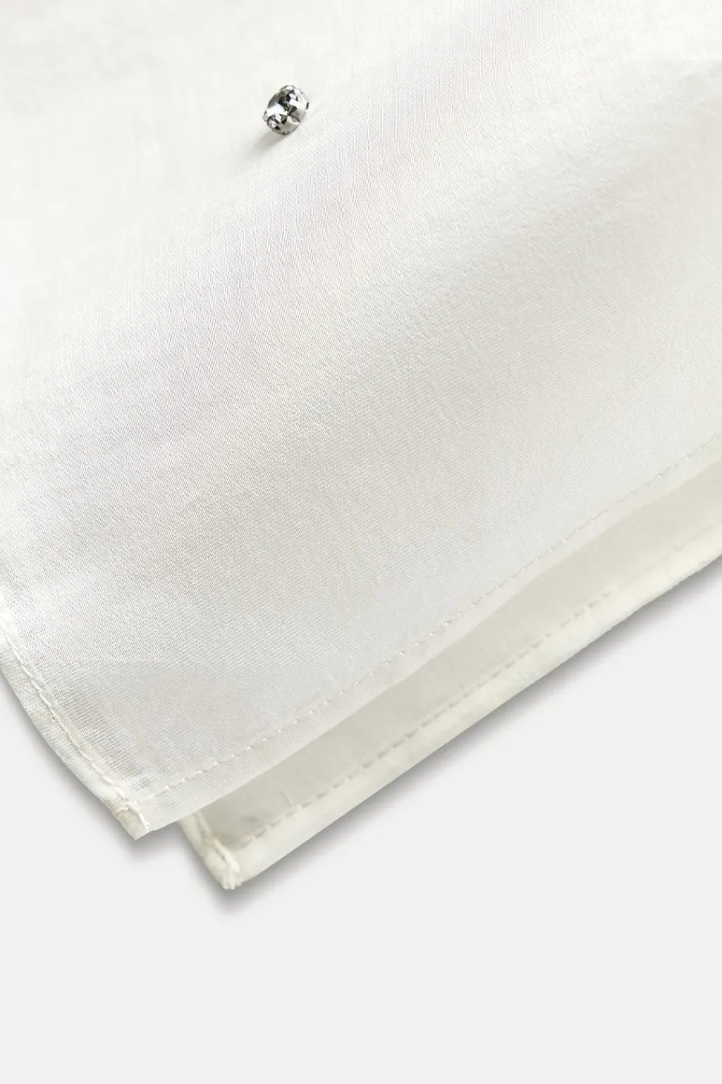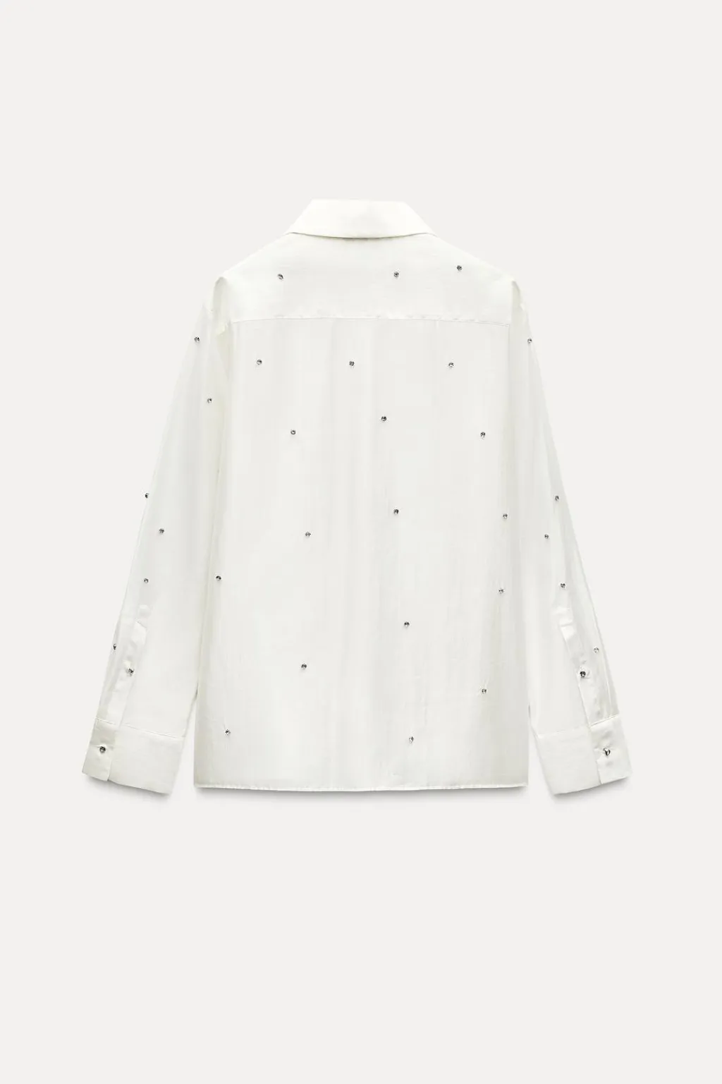 Camisa confeccionada en hilatura con mezcla de lyocell. Cuello solapa y manga larga acabada en puño. Detalle de bordados con aplicación de joyas. Bajo recto con aberturas laterales. Cierre frontal con botones ocultos por solapa.