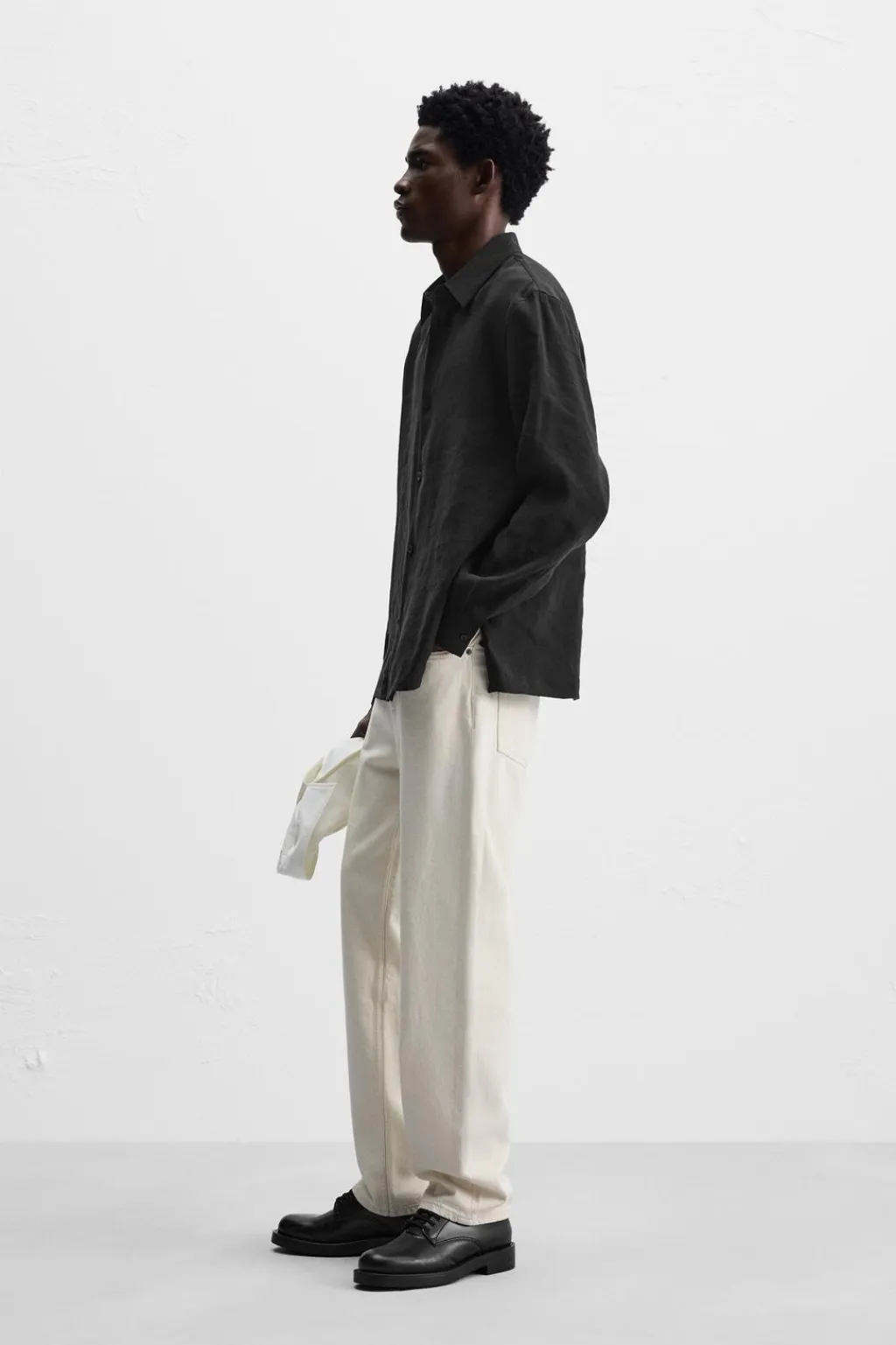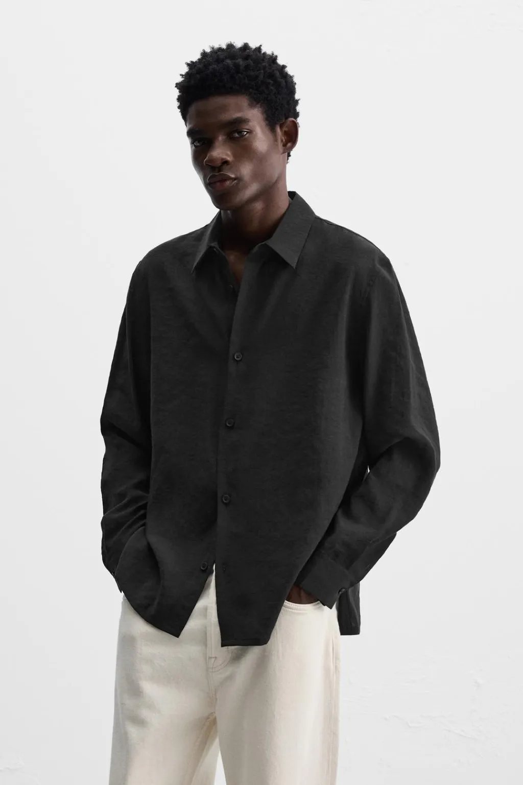 Camisa relaxed fit confeccionada en tejido con mezcla de modal. Cuello solapa y manga larga acabada en puño con botón. Bajo ajustable con botones en laterales. Cierre frontal de botonadura.