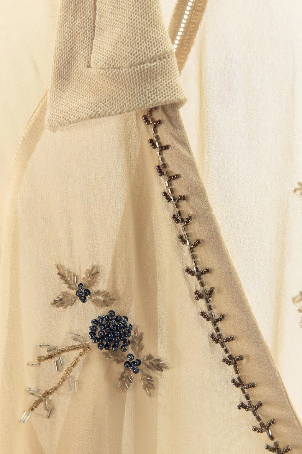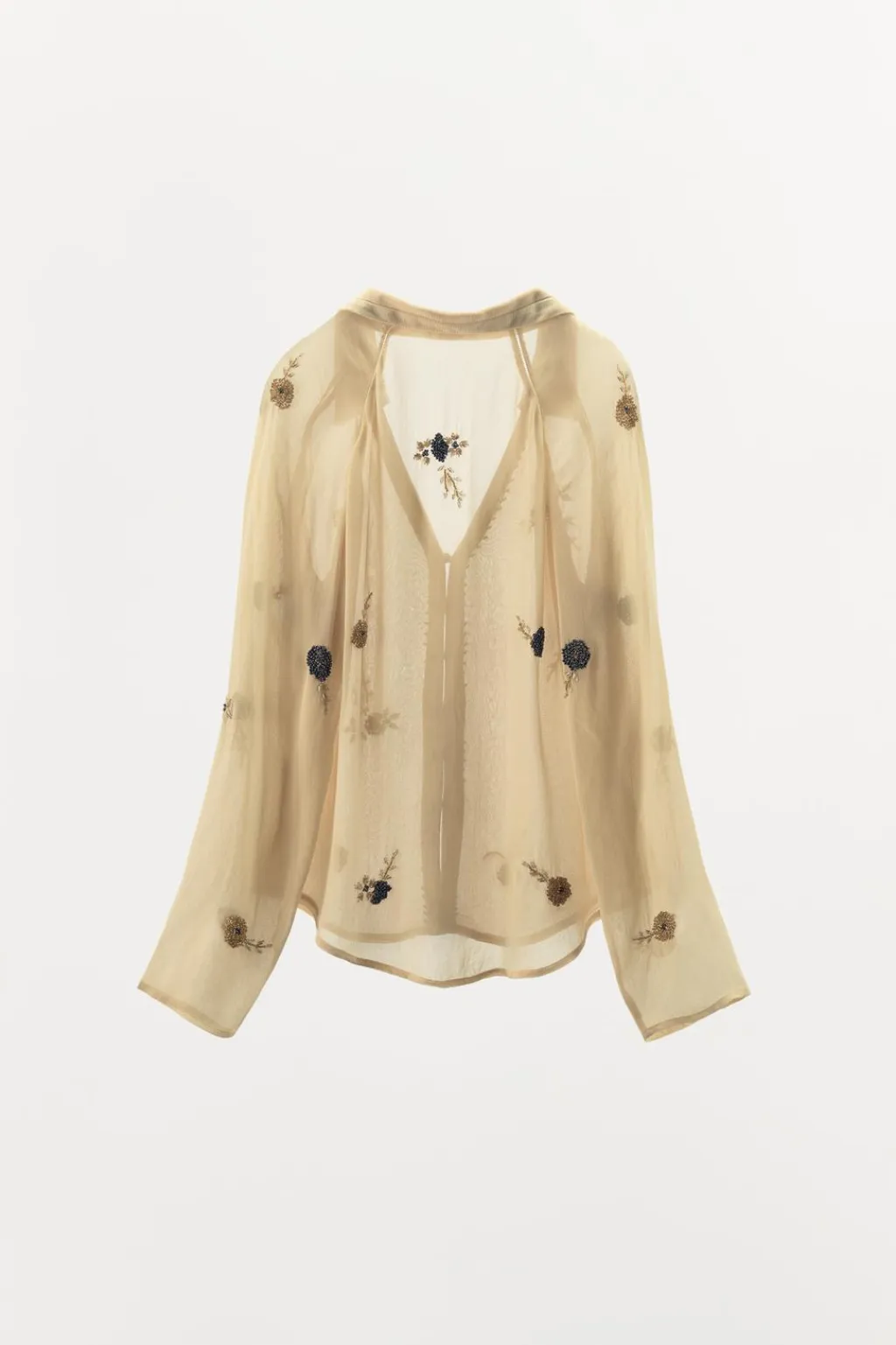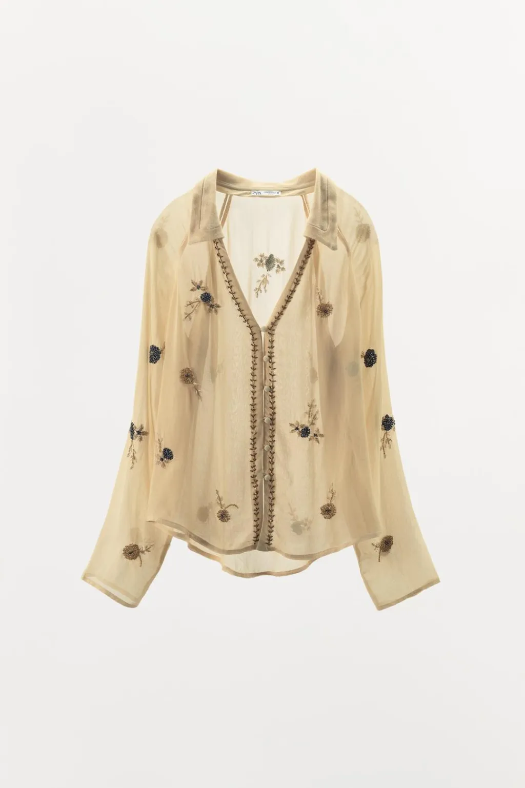 Camisa semitransparente confeccionada en hilatura de viscosa 100%. Cuello solapa en distinto tejido con escote pico y manga larga. Detalle de entredoses a tono y aplicación de abalorios combinados a contraste. Bajo asimétrico. Cierre frontal con botones forrados.