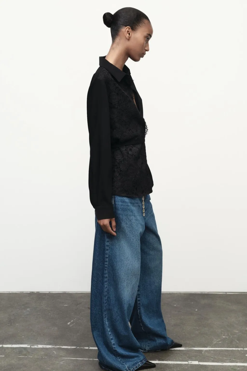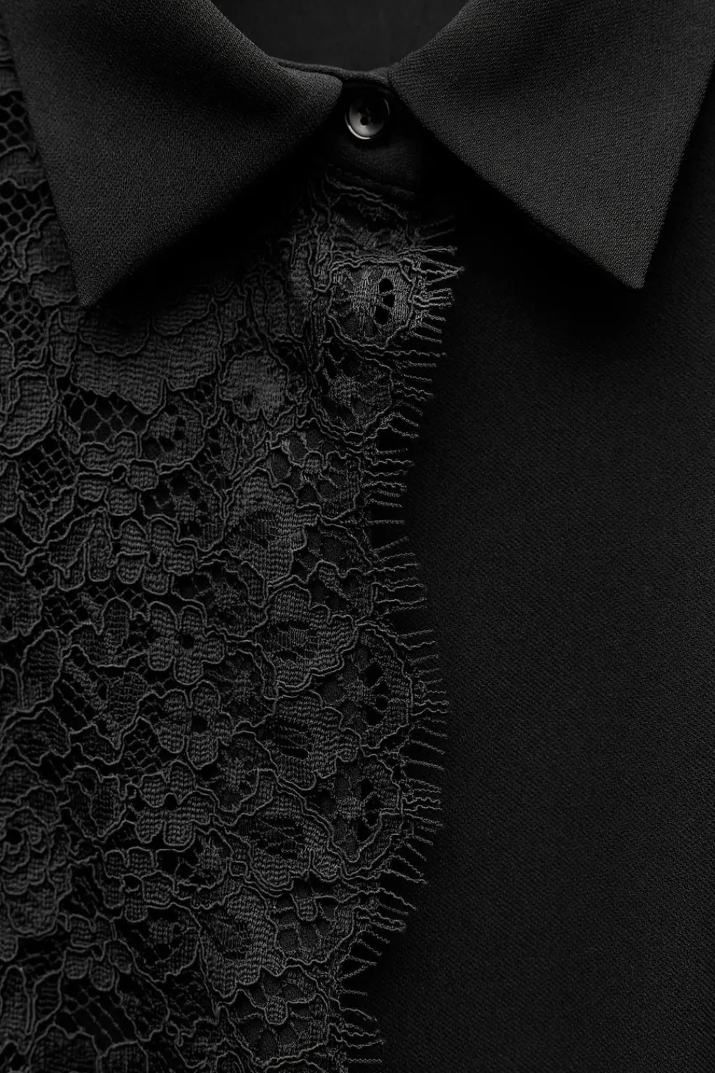 Camisa de cuello solapa y manga larga. Detalle de encaje delantero y cinturón fino. Cierre frontal con botones ocultos por solapa.